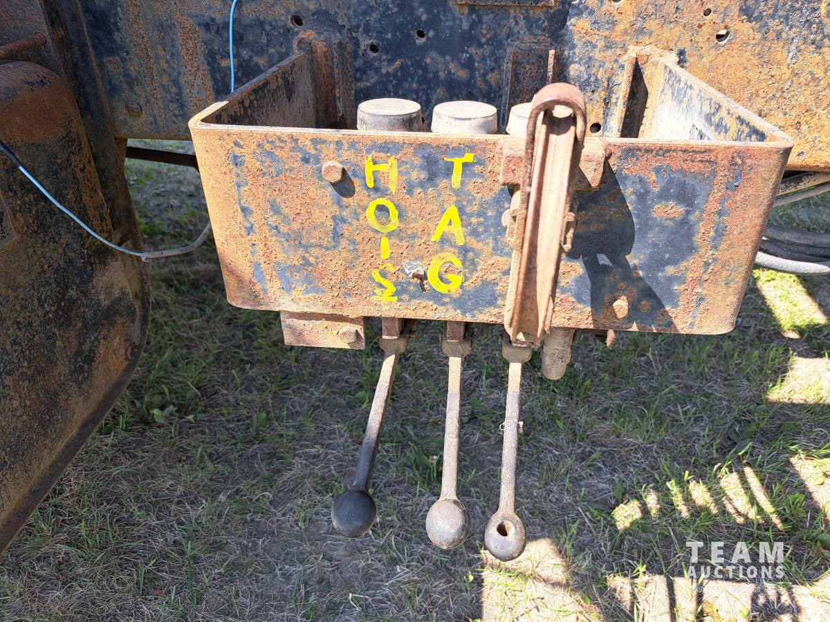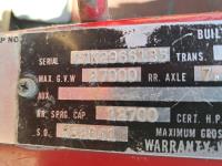 Chrsyler 361 cu in V8 gas engine, engine brake, 5 speed manual transmission, 2 speed axle, 15 ft box, hoist, roll tarp, 2 cylinder hoist, drill fill hydraulic outlets, spring suspension, 7,000 lb front axle, 20,000 lb rear axles, 146 inch WB, 10.00-20 front tires, 9.00-20 rear tires