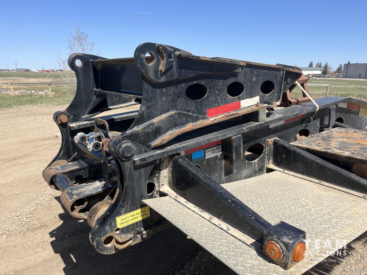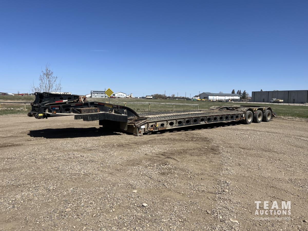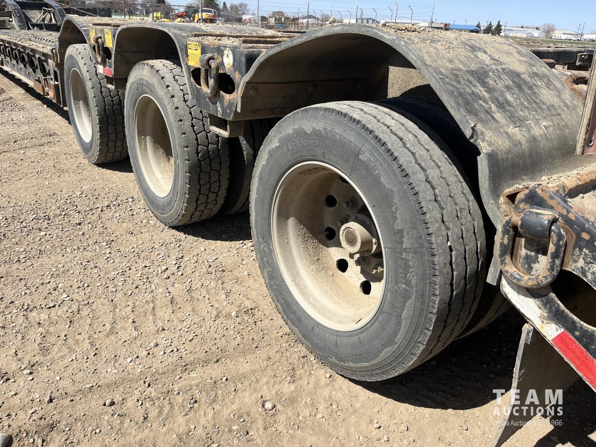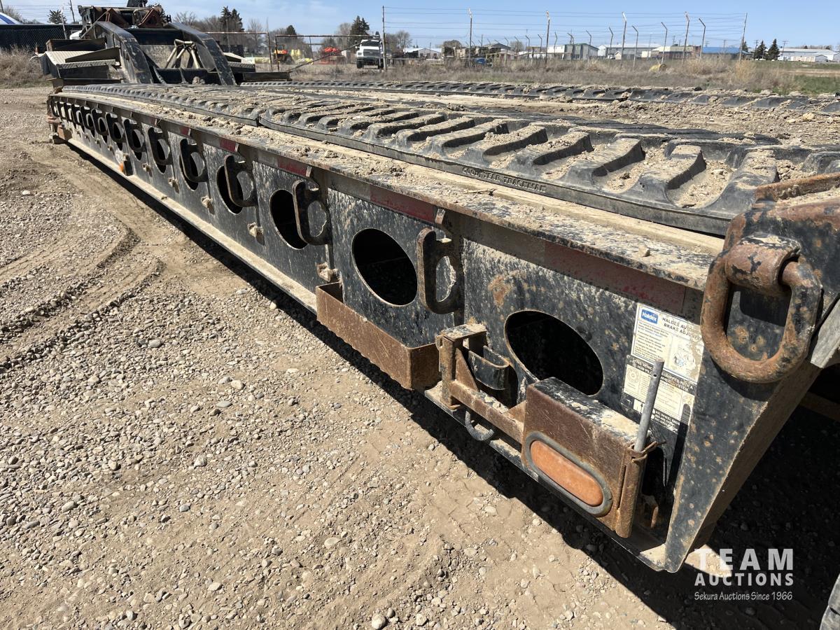 60 ton, 10 ft wide, 26 ft deck boards, 31 ft overall deck length from front rear, mechanical detach, fold down TRI/A extension, air ride suspension, beavertail, aluminum wheels, 275/70R22.5