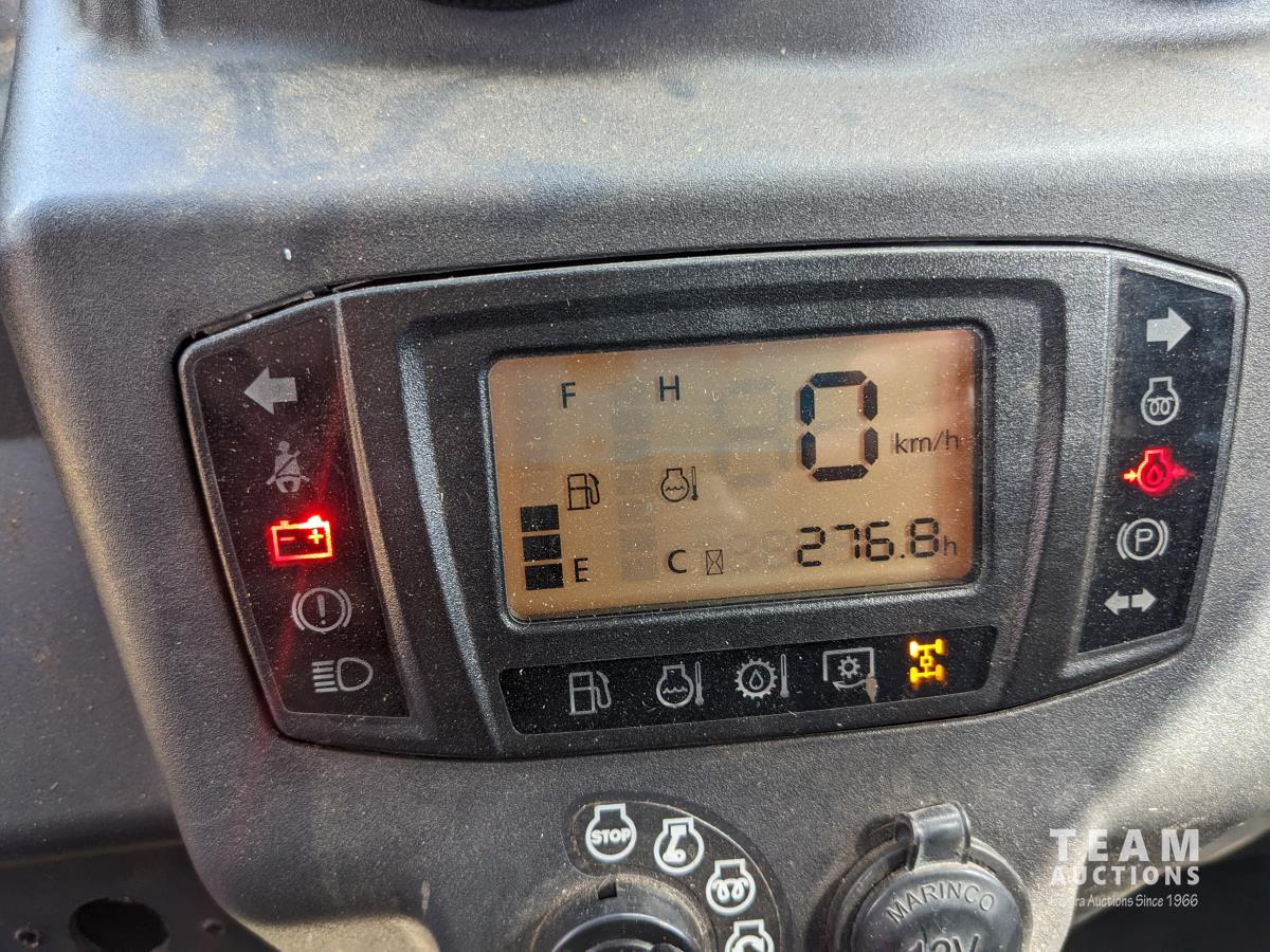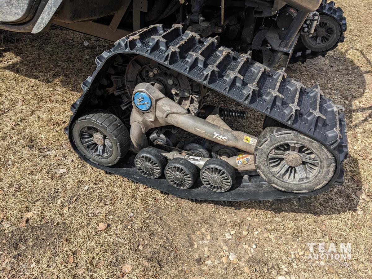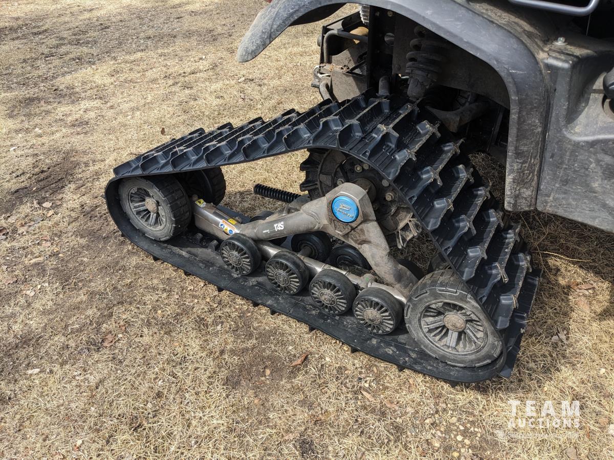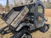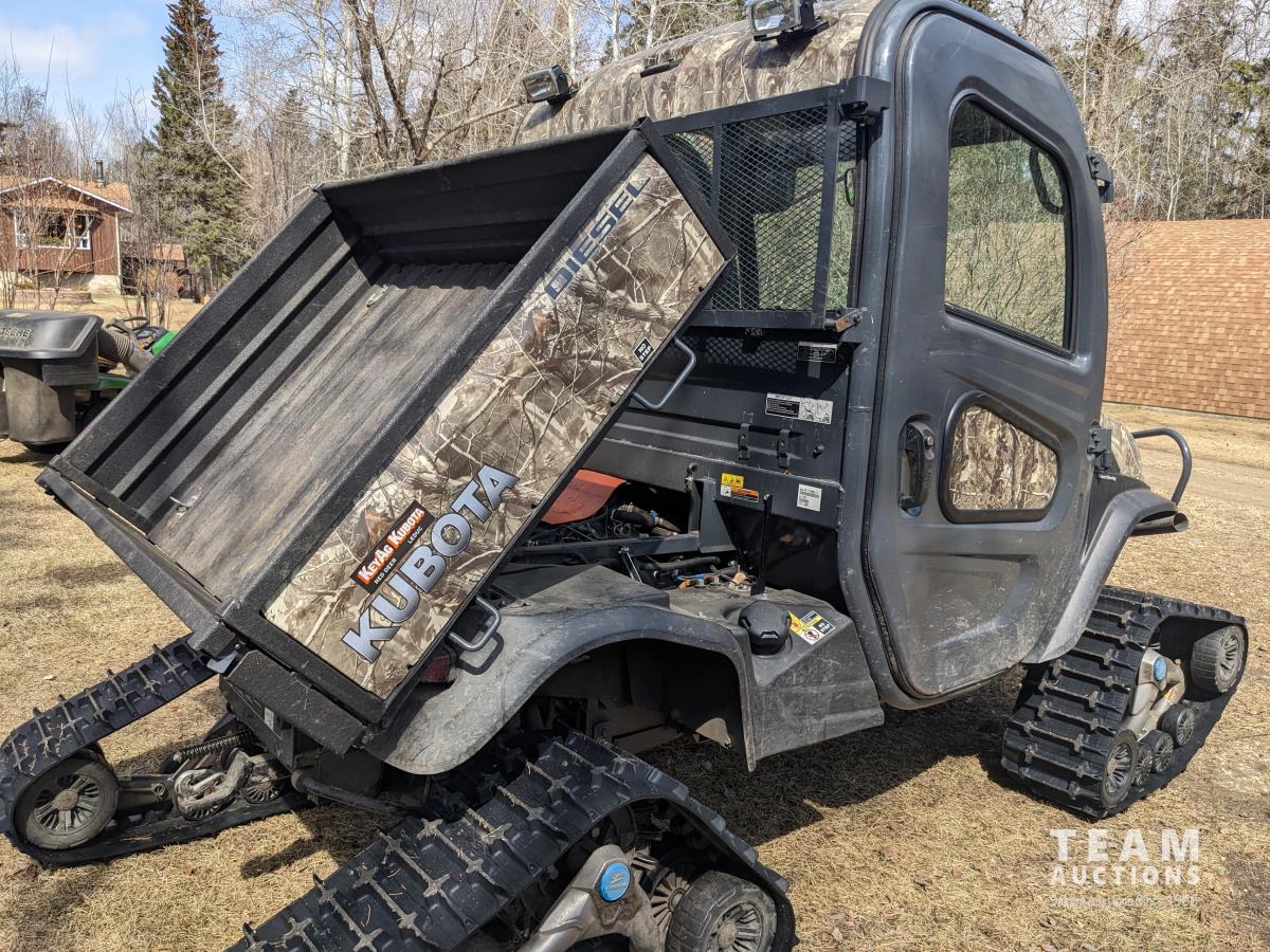 Kubota D1105 diesel engine, 2 speed variable hydro transmission, 3500 lb winch, cab, heater, A/C, Camoplast tracks, (4) unused 25X10-12 Tires