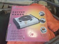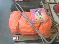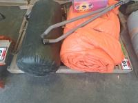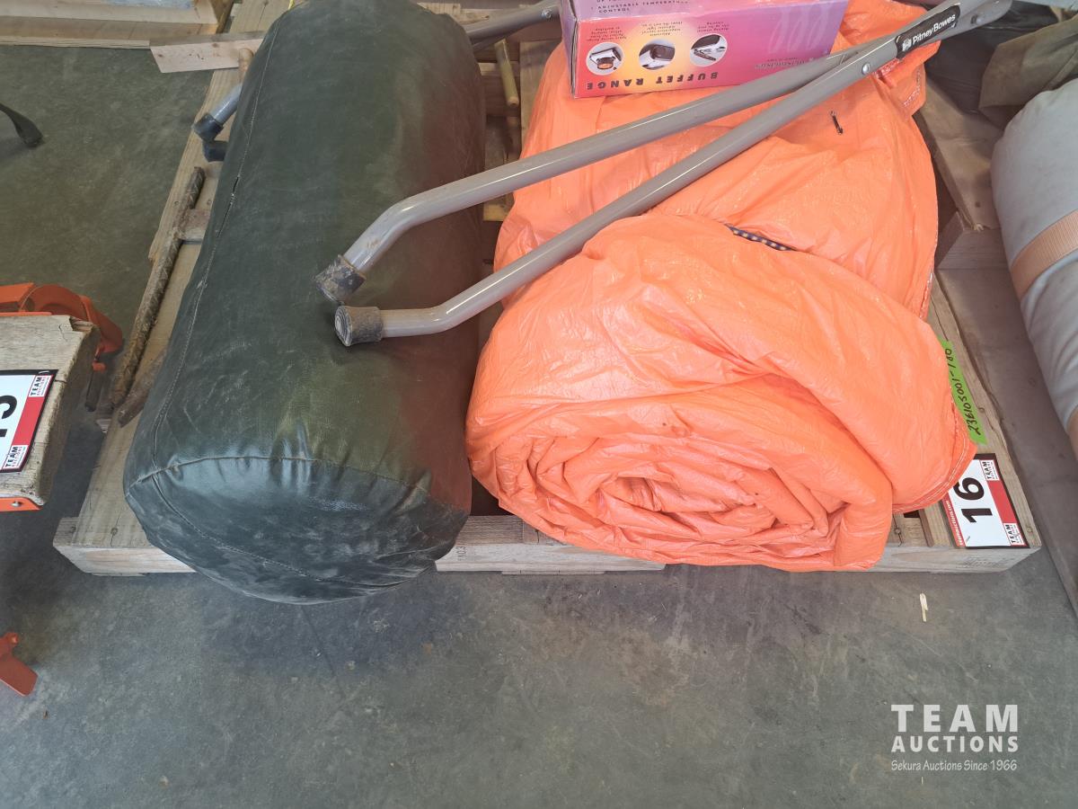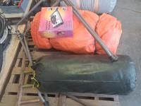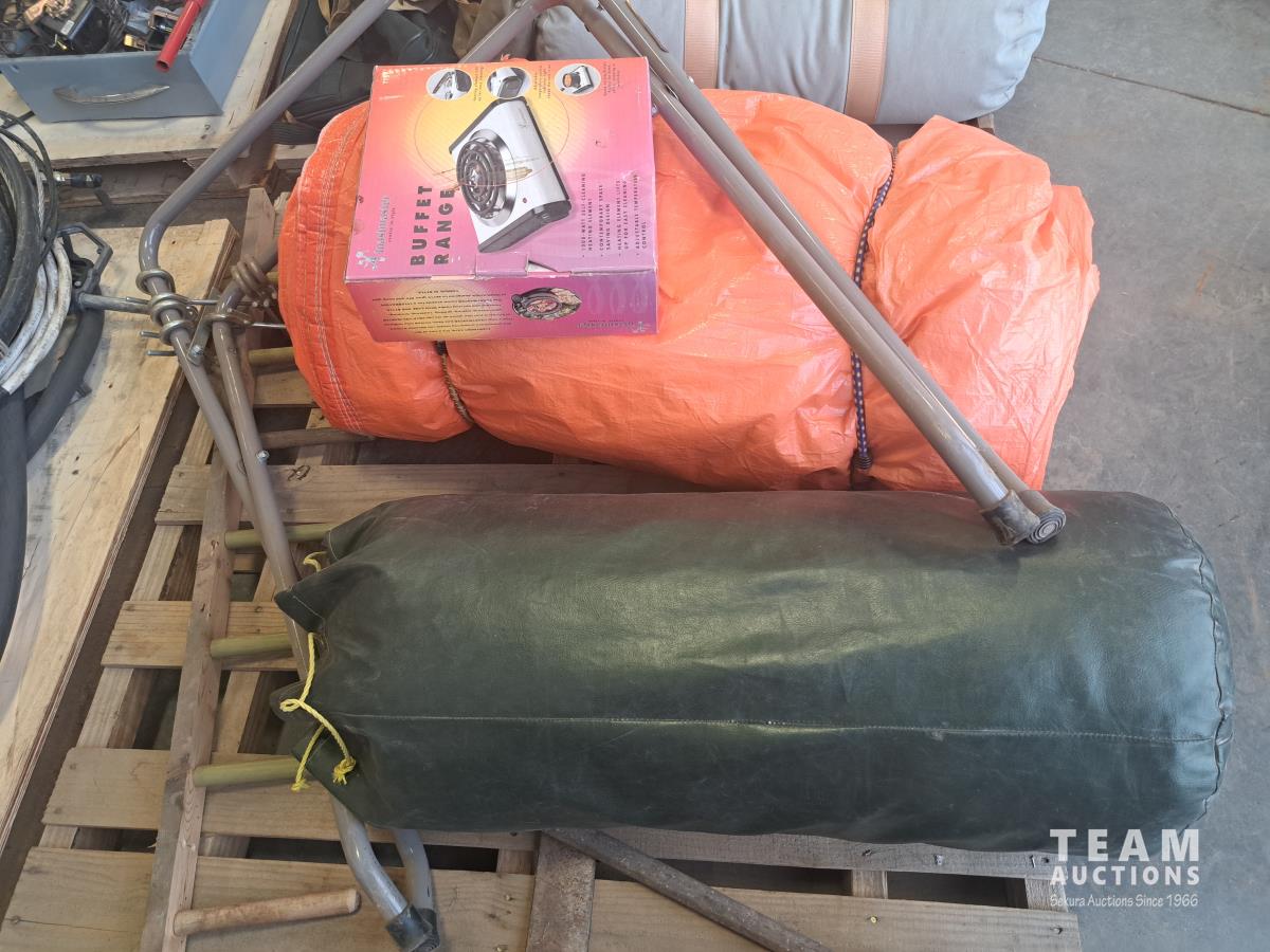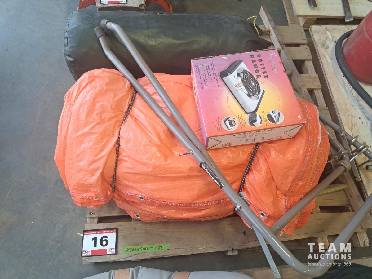 Orange tarp, sleeping bag, foldable frame. Electric single burner