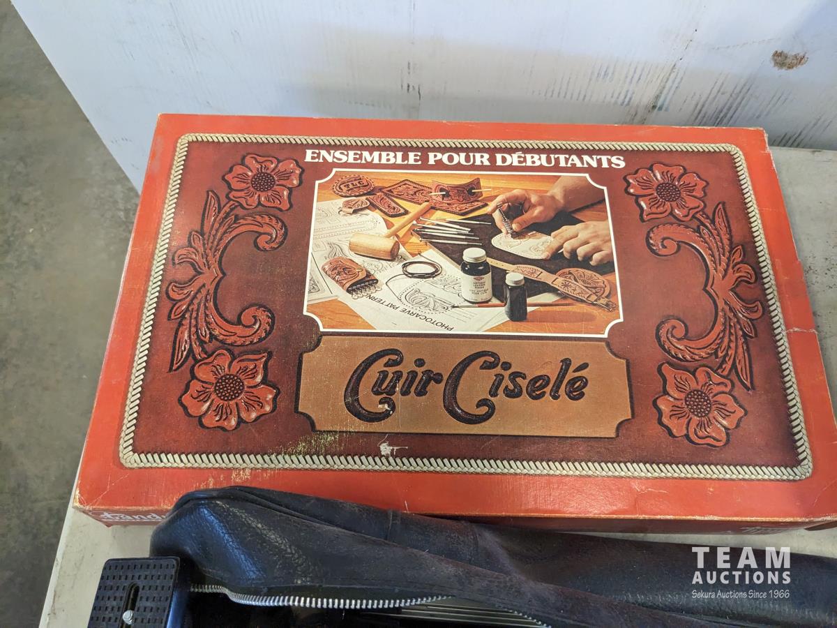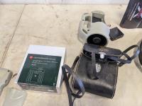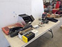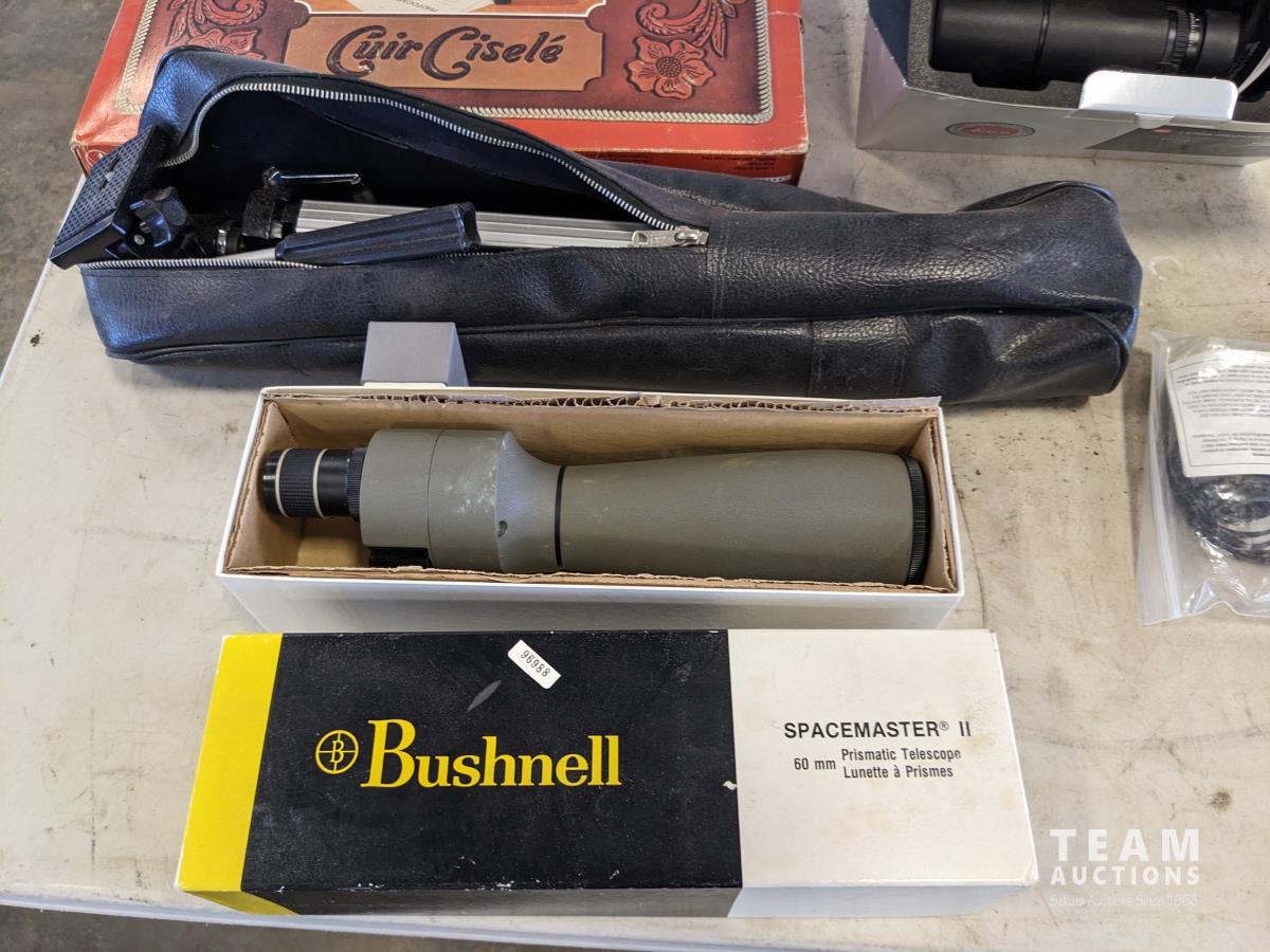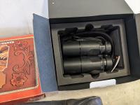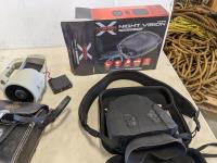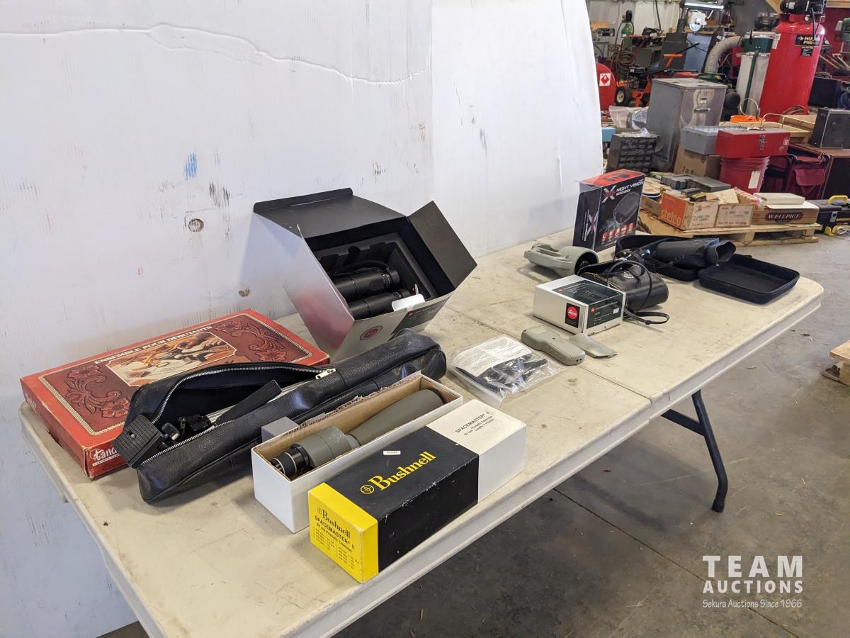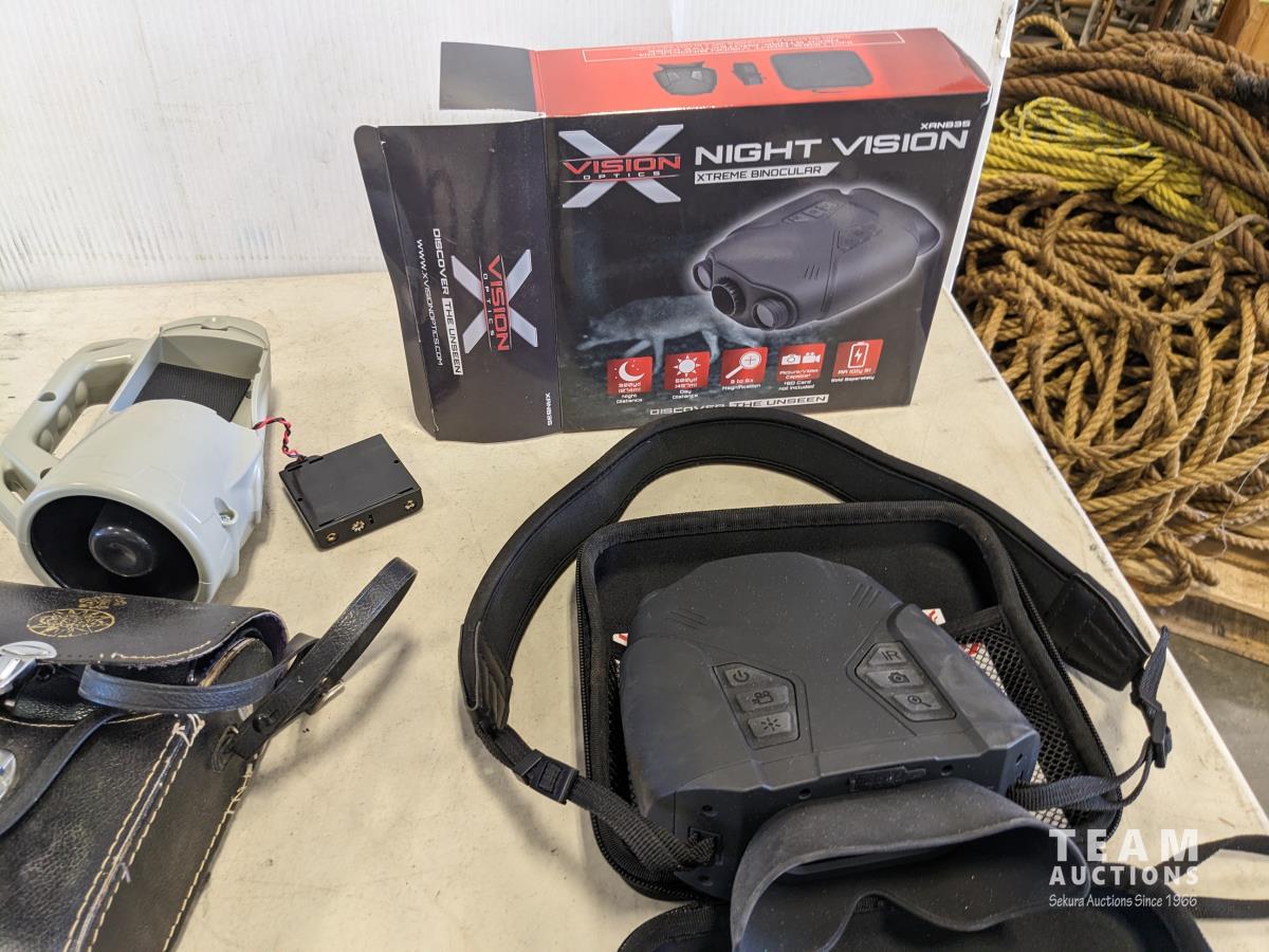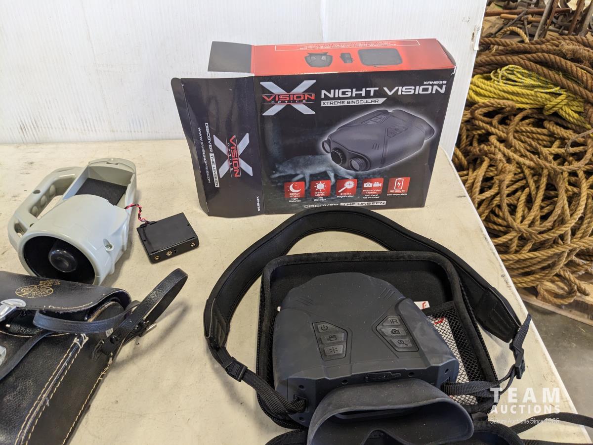 (2) Night vision binoculars, leather working tool, range master scanner, tripod