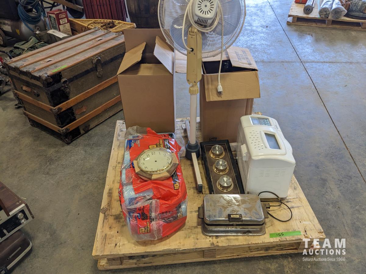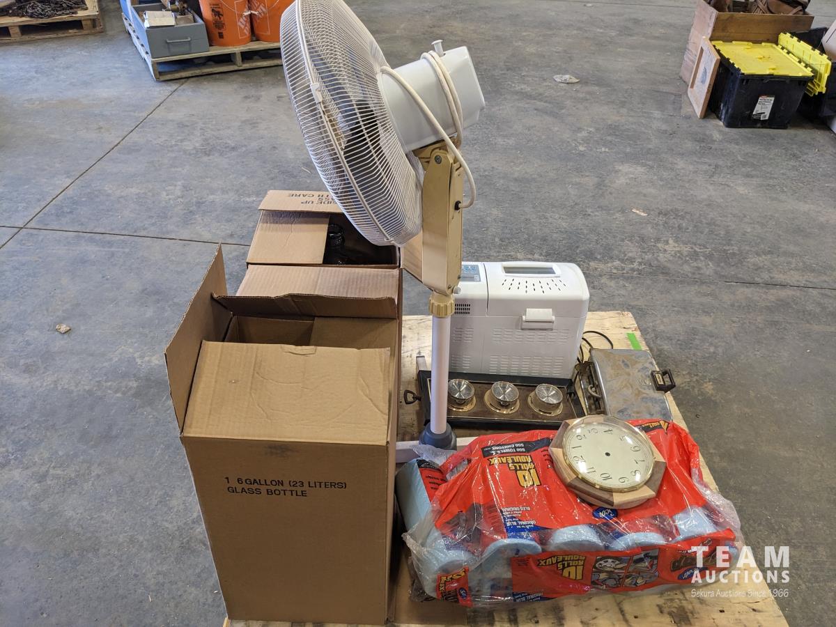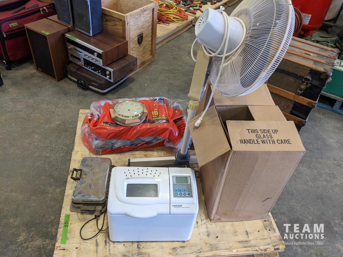 Waffle maker, blue shop towels, bread maker, (2) large jars, fan
