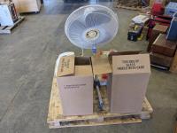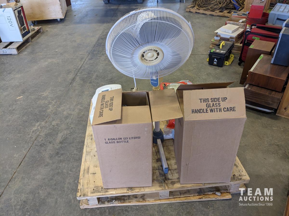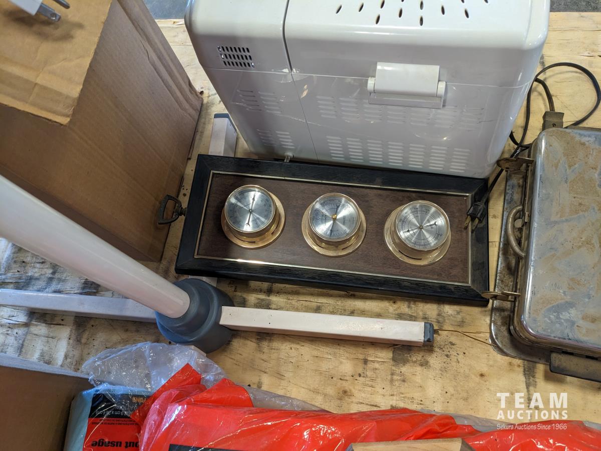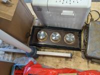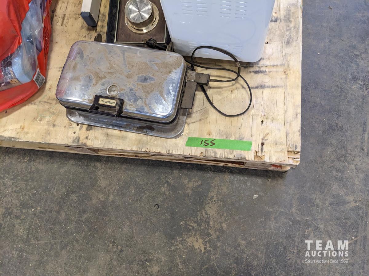 Waffle maker, blue shop towels, bread maker, (2) large jars, fan
