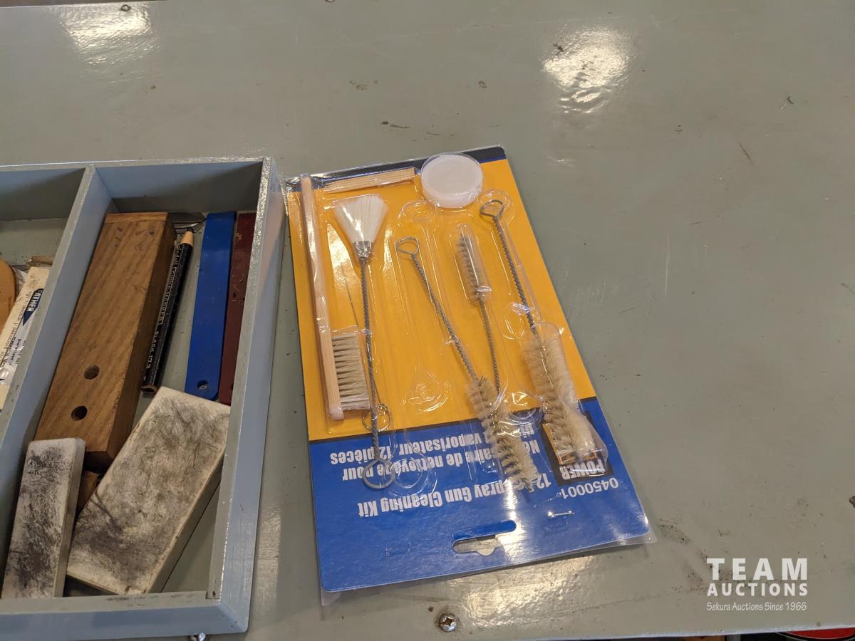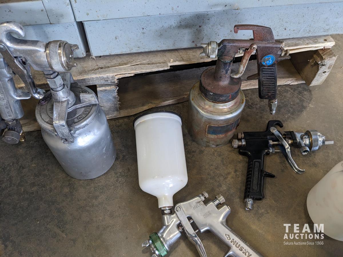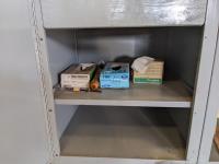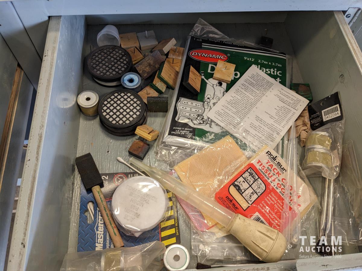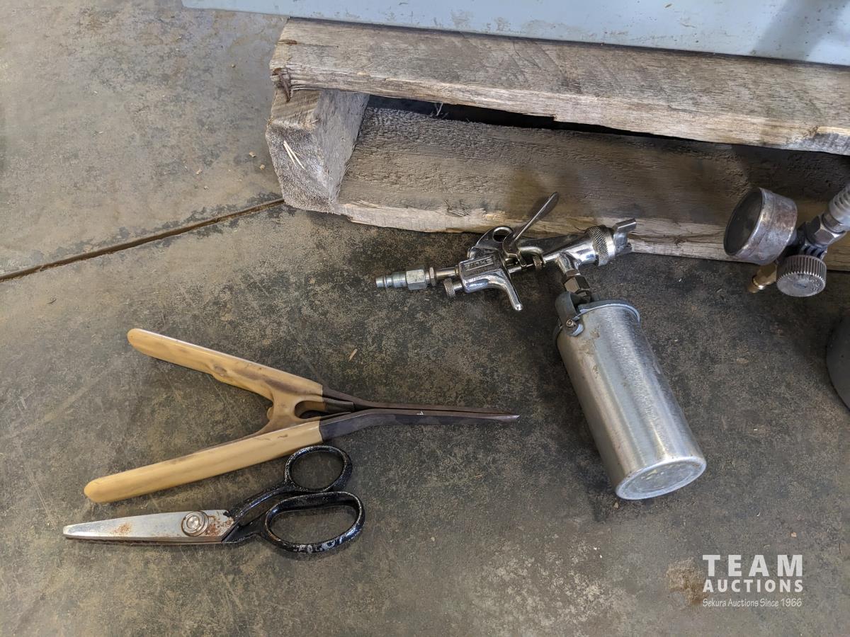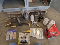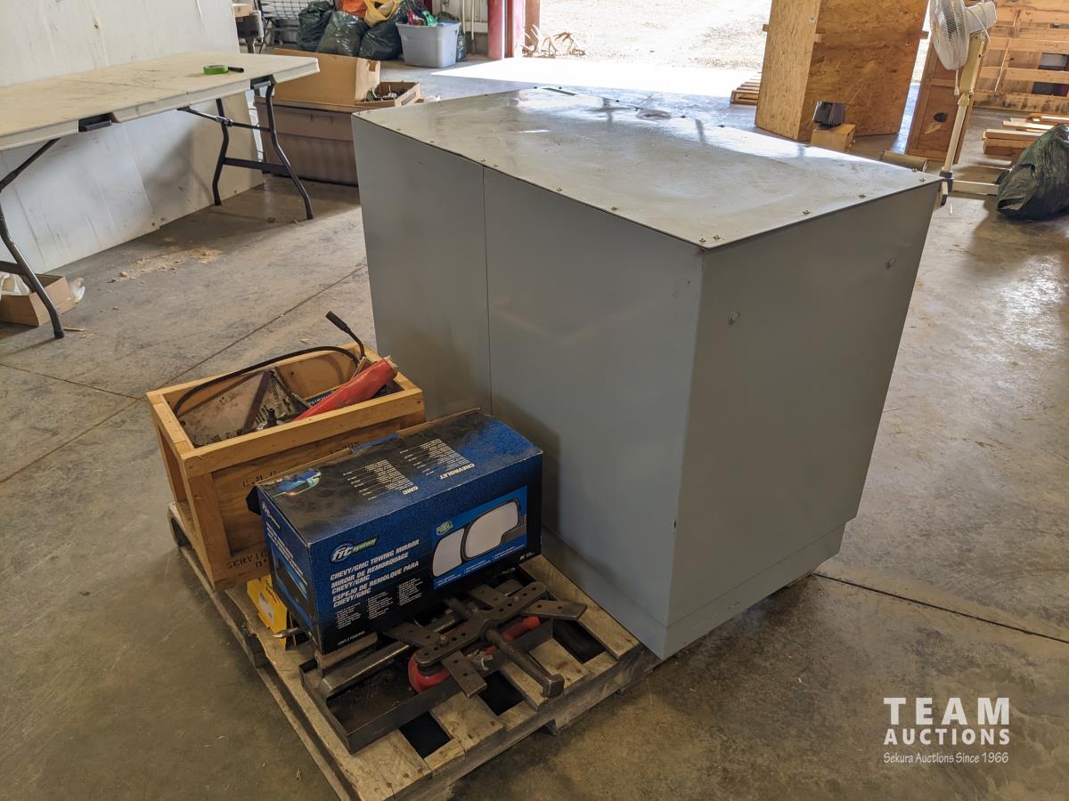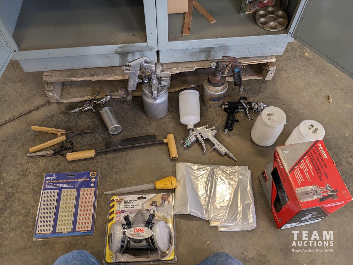 Cabinet 44 inch wide X 22 inch deep, X 32 inch high, paint spray guns, GMC mirrors, miscellaneous tools, pipe dies with handles, set of brake shoes