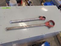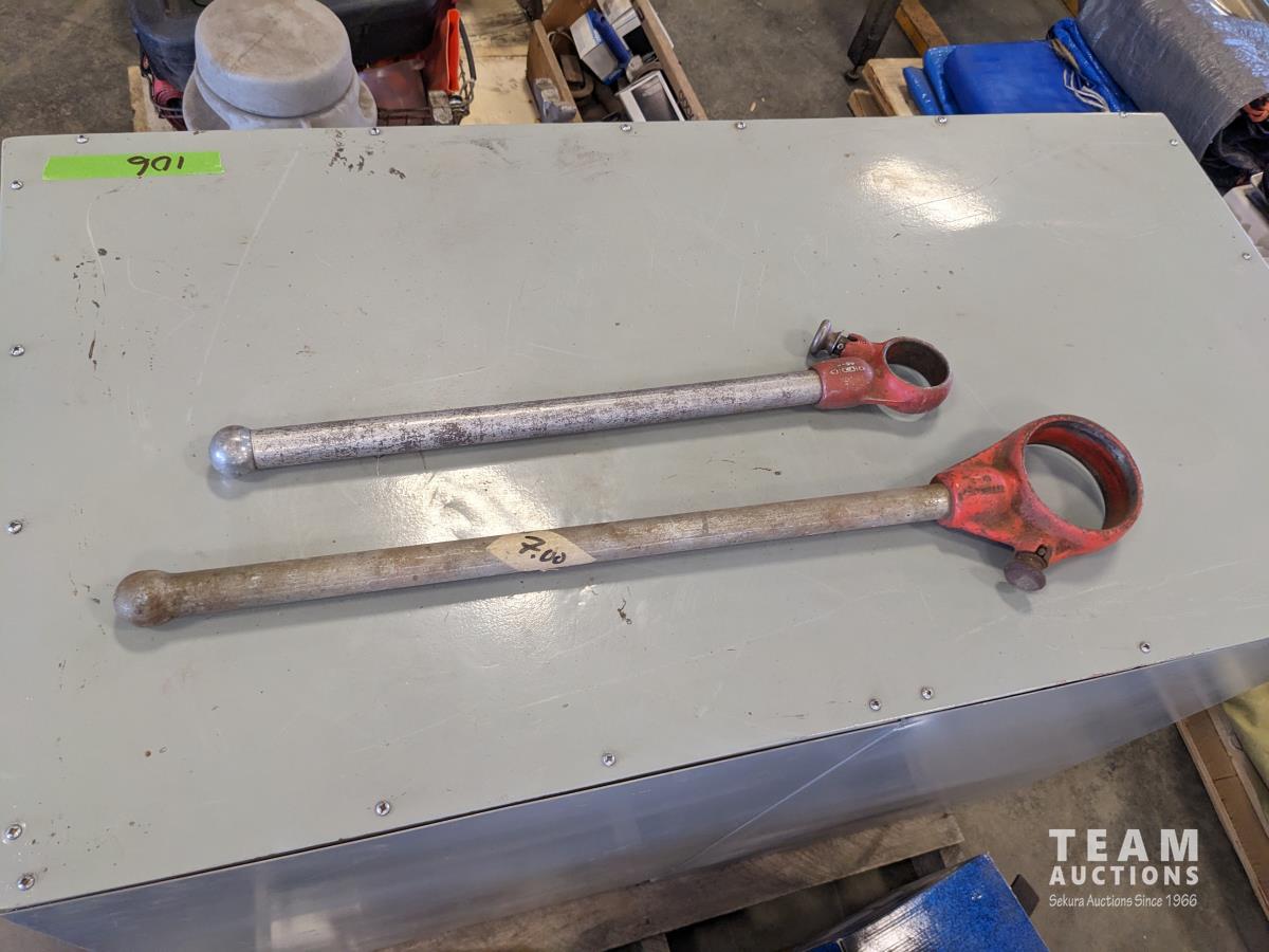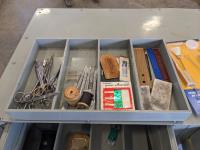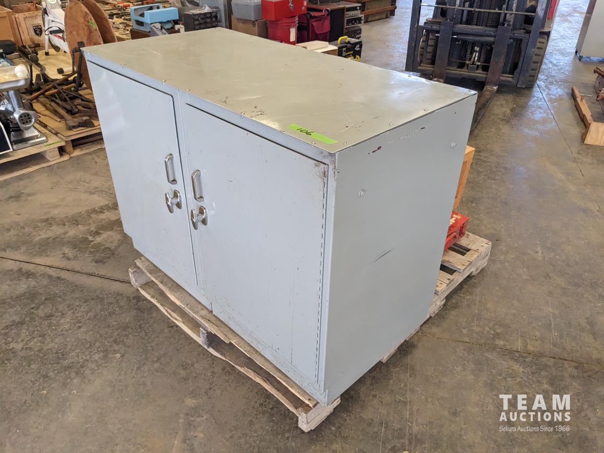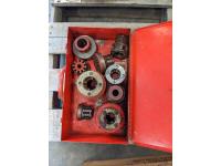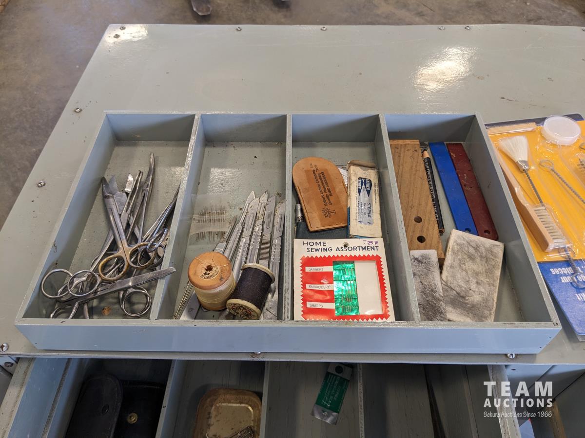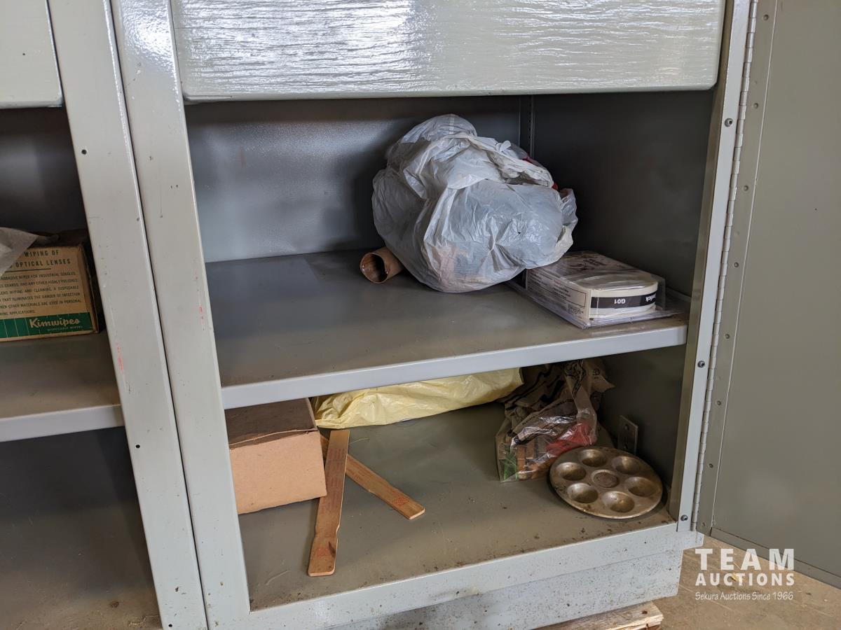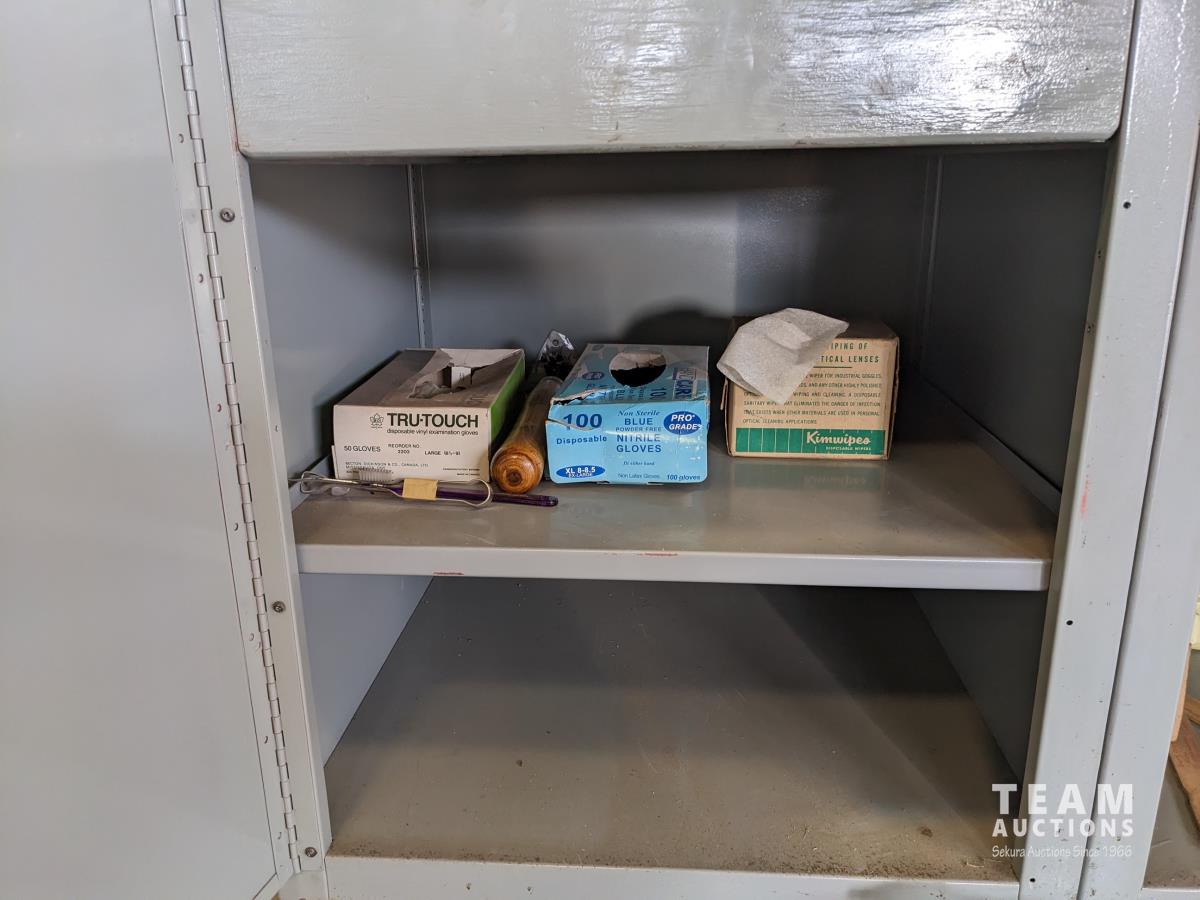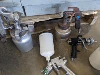Cabinet 44 inch wide X 22 inch deep, X 32 inch high, paint spray guns, GMC mirrors, miscellaneous tools, pipe dies with handles, set of brake shoes