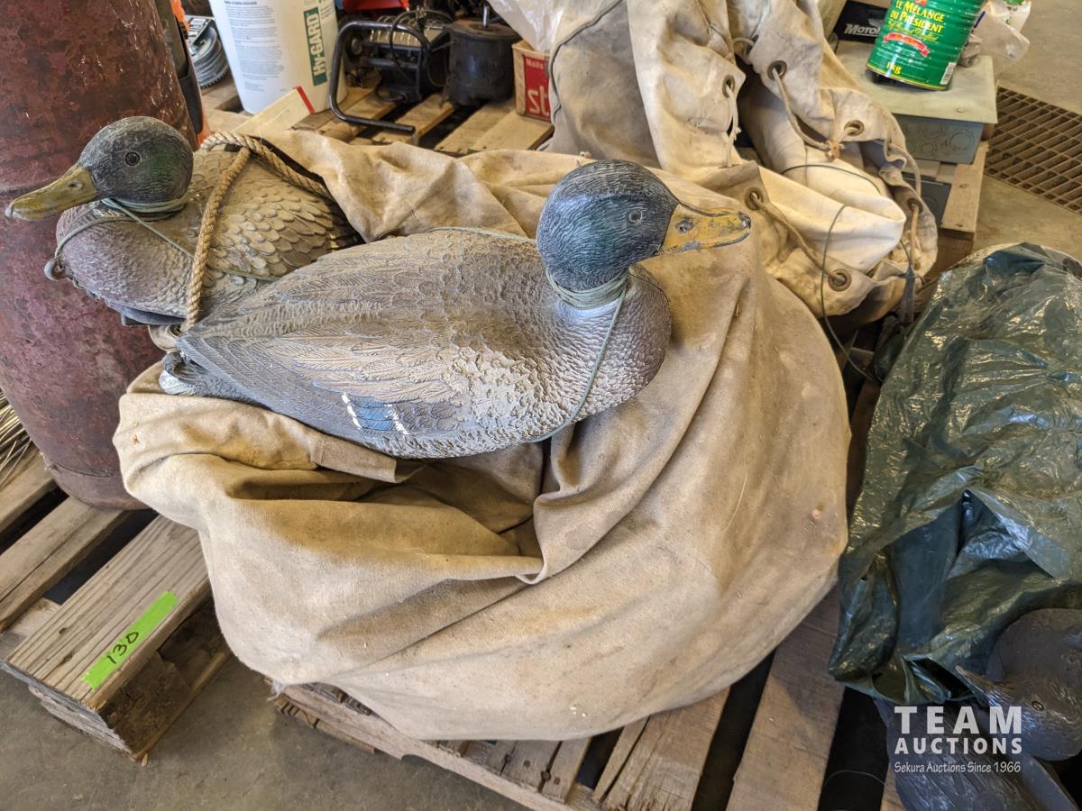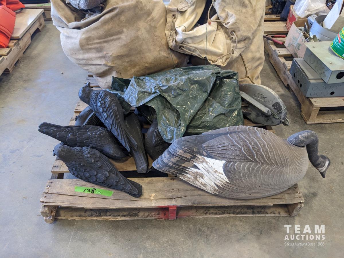 (2) canvas bags of duck decoys, (10) Canada goose decoys, qty of black raven decoys