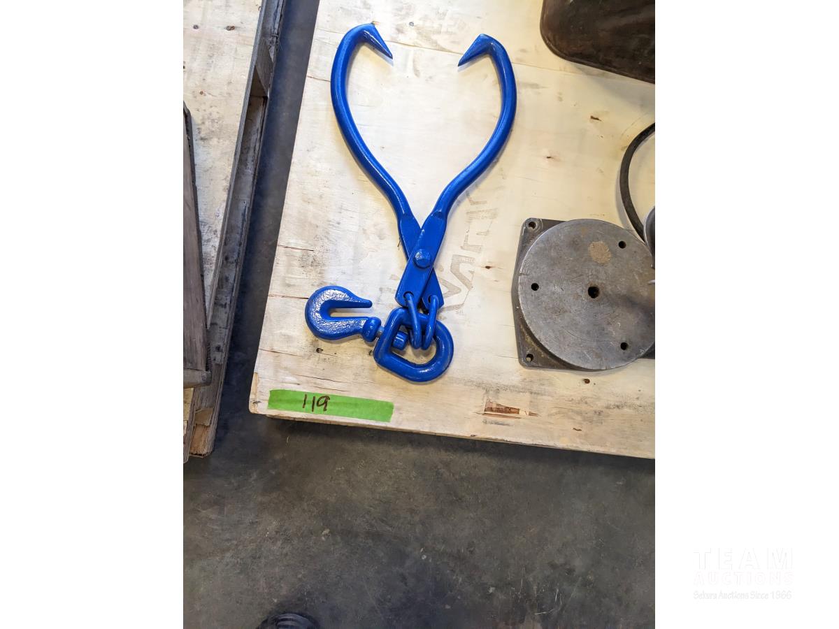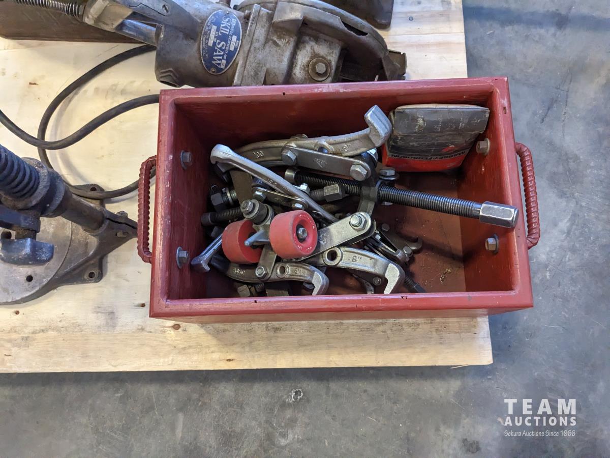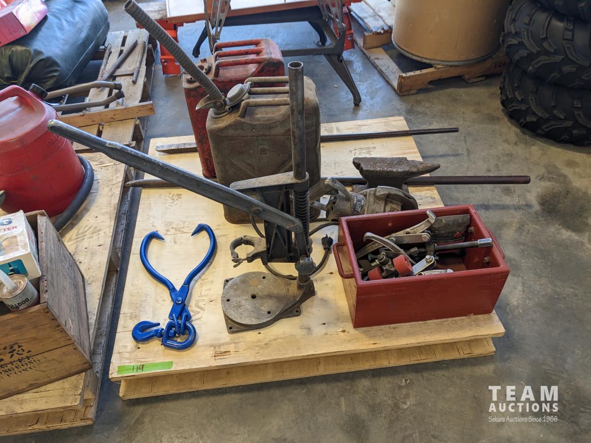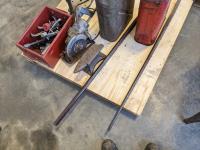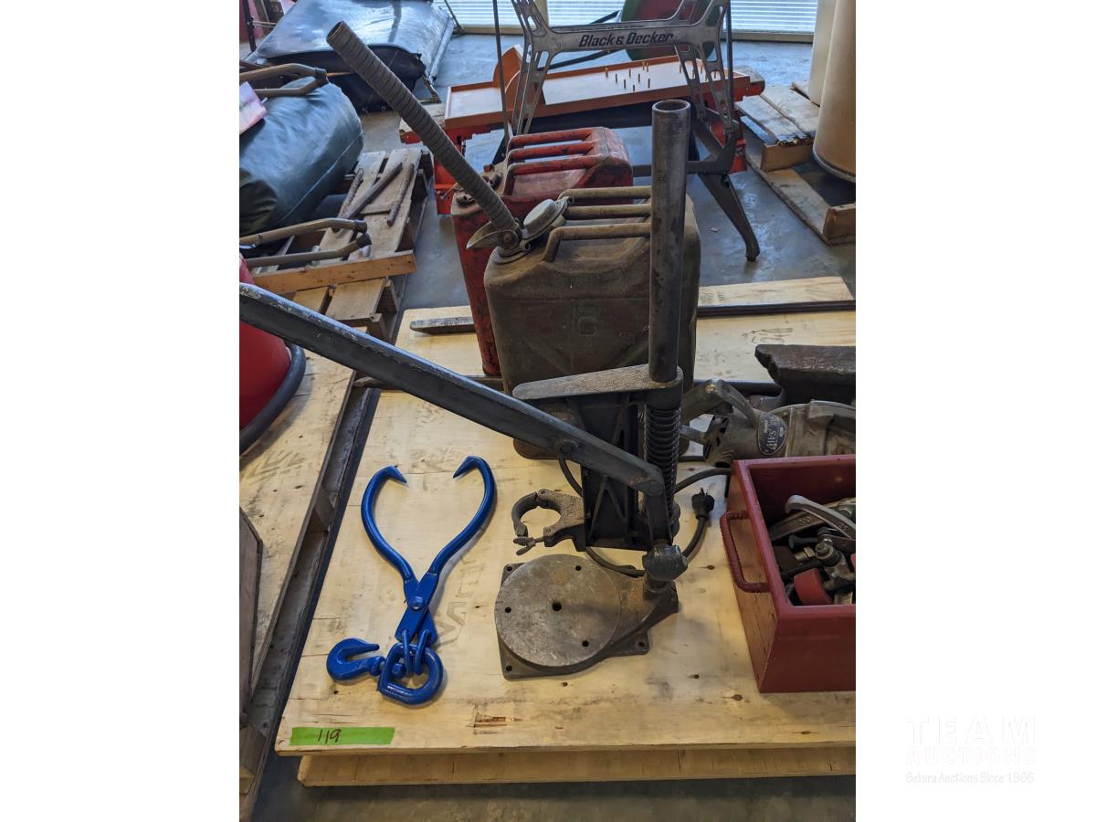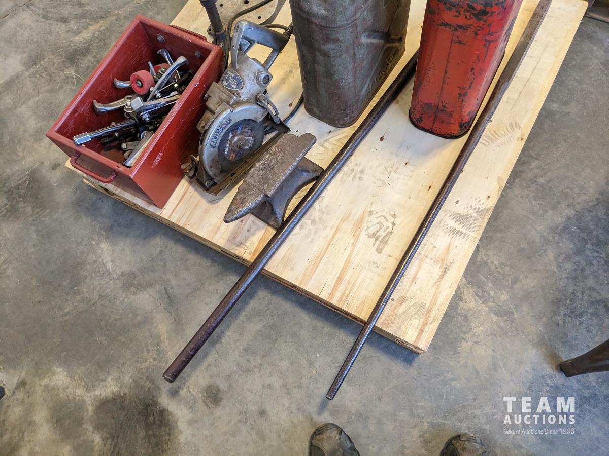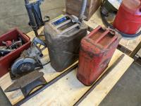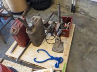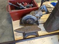 Log tongs, pullers, Skil Saw, antique anvil, (2) bars, (2) metal Jerry cans