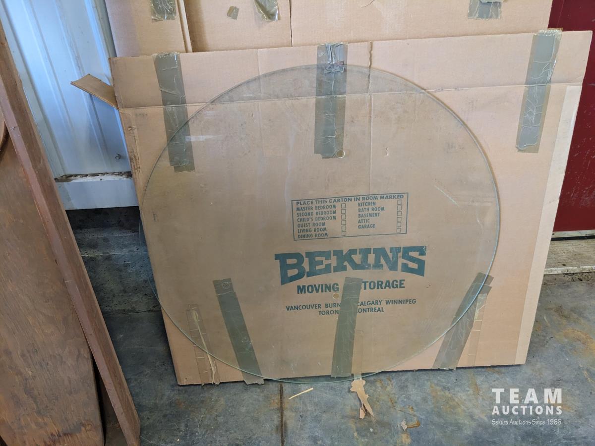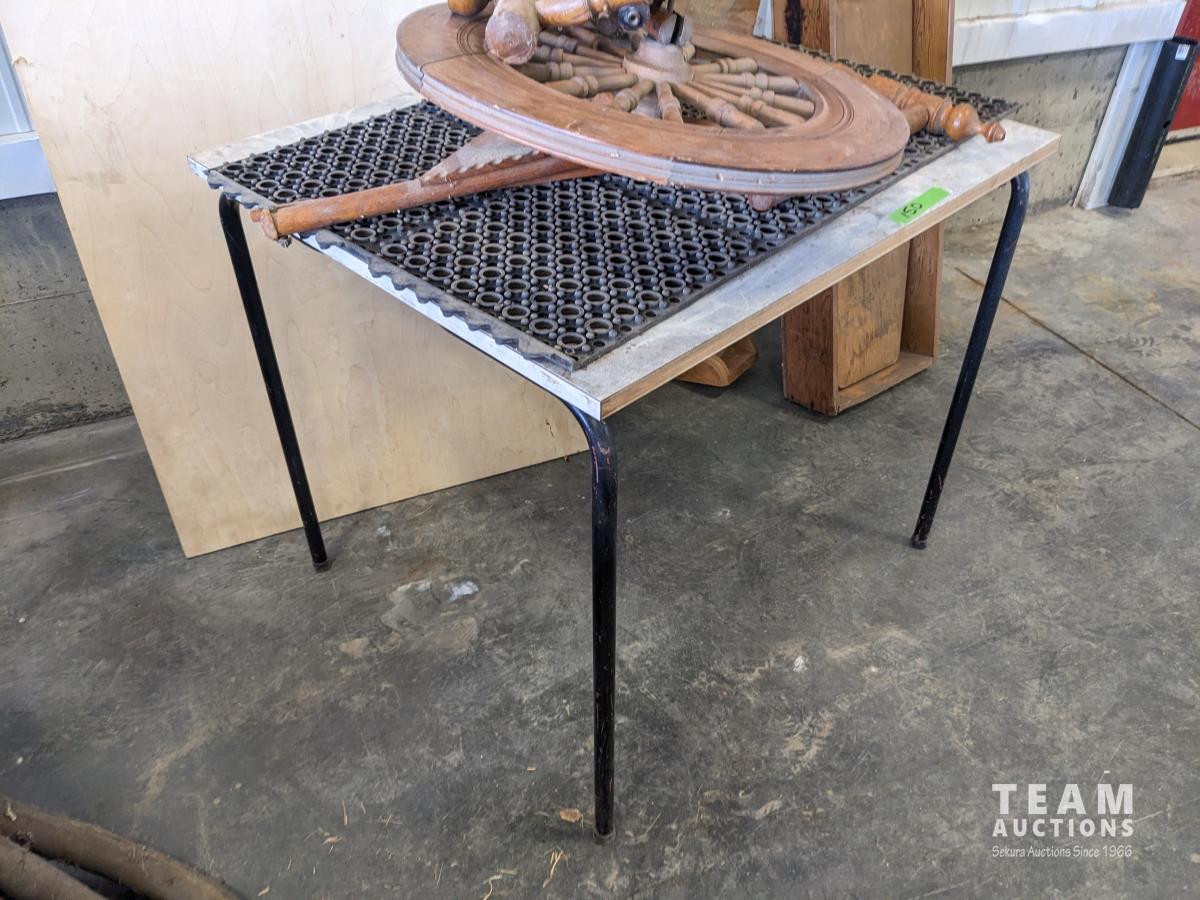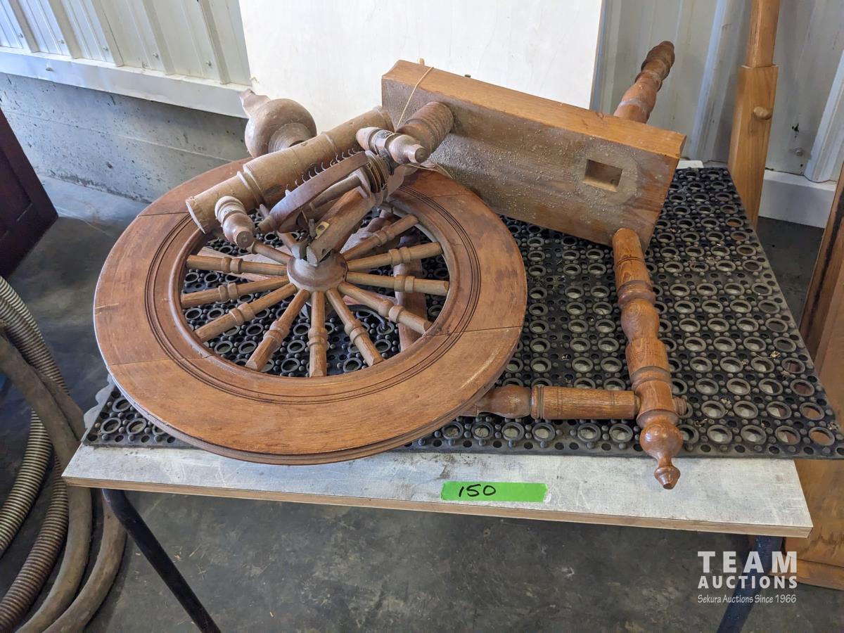 45 Vintage Ironing Board, Spinning Wheel, Small Table, Round 36 Inch Glass