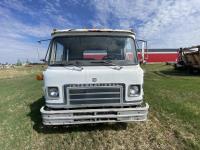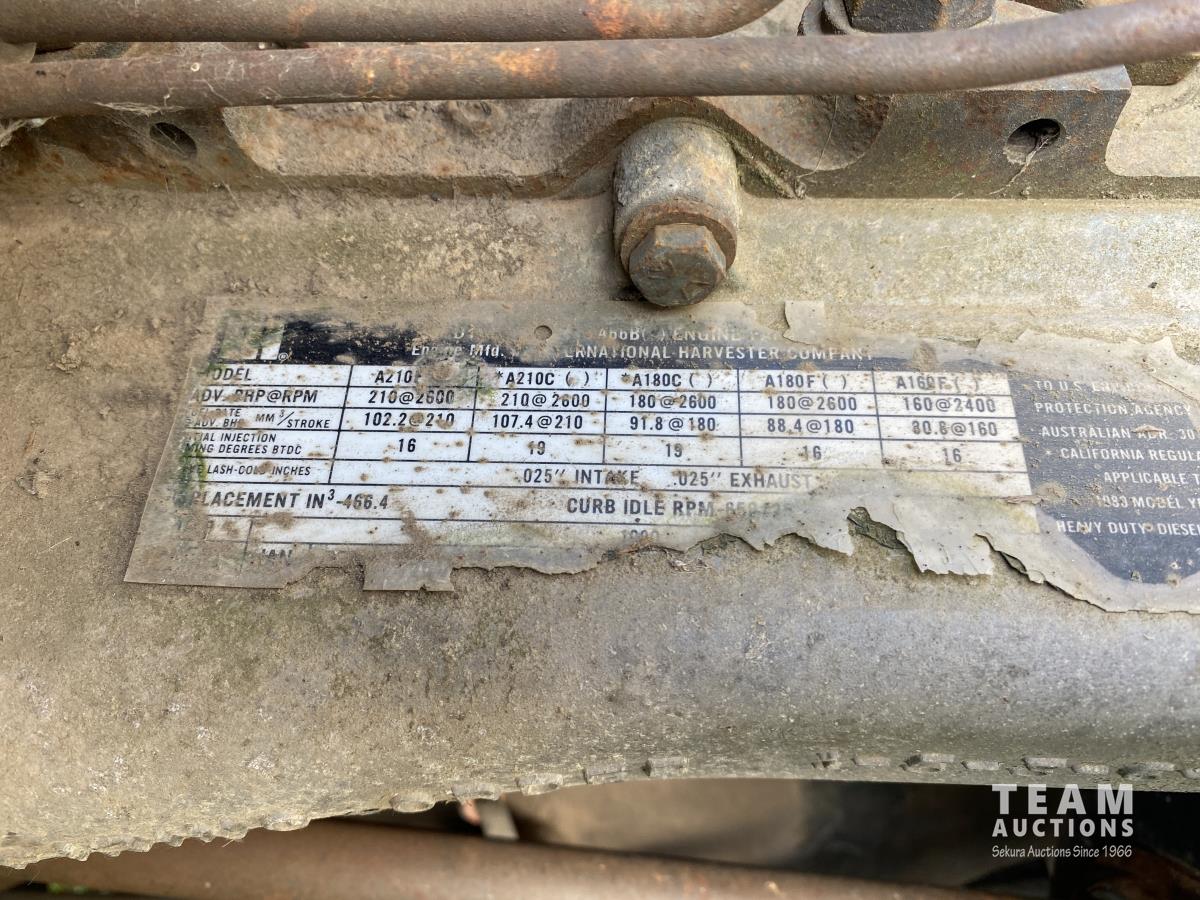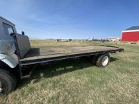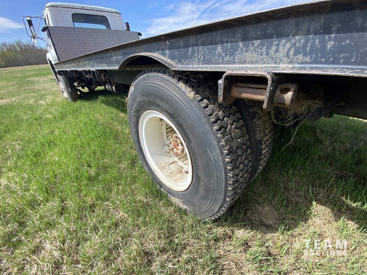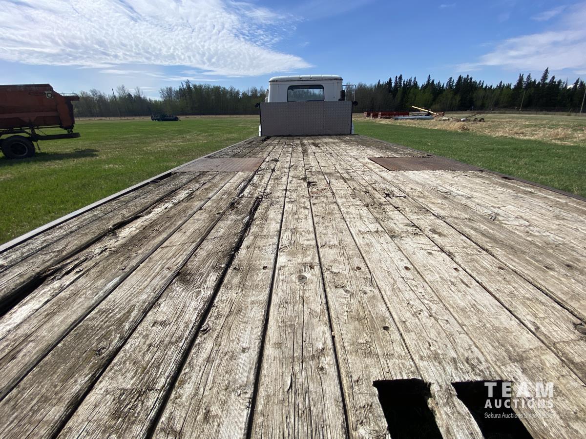 International 466 6 cylinder diesel engine, manual 5X2 transmission, 96 inch x 19 ft 8 inch deck, spring suspension, 182 inch WB, 9.00R20 front tires, 10.00R20 rear tires