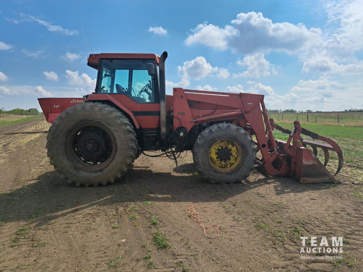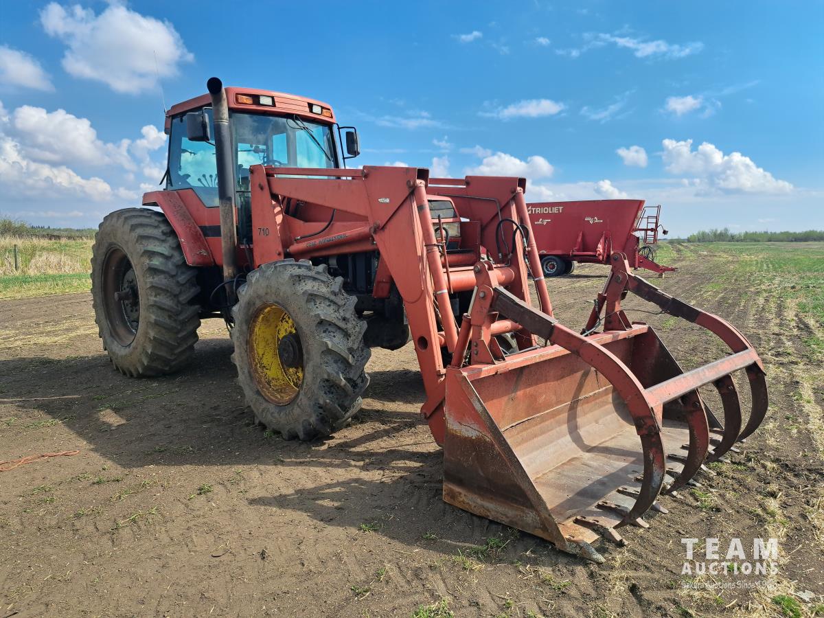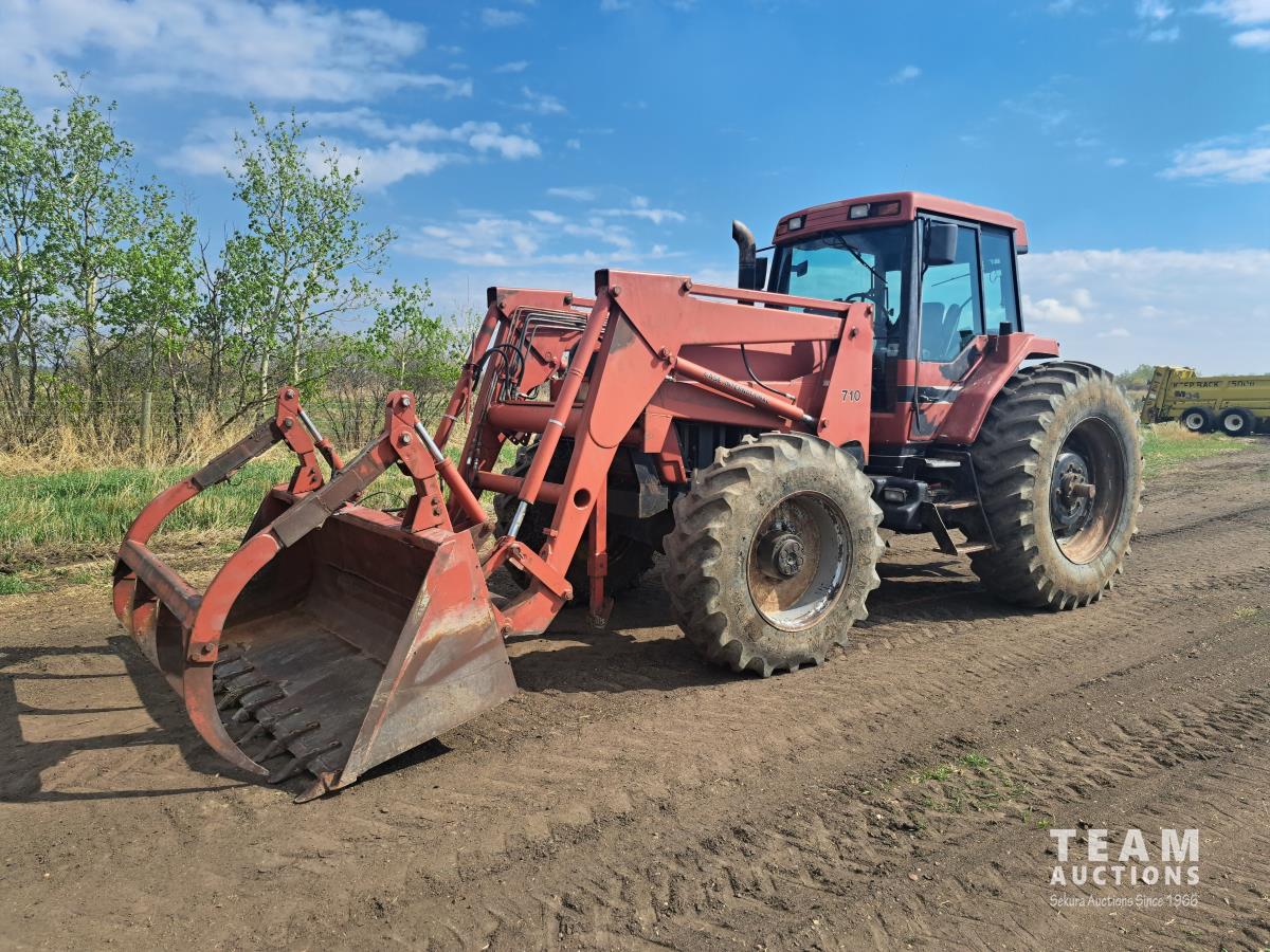Case Ih 710 loader, Q/A, 96 inch bucket, grapple, 8.3 L 6 cylinder diesel engine, 215 PTO HP, 18 speed power shift transmission, cab, rear differential lock, joystick, A/C, 1000 PTO, 4 rear hydraulic outlets, 420/85R30 front tires, 520/85R42 rear tires