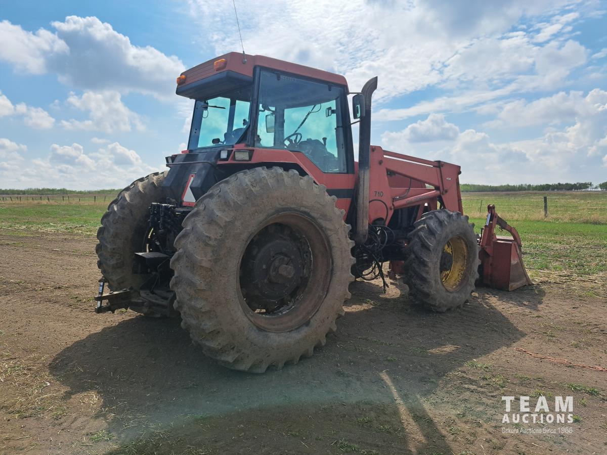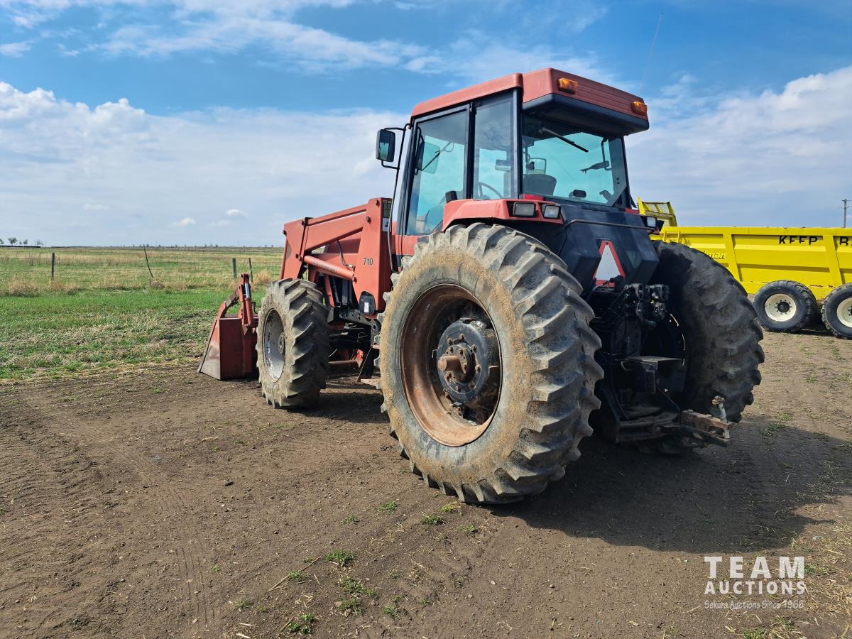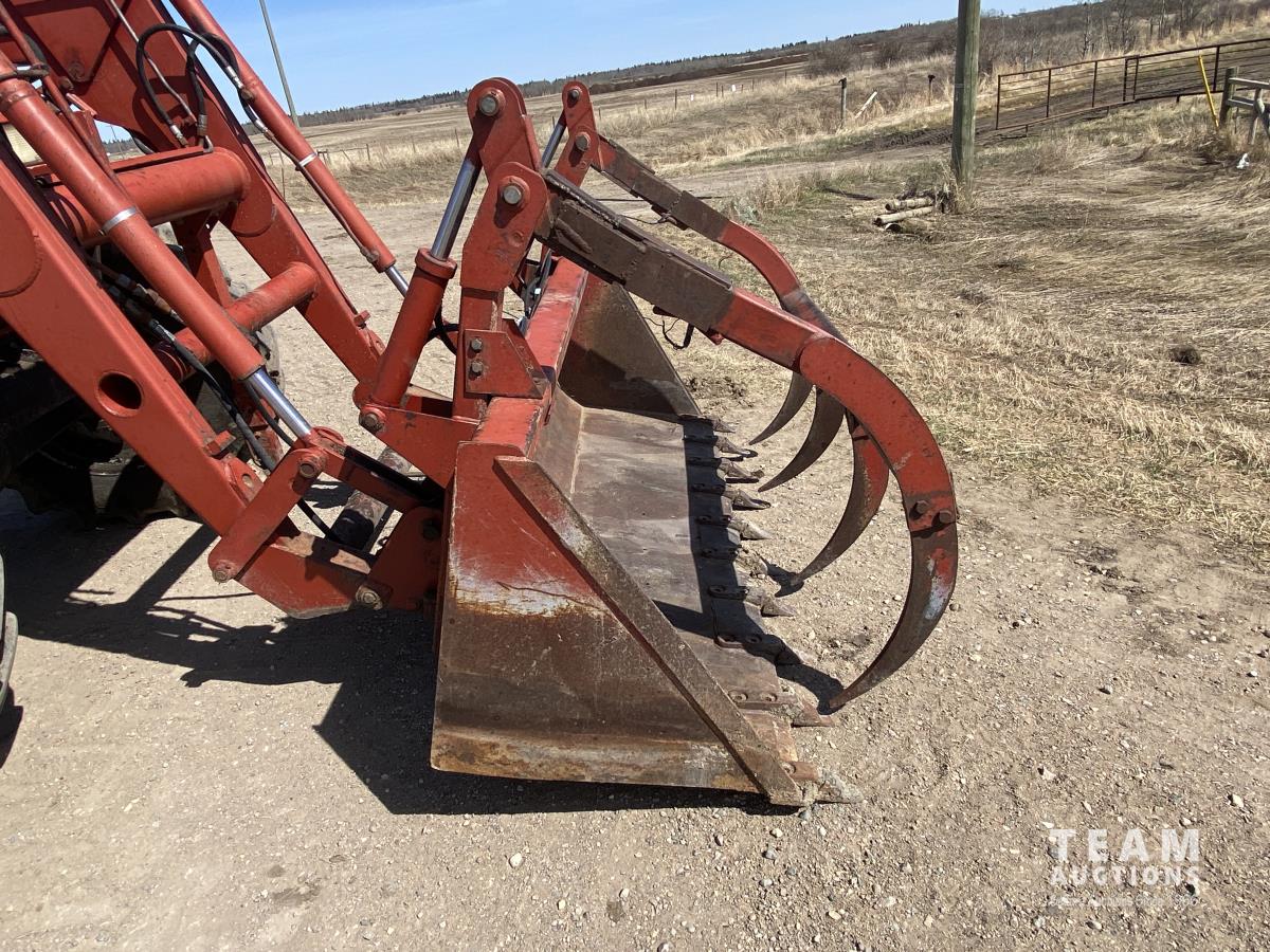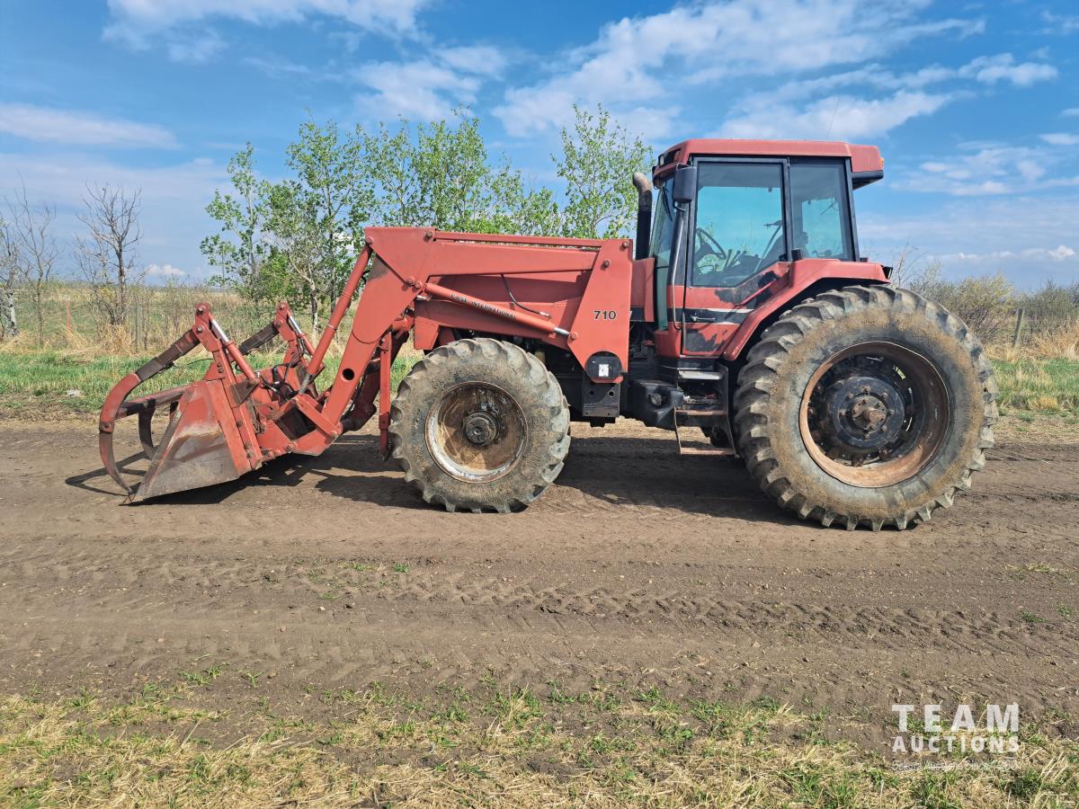 Case Ih 710 loader, Q/A, 96 inch bucket, grapple, 8.3 L 6 cylinder diesel engine, 215 PTO HP, 18 speed power shift transmission, cab, rear differential lock, joystick, A/C, 1000 PTO, 4 rear hydraulic outlets, 420/85R30 front tires, 520/85R42 rear tires