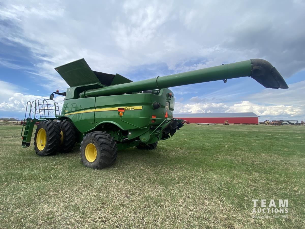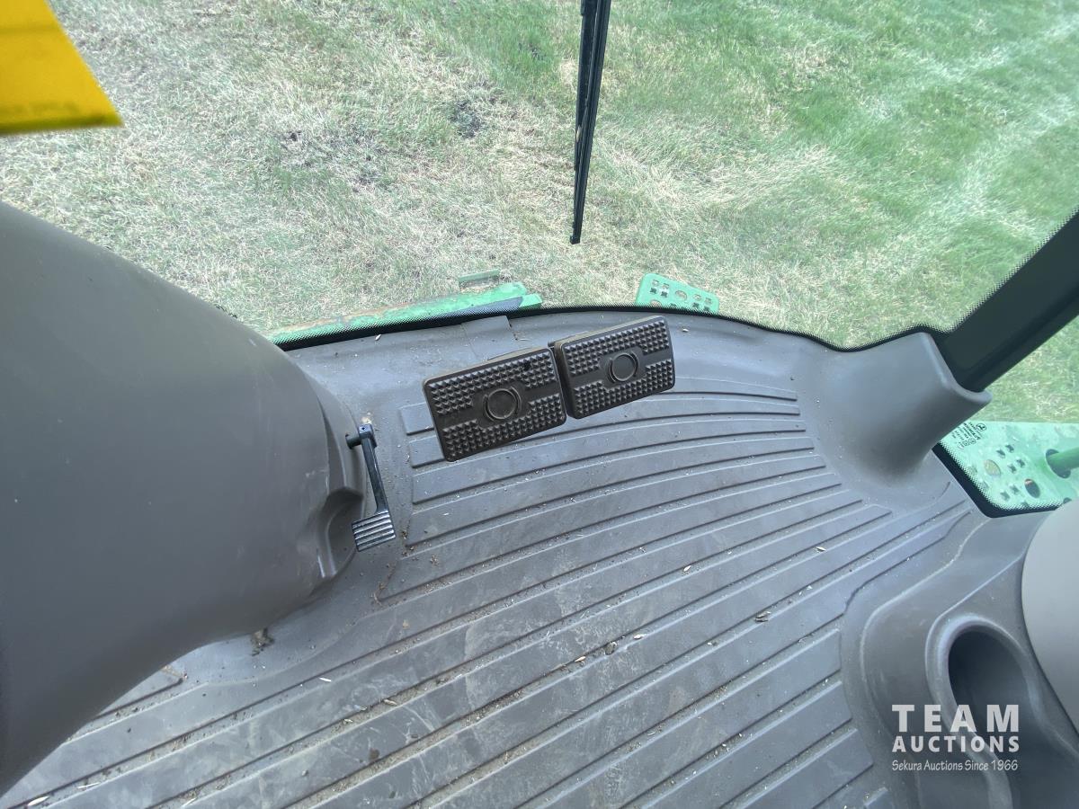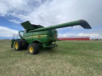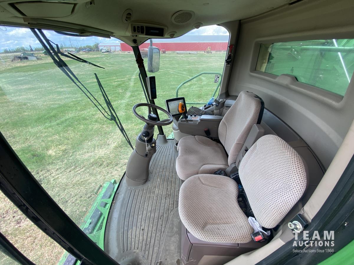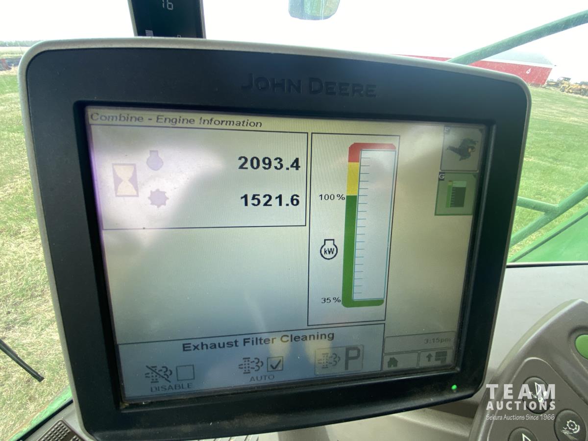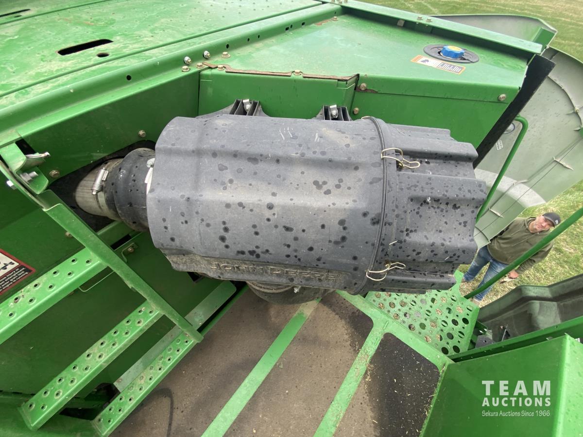 John Deere 615P pick-up header, variable speed reel, auto header height, fore & aft, reverser, lateral tilt, rock trap, chopper/straw spreader, grain tank extensions, A/C, radio, 520/85R42 front tires, duals, 750/65R26 rear tires