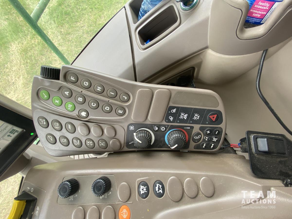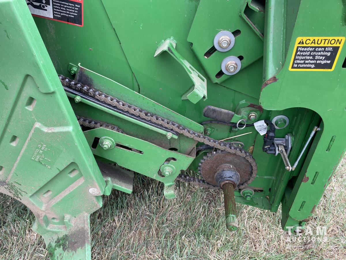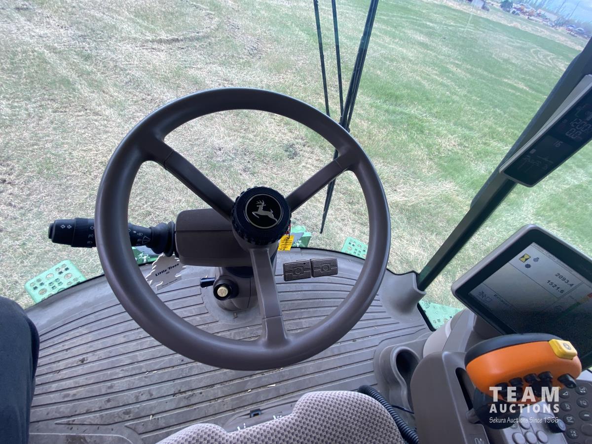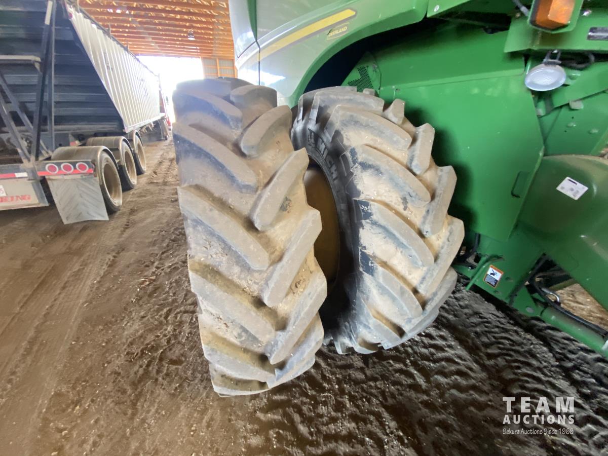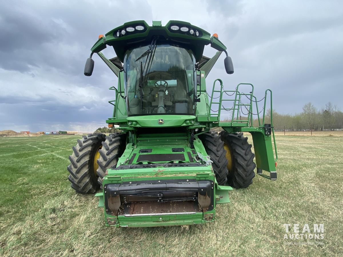 John Deere 615P pick-up header, variable speed reel, auto header height, fore & aft, reverser, lateral tilt, rock trap, chopper/straw spreader, grain tank extensions, A/C, radio, 520/85R42 front tires, duals, 750/65R26 rear tires