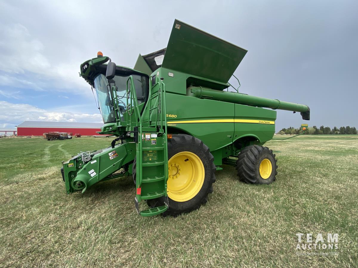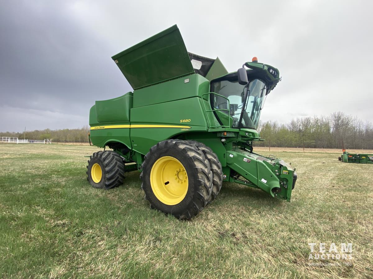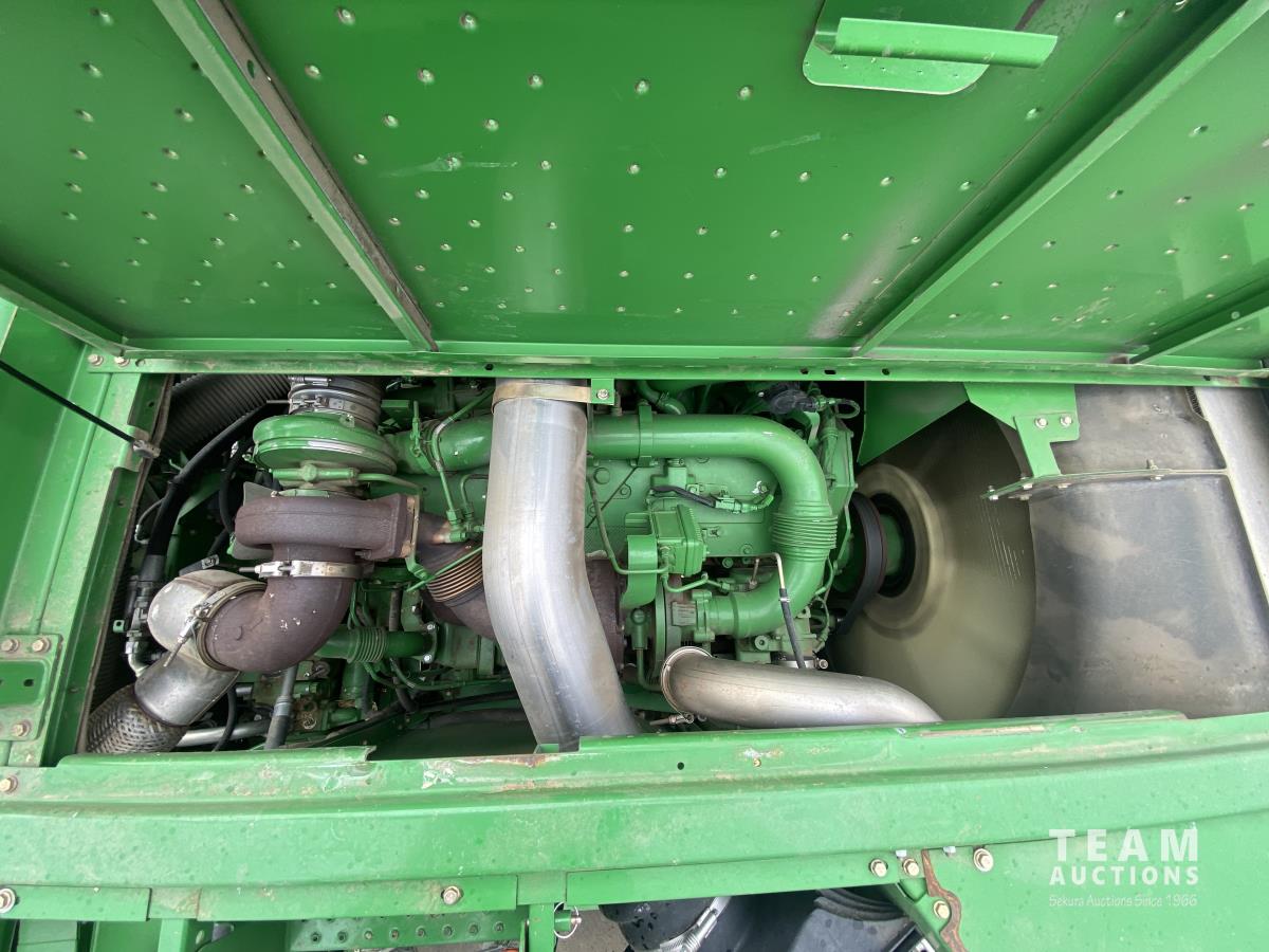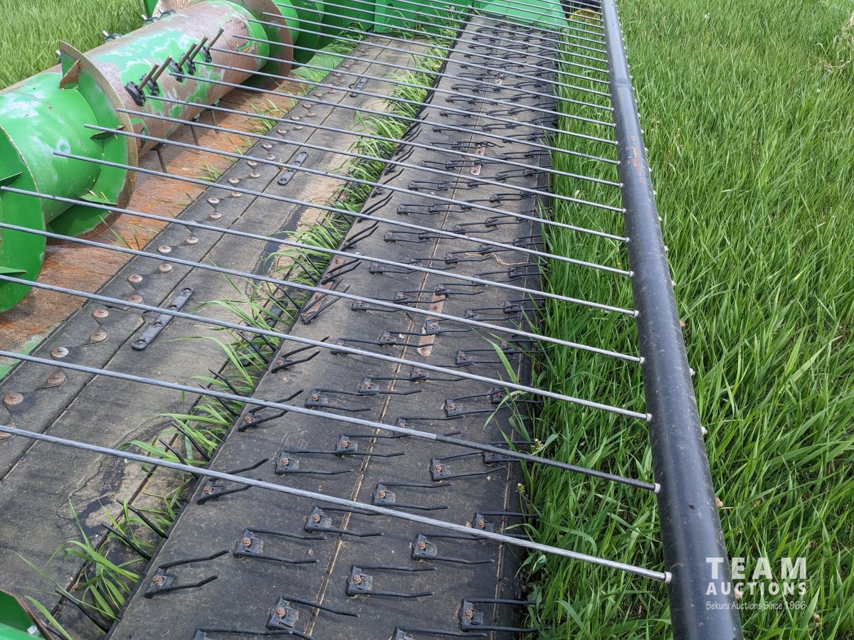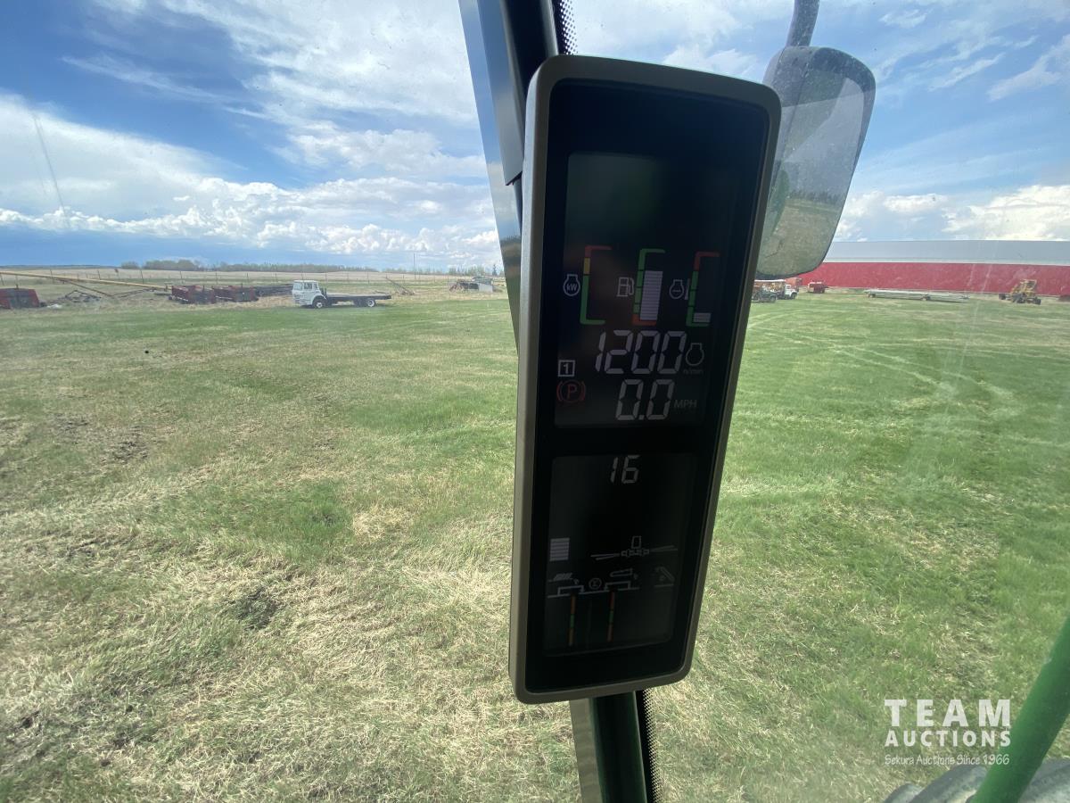John Deere 615P pick-up header, variable speed reel, auto header height, fore & aft, reverser, lateral tilt, rock trap, chopper/straw spreader, grain tank extensions, A/C, radio, 520/85R42 front tires, duals, 750/65R26 rear tires