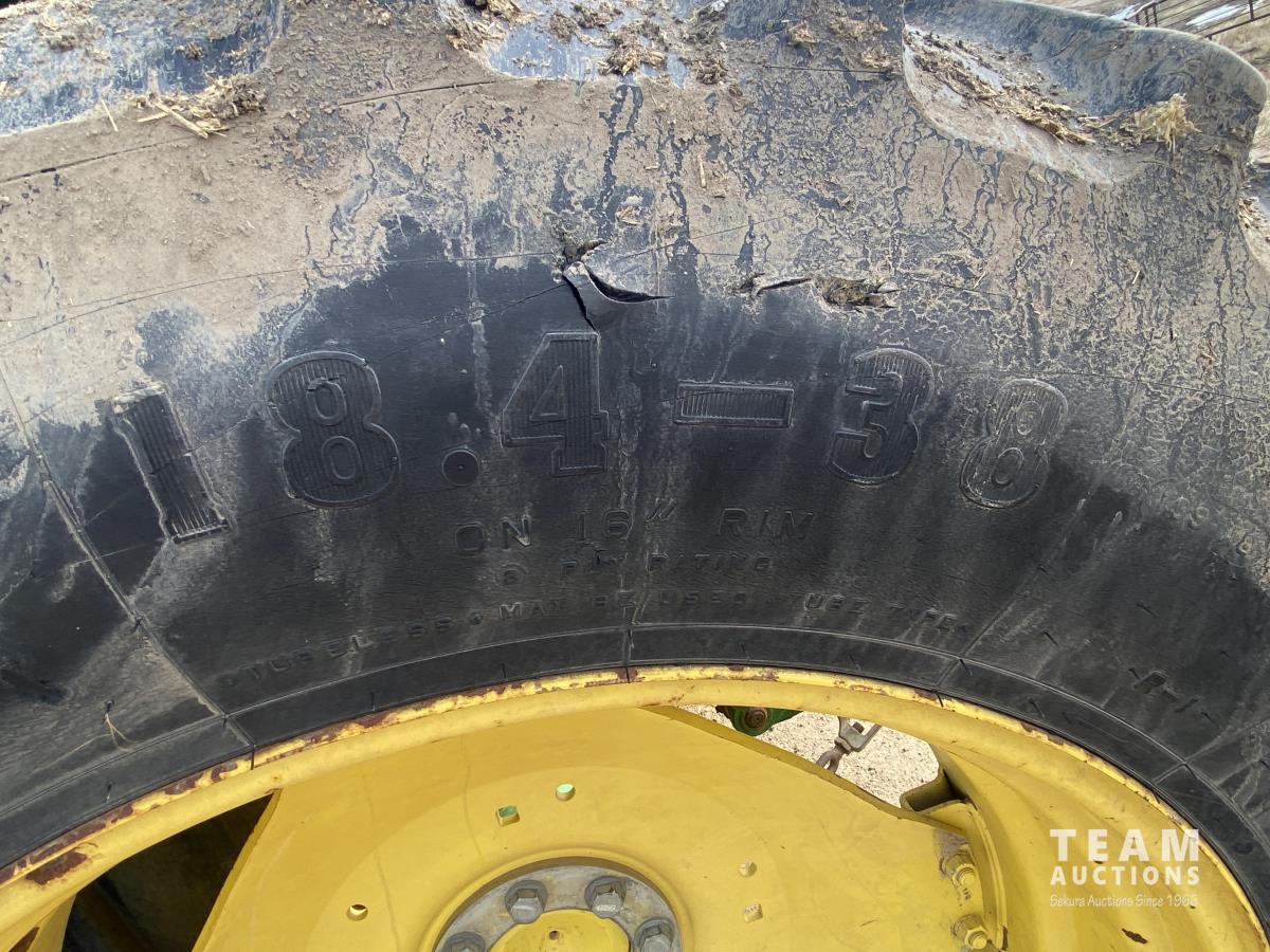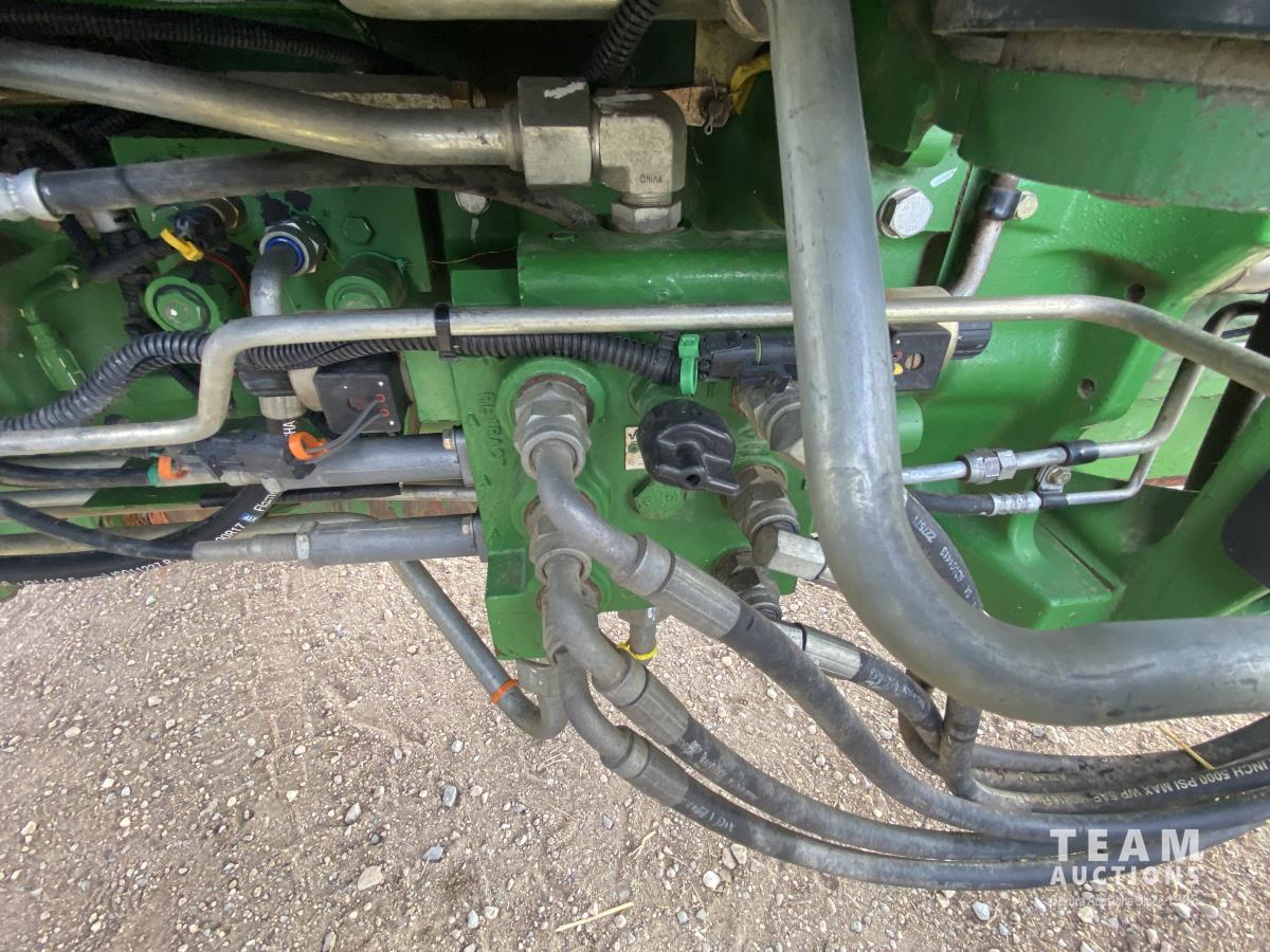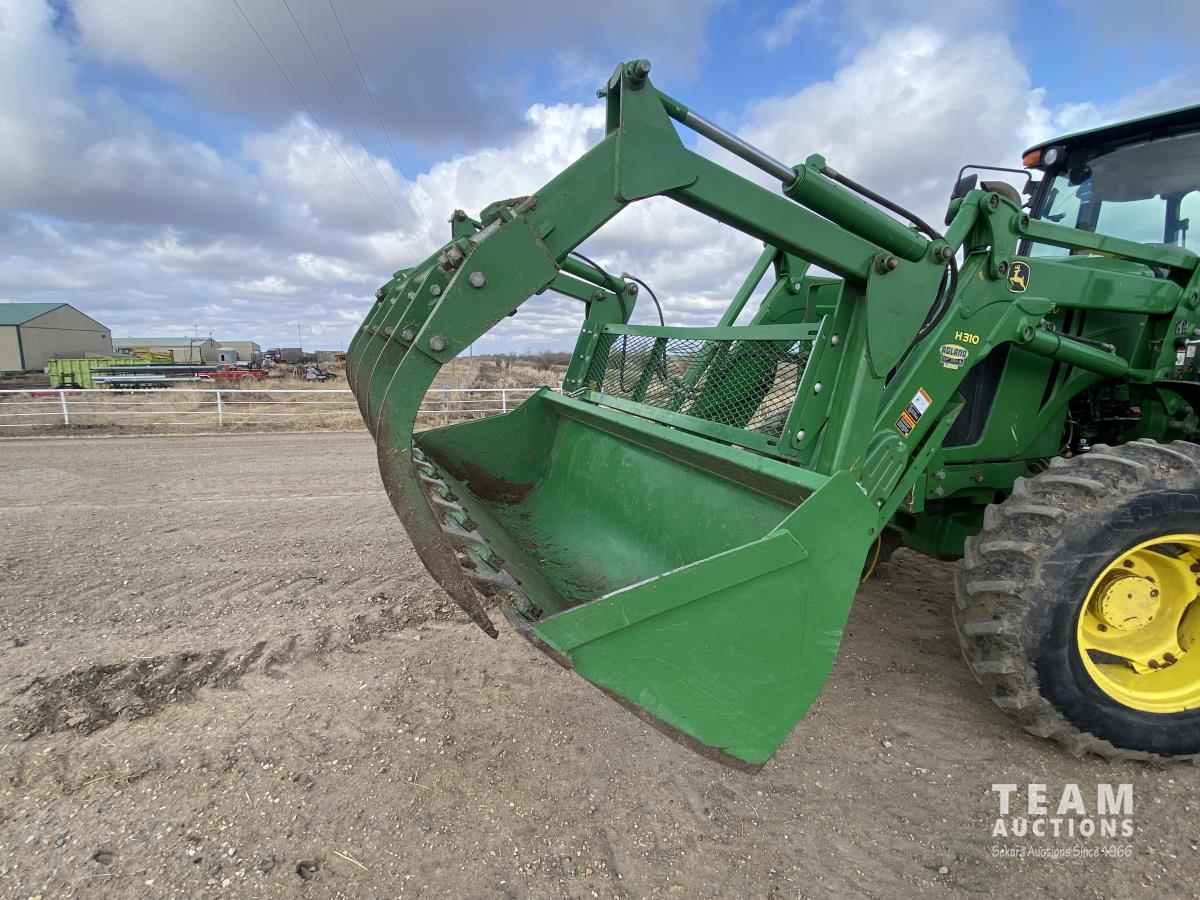 John Deere H310 loader, Q/A, 84 inch bucket, grapple, mid mount hydraulic connection, 4.5 L 4 cylinder 138 HP, diesel engine, 115 PTO HP, 9 speed partial synchro transmission, cab, ROPS, left hand reverser, A/C, air ride seat, joystick, 540/1000 PTO, 3 point hitch, 3 rear hydraulic outlets, drawbar, 14.9-24 front tires, 18.4-38 rear tires