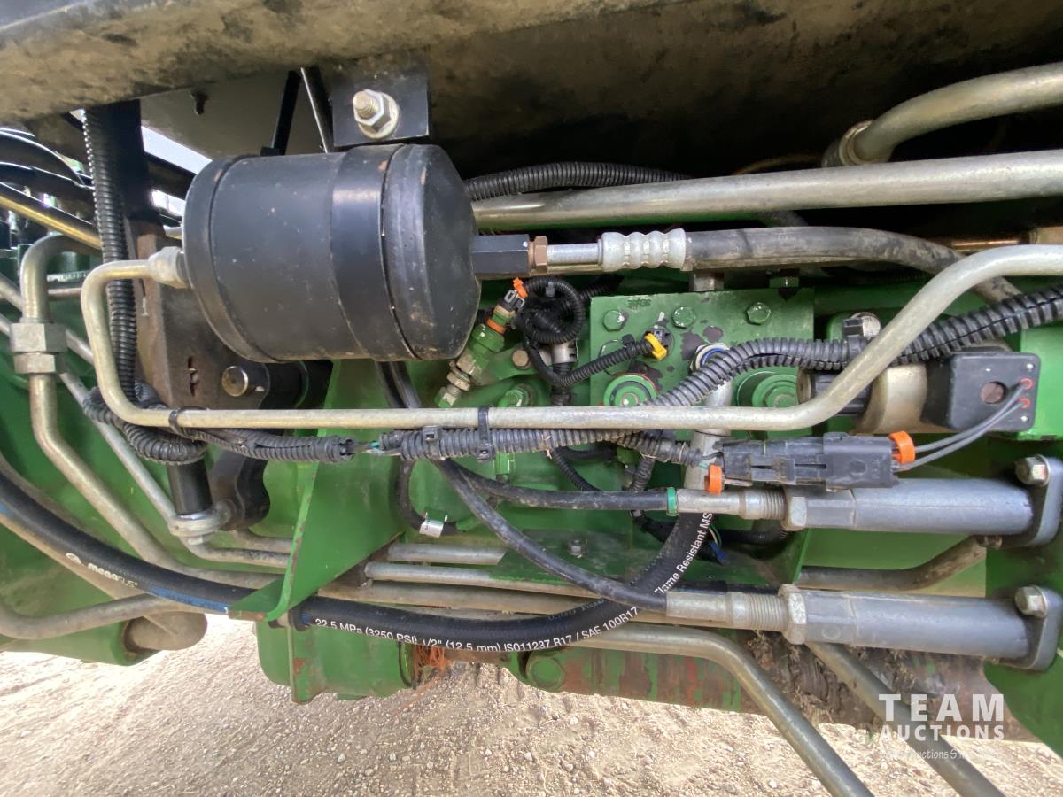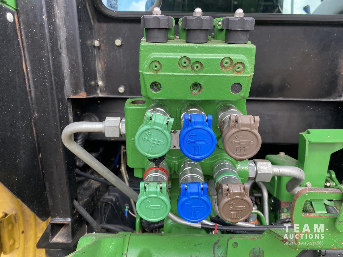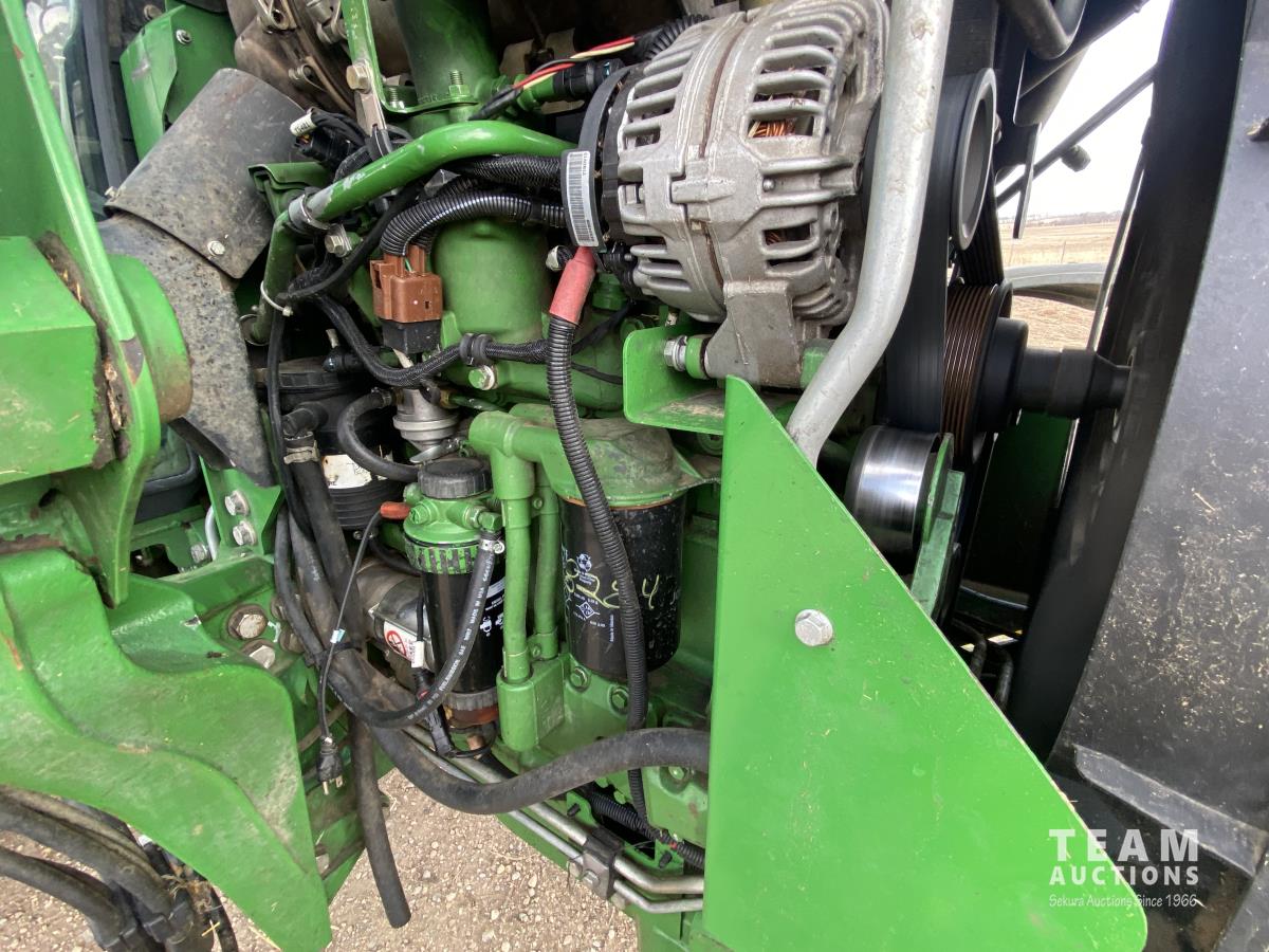 John Deere H310 loader, Q/A, 84 inch bucket, grapple, mid mount hydraulic connection, 4.5 L 4 cylinder 138 HP, diesel engine, 115 PTO HP, 9 speed partial synchro transmission, cab, ROPS, left hand reverser, A/C, air ride seat, joystick, 540/1000 PTO, 3 point hitch, 3 rear hydraulic outlets, drawbar, 14.9-24 front tires, 18.4-38 rear tires