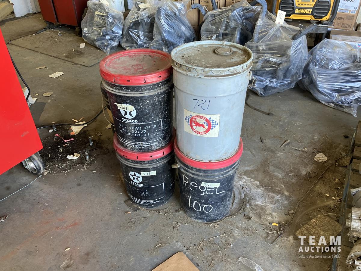 2 pails of Marfack 0 Grease 1 pail of Red Ram universal differential oil 1 pail Regal 100 hydraulic oil