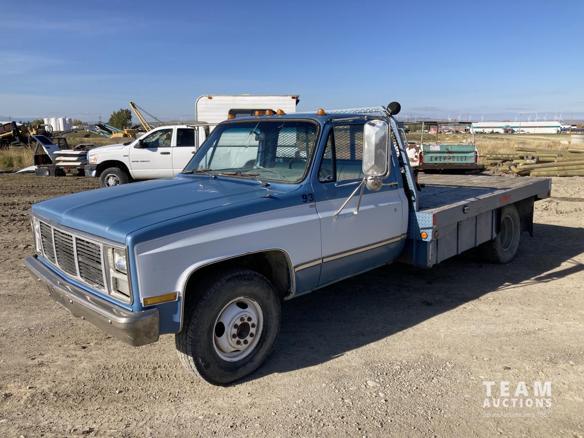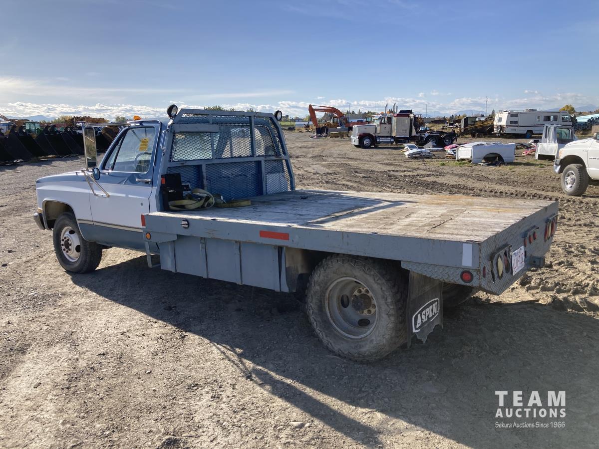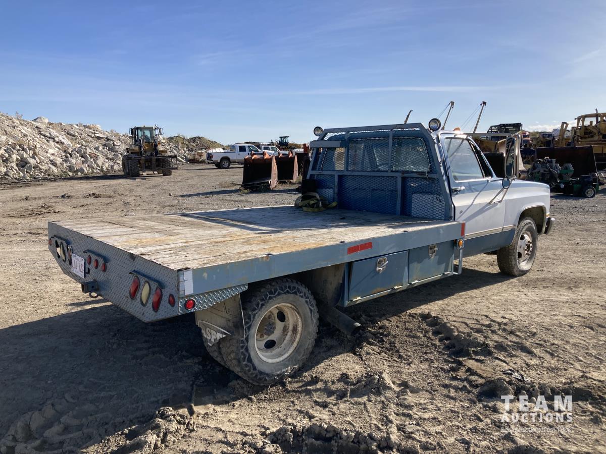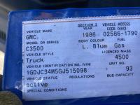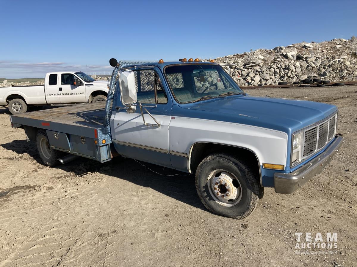 1042 1986 GMC 3500 2WD Regular Cab Dually Flat Deck Truck (Inoperable)