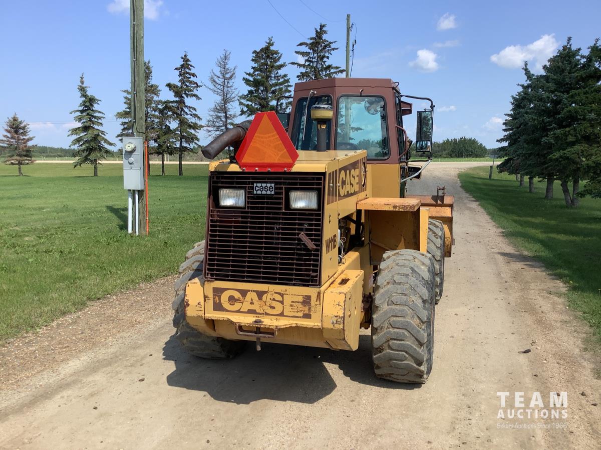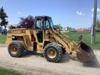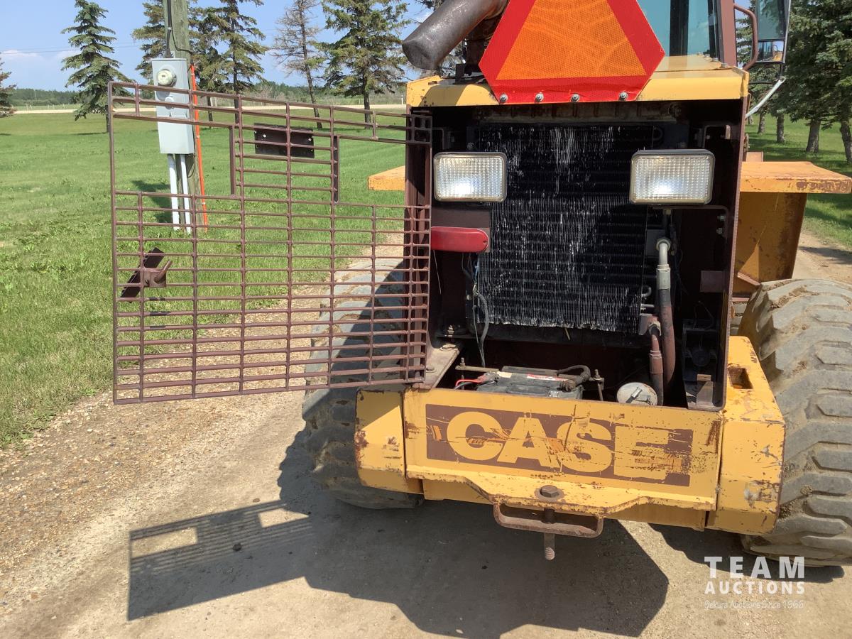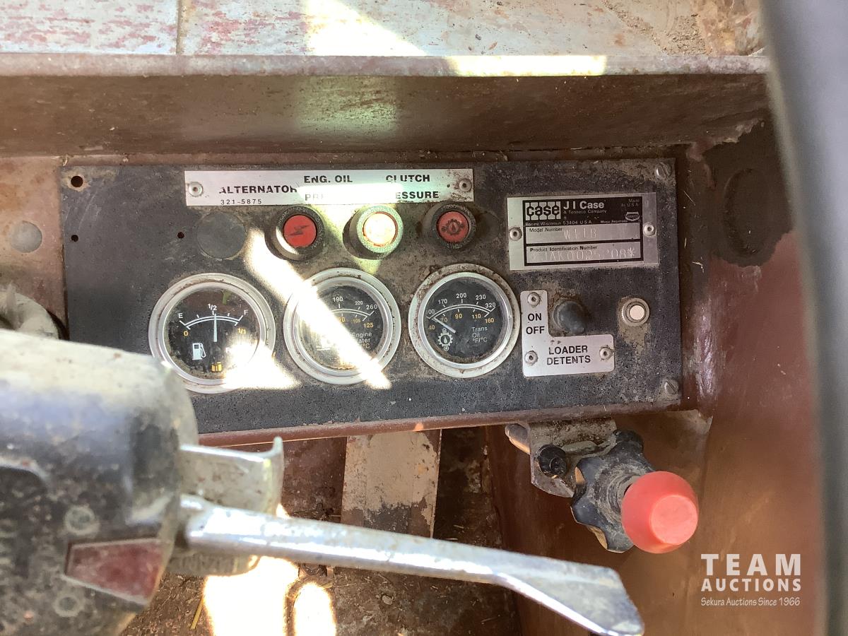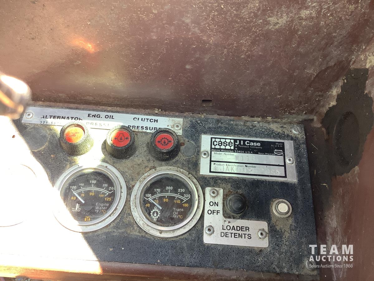 Case 4 cylinder, 390 diesel engine, 3 speed forward and reverse, power shift transmission, inline loader linkage arms for good vision of bucket, integrated hydraulic system, torque proportioning differentials, 4 wheel drive, Sims ROPS cab, heater, tight pins on the loader