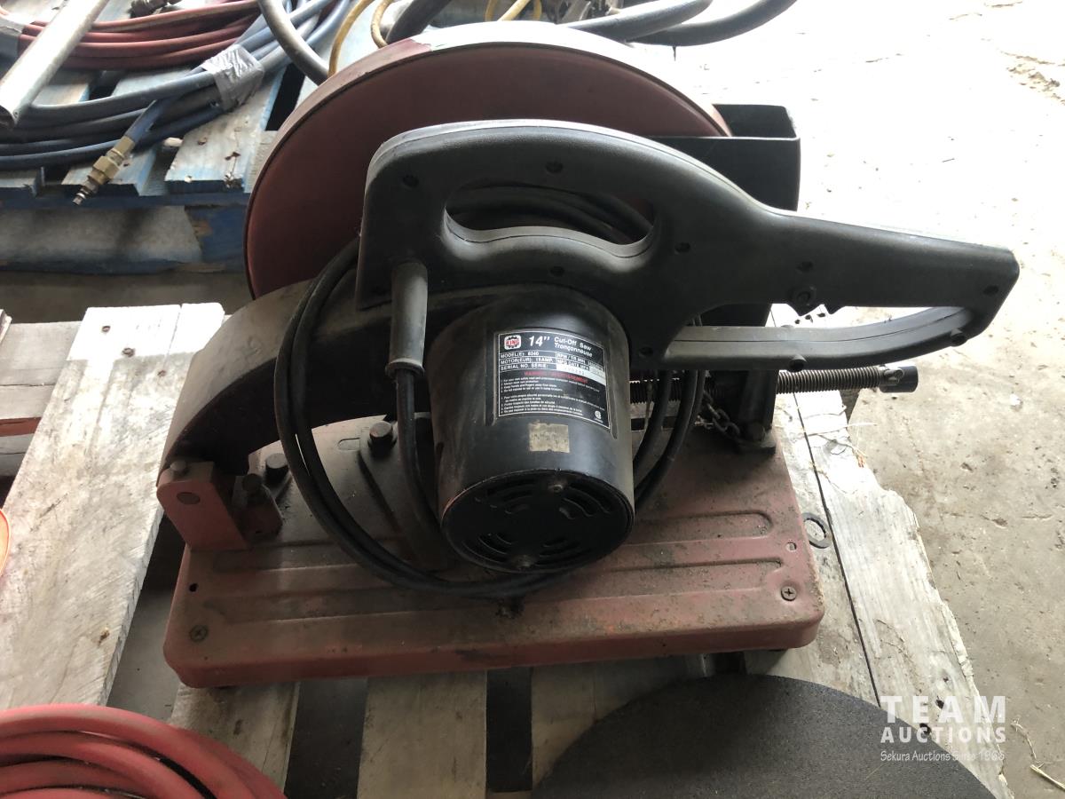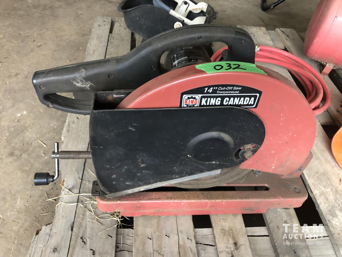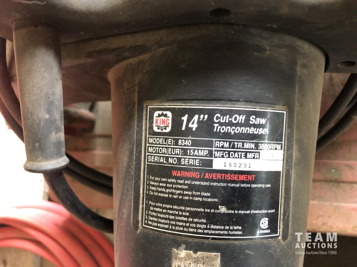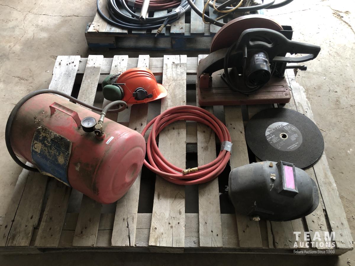 King 14 inch Chop saw, (2) 14 inch chop saw blades, welding helmet, safety hard hat, portable air tank, air hose