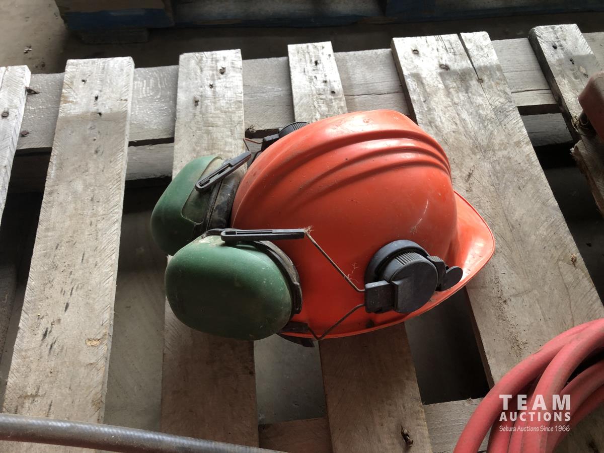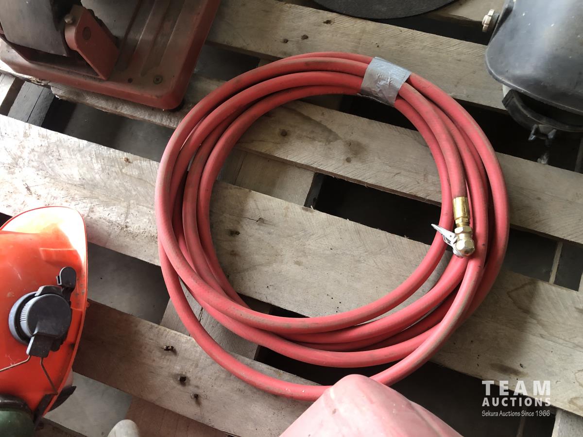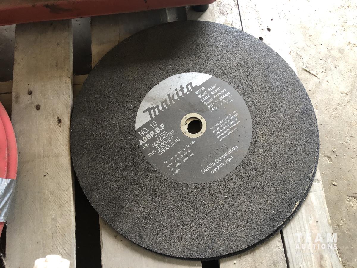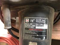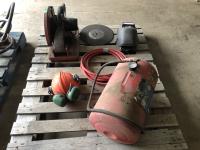 King 14 inch Chop saw, (2) 14 inch chop saw blades, welding helmet, safety hard hat, portable air tank, air hose