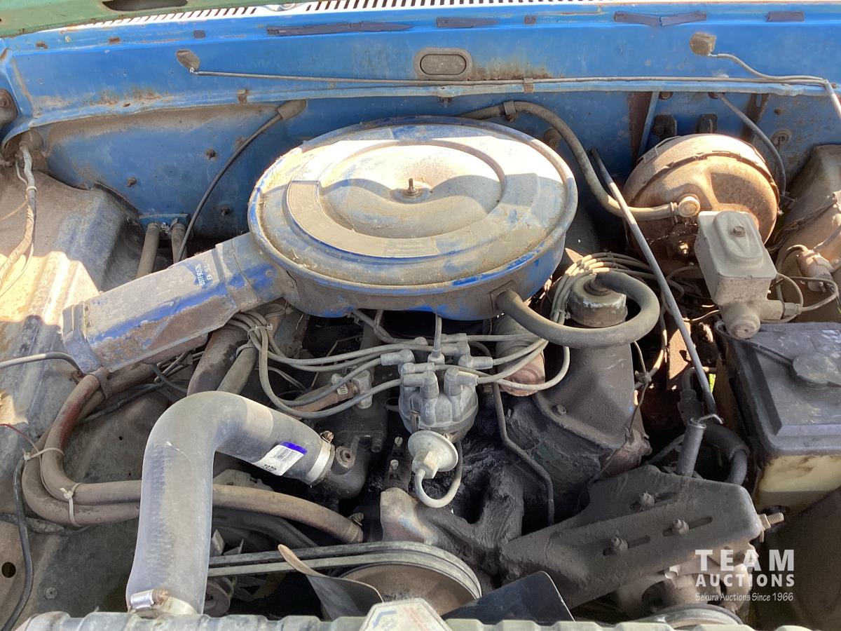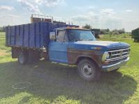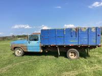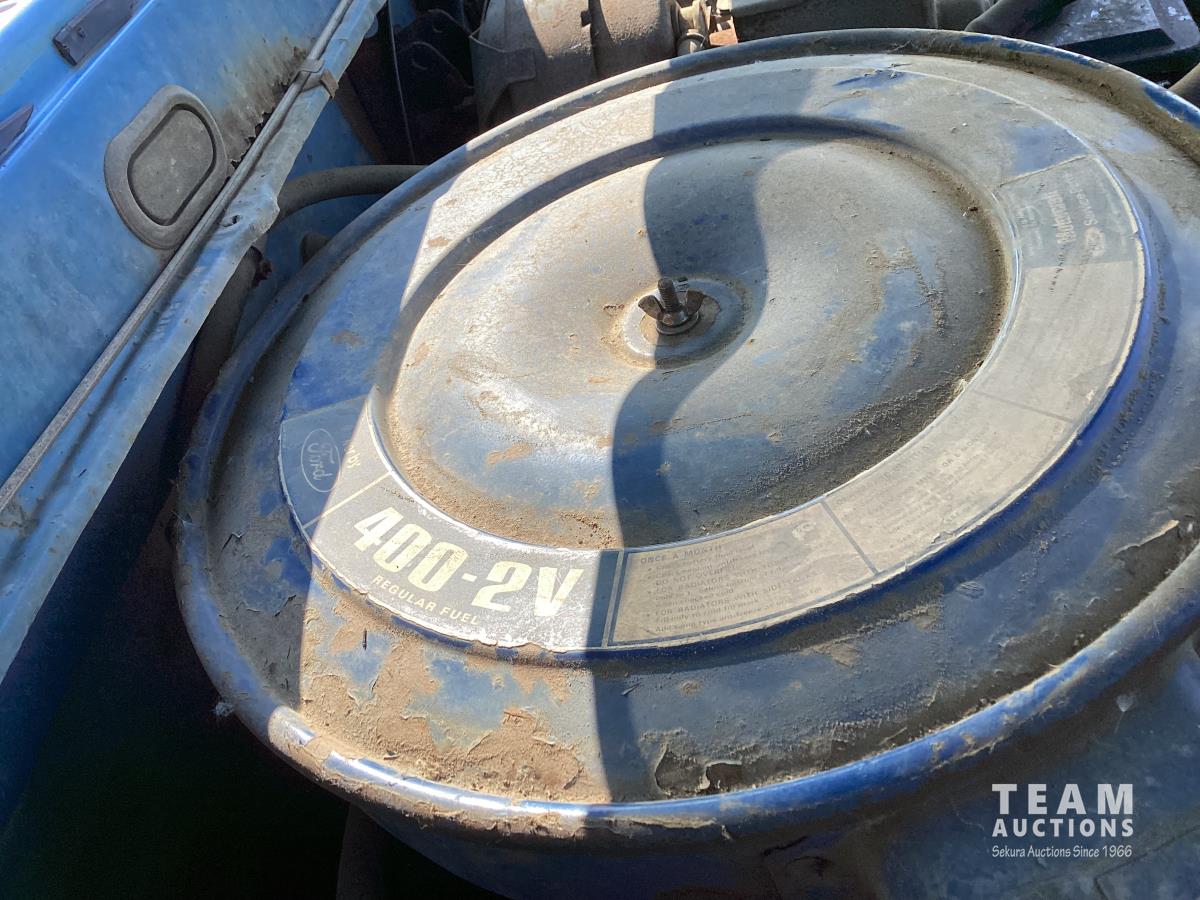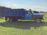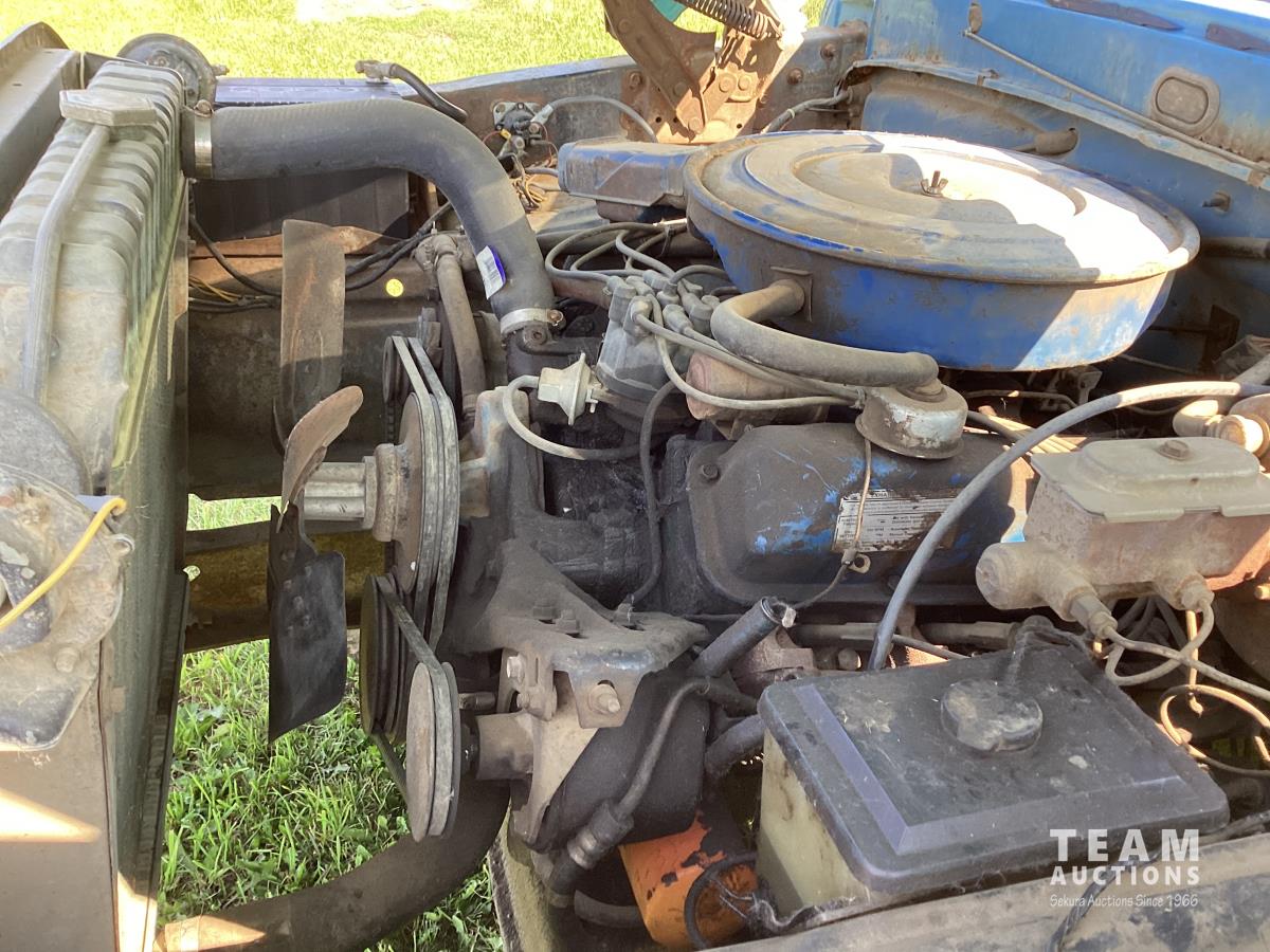 Ford 400 cu in V8 gas engine, 4 speed manual transmission, hoist, 12' wood box, power brakes, power steering, 750-16LT tires