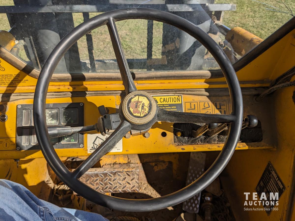 Perkins 4 cylinder diesel engine, 4 speed transmission, left hand reverser, cab, 48 inch pallet forks, pallet fork frame 72 inch wide, 3 stage mast side shift, 180 inch max lift, 15-19.5 front, 13-16.5 rear tires