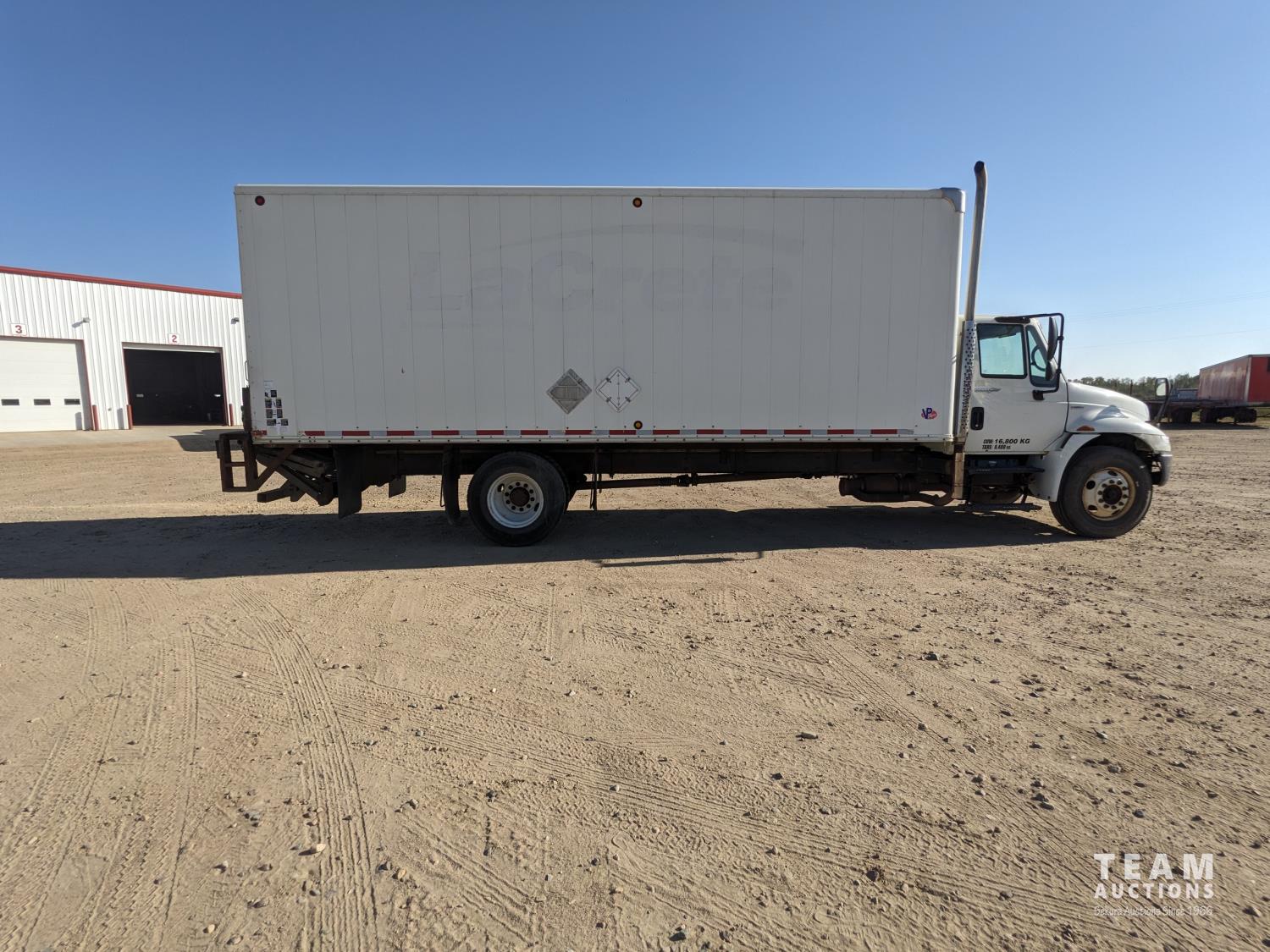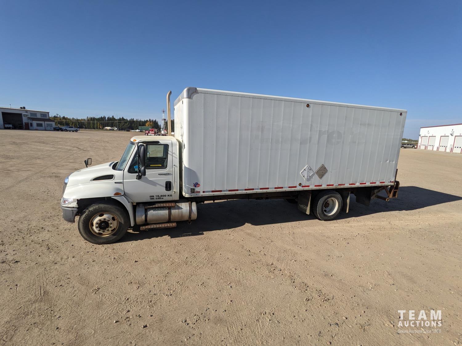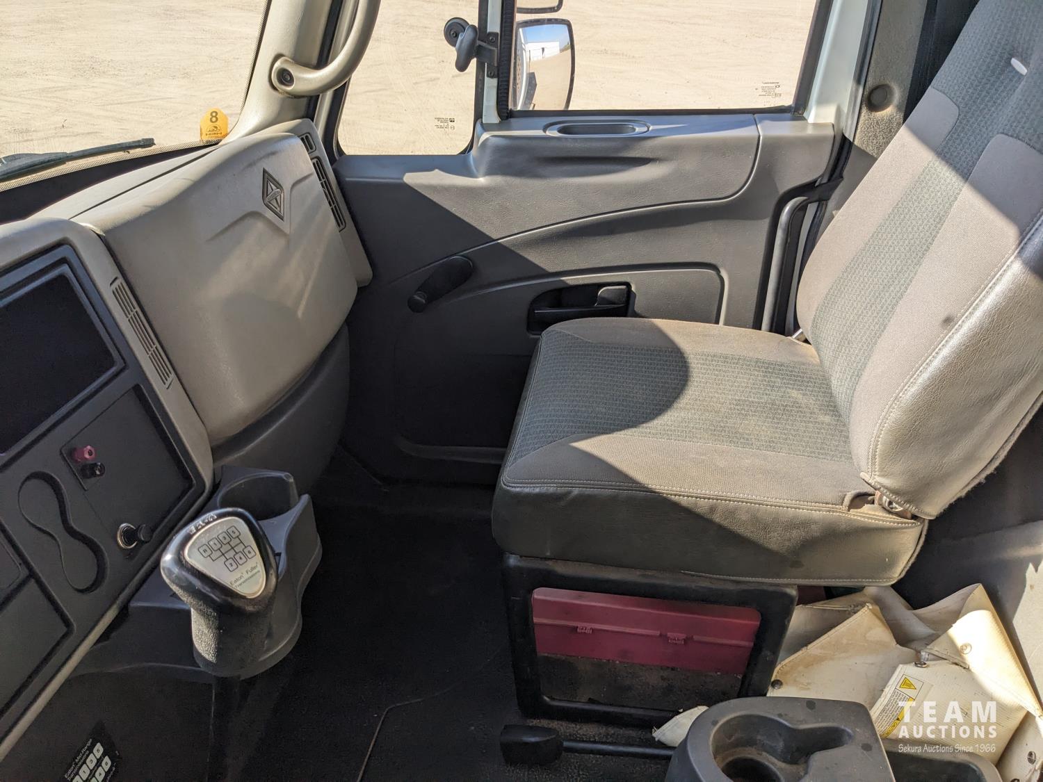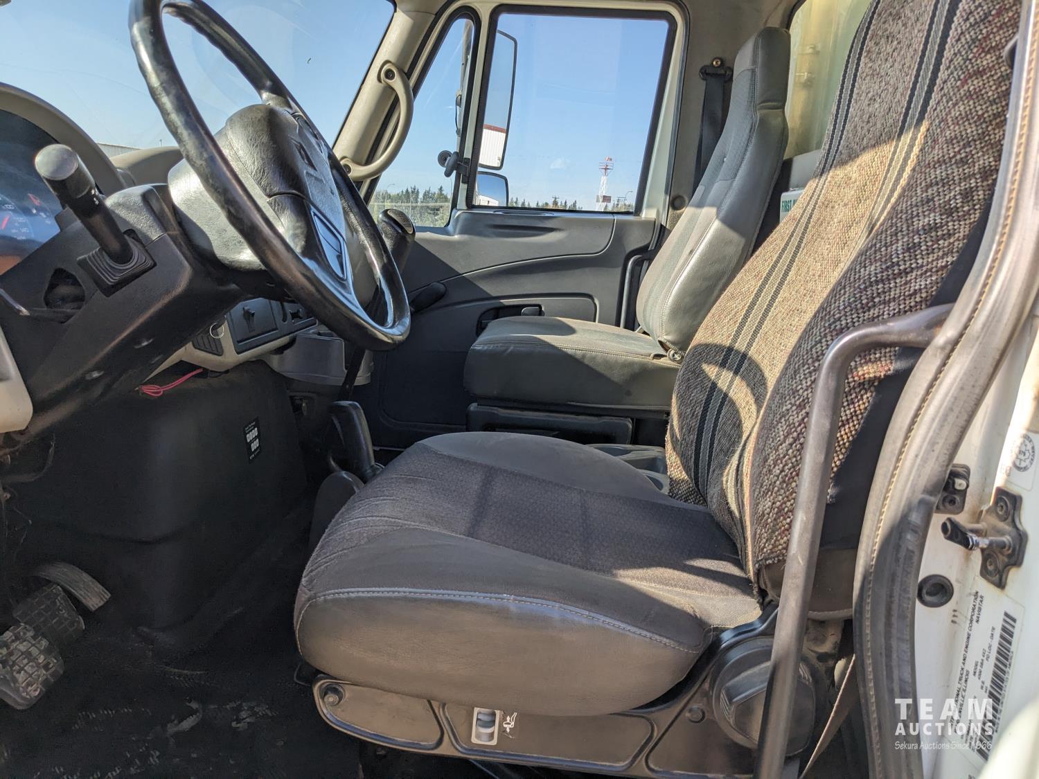 International MaxxForce DT 7.6 6 cylinder 225 HP diesel engine, engine heater, engine brake, positive air shutoff, Eaton Fuller 6 speed manual transmission, A/C, cruise control, air ride driver seat, radio, CB radio, 2-way radio, stereo, 24 ft van, 96 inch wide, 94" high, rear lift tailgate, spring suspension, 10,000 lb front axle, 19,000 lb rear axles, 254 inch WB, 11R22.5 tires