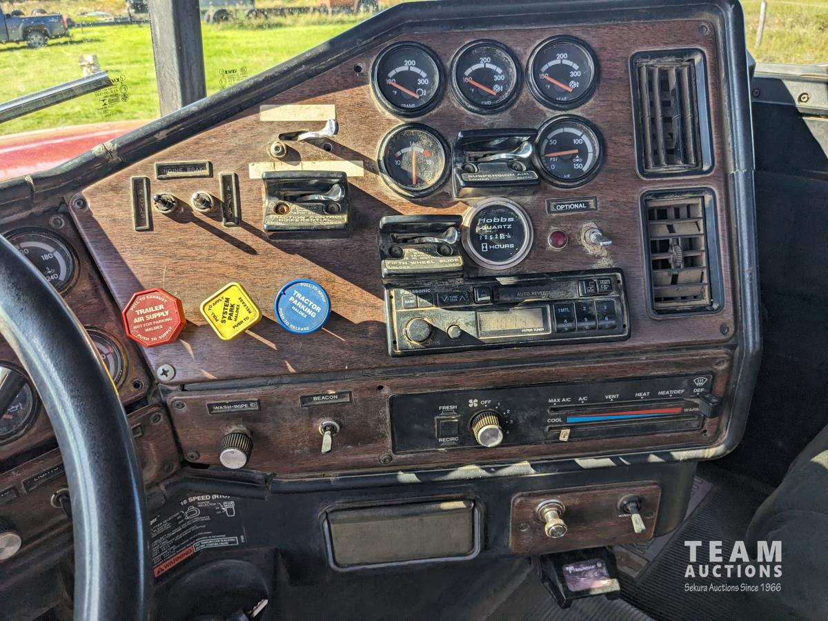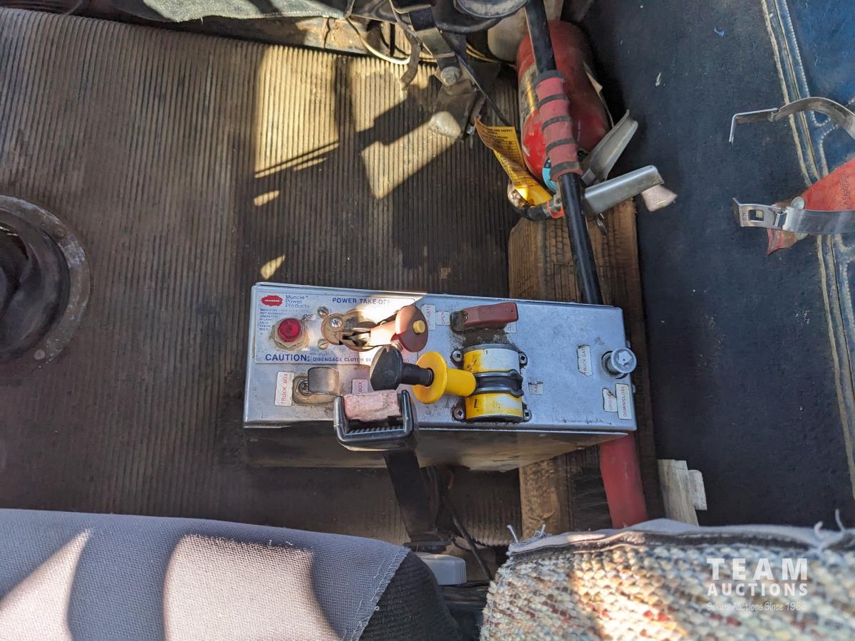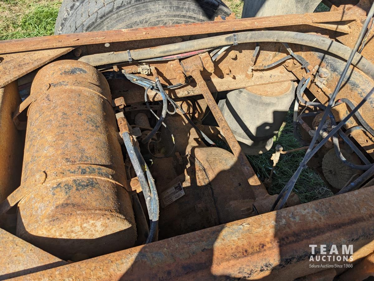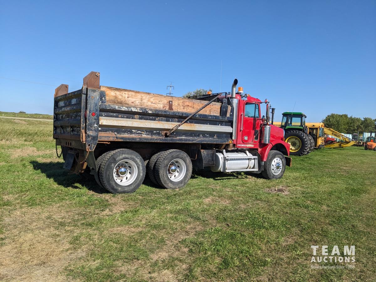 Cummins N14 14 L 6 cylinder diesel engine, Eaton Fuller 18 speed manual transmission, hydraulic wet kit, Midland 14 ft gravel box, tarp, air ride suspension, 12,000 lb front axle, 40,000 lb rear axles, 3 way diff locks, 196 inch WB, all aluminum wheels, 315/80R22.5 front tires, 11R22.5 rear tires
