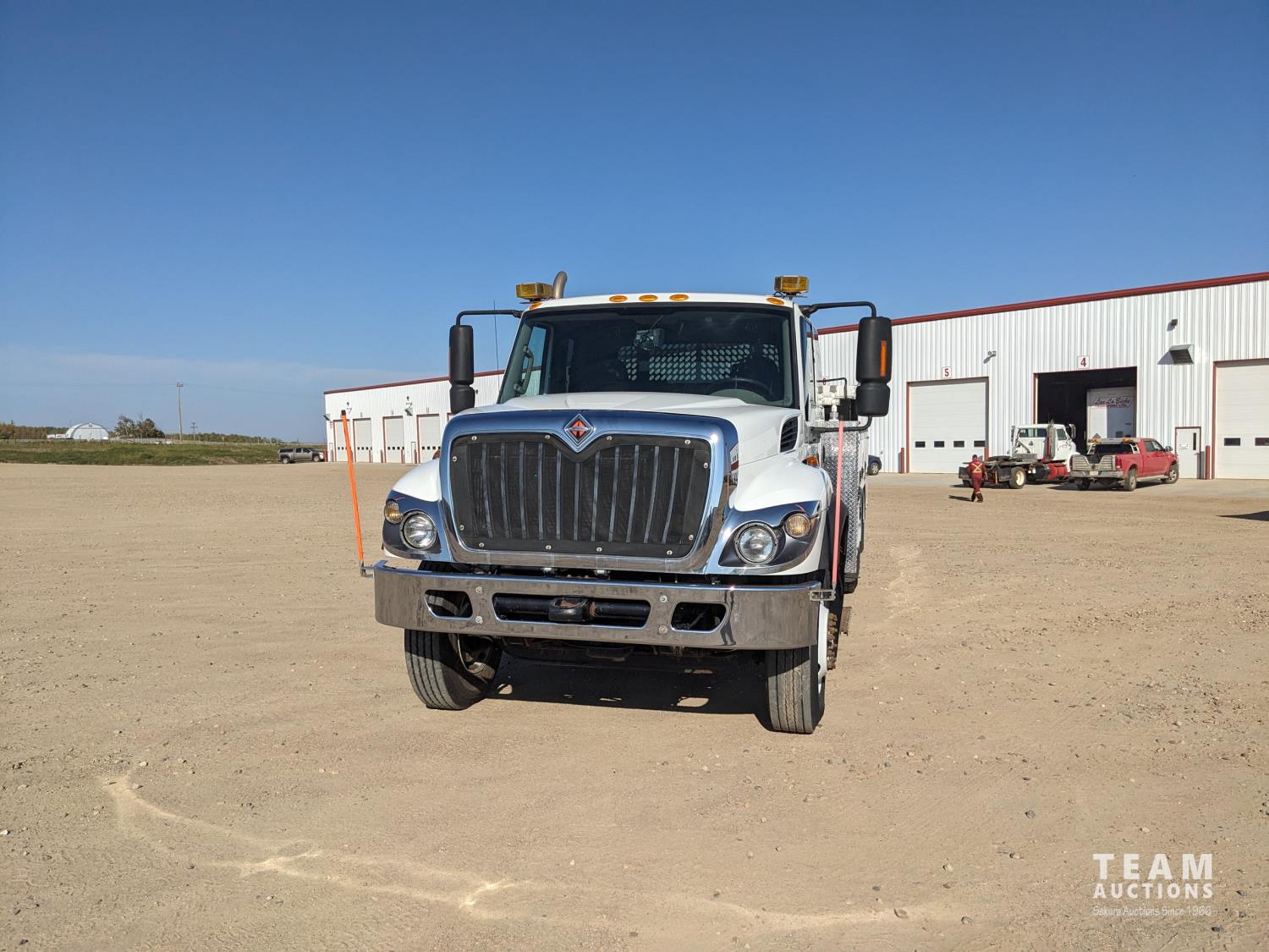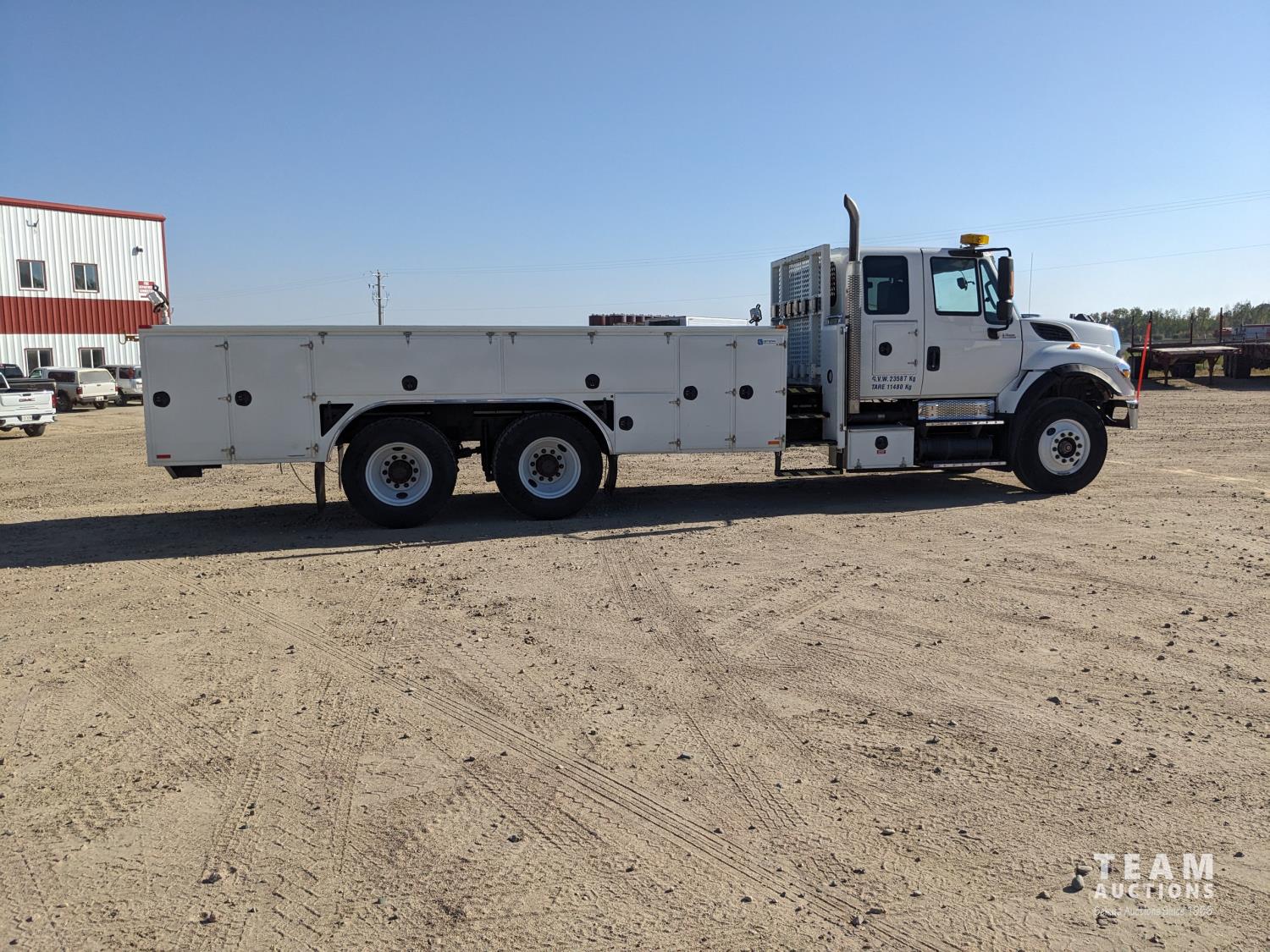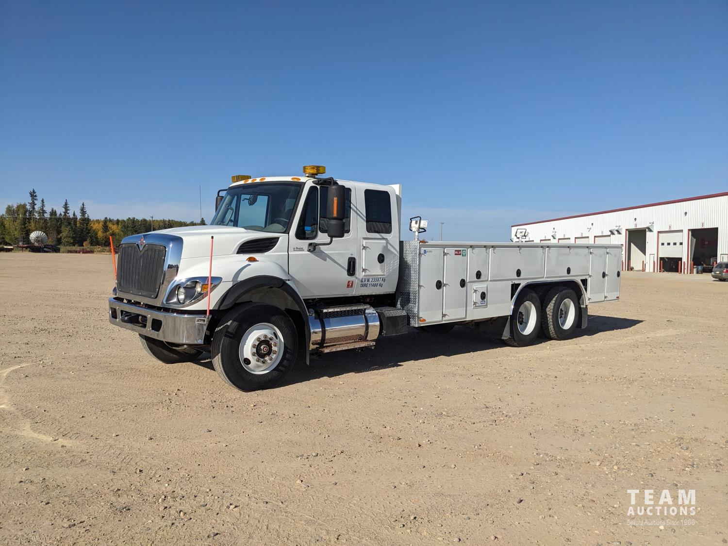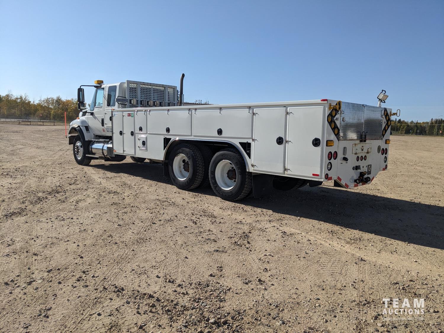 International 7.6 L 6 cylinder 300 HP diesel engine, automatic transmission, A/C, cruise control, air ride seats, radio, stereo, P/L, P/W, P/Mirrors electric brake controller, , air ride cab, General 21 ft service body, beacon lights, work lights, air ride suspension, 12,000 lb front axle, 40,000 lb rear axles, full lockers, 242 inch WB, rear pintle hitch, 11R22.5 front tires