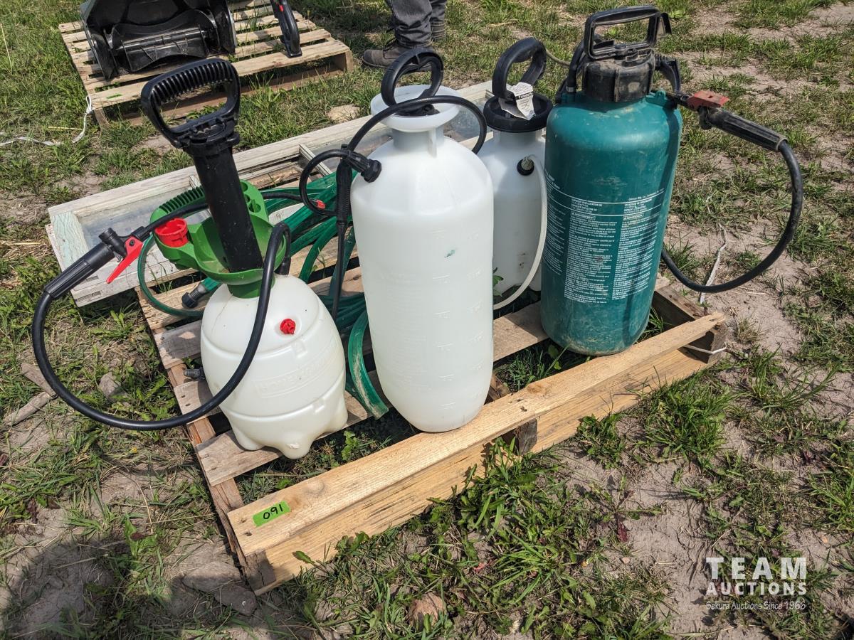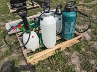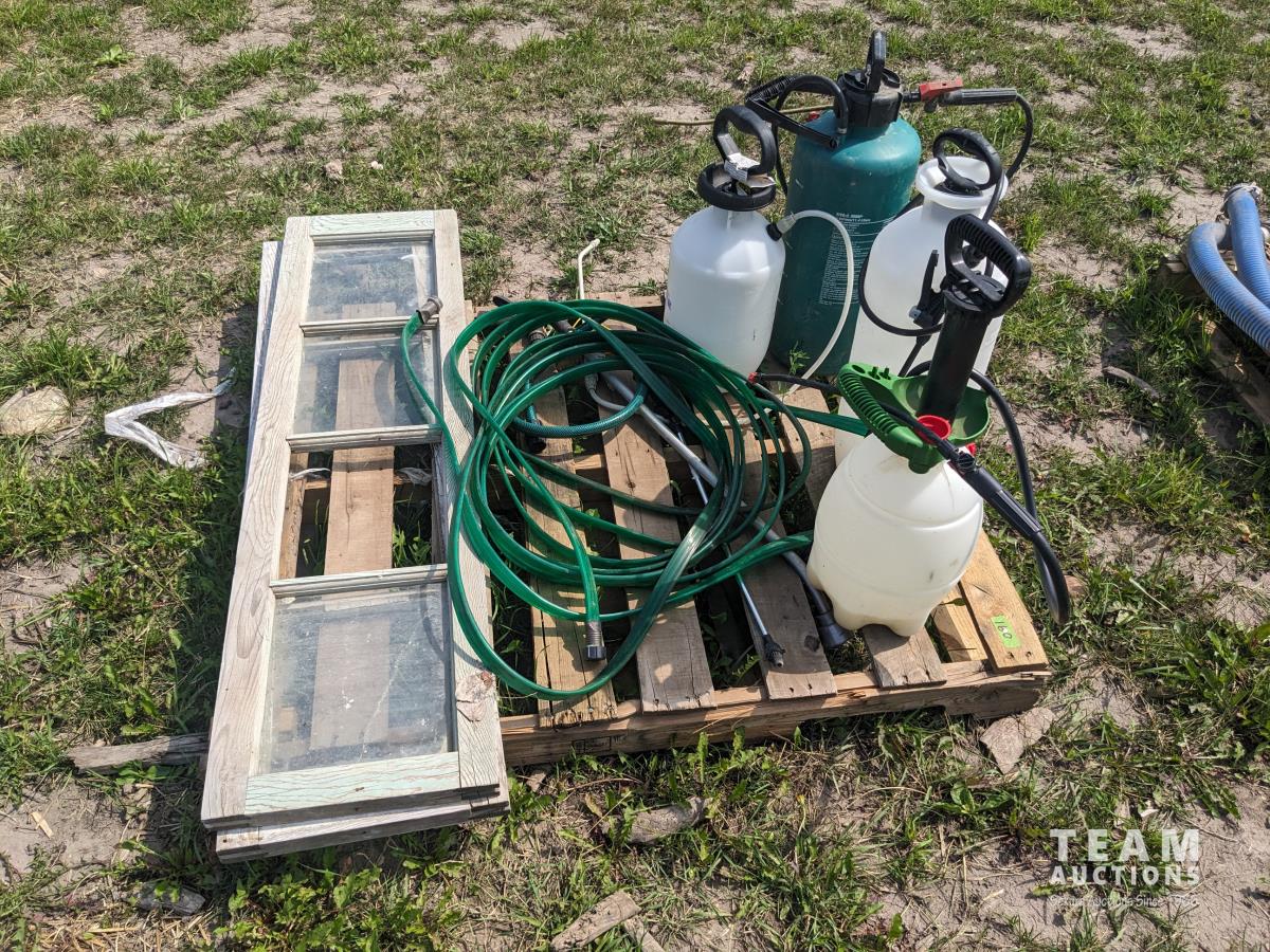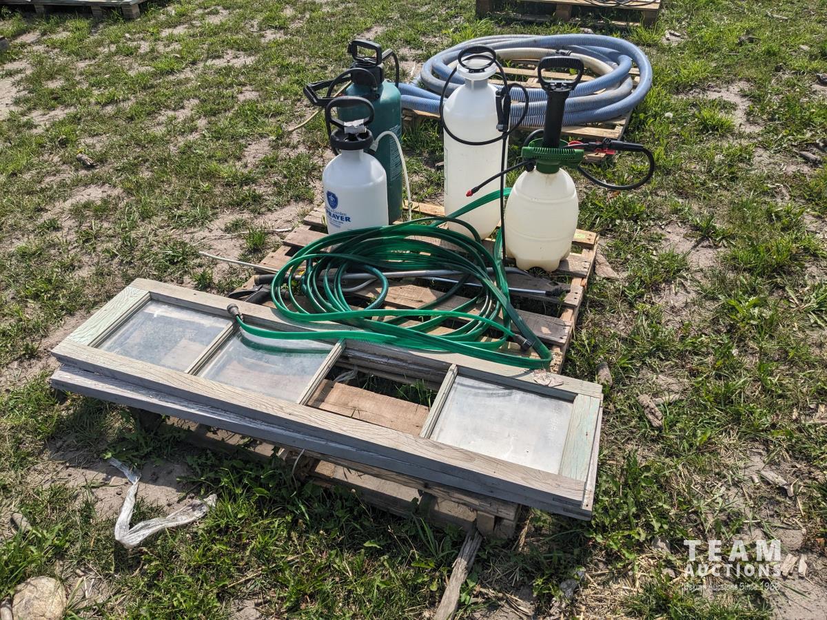 94 (4) Hand Sprayers, (2) 14 X 52 Inch Vintage Windows, Garden Hose with Sprayers