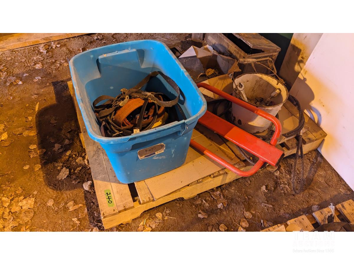 (2) Vintage Ammo boxes, box of 5 inch nails, hand post pounder, ratchet straps and slings, miscellaneous tools