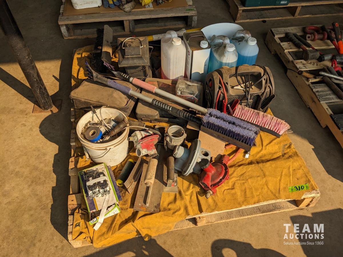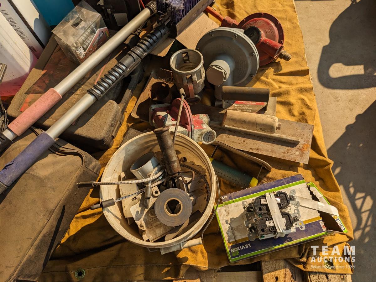 Cement trowels, electric stapler, Skil jig saw, 12V jump starter, miscellaneous shop fluids, miscellaneous items