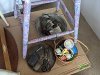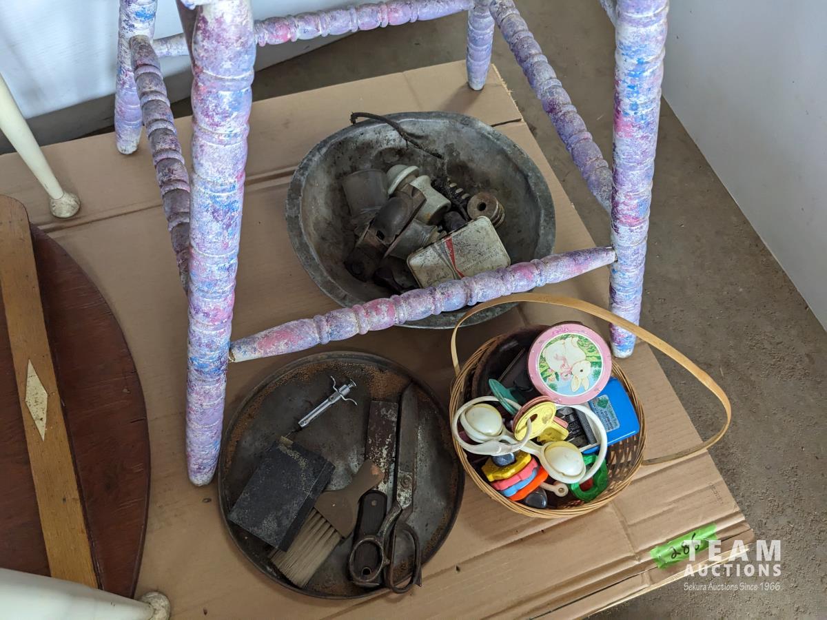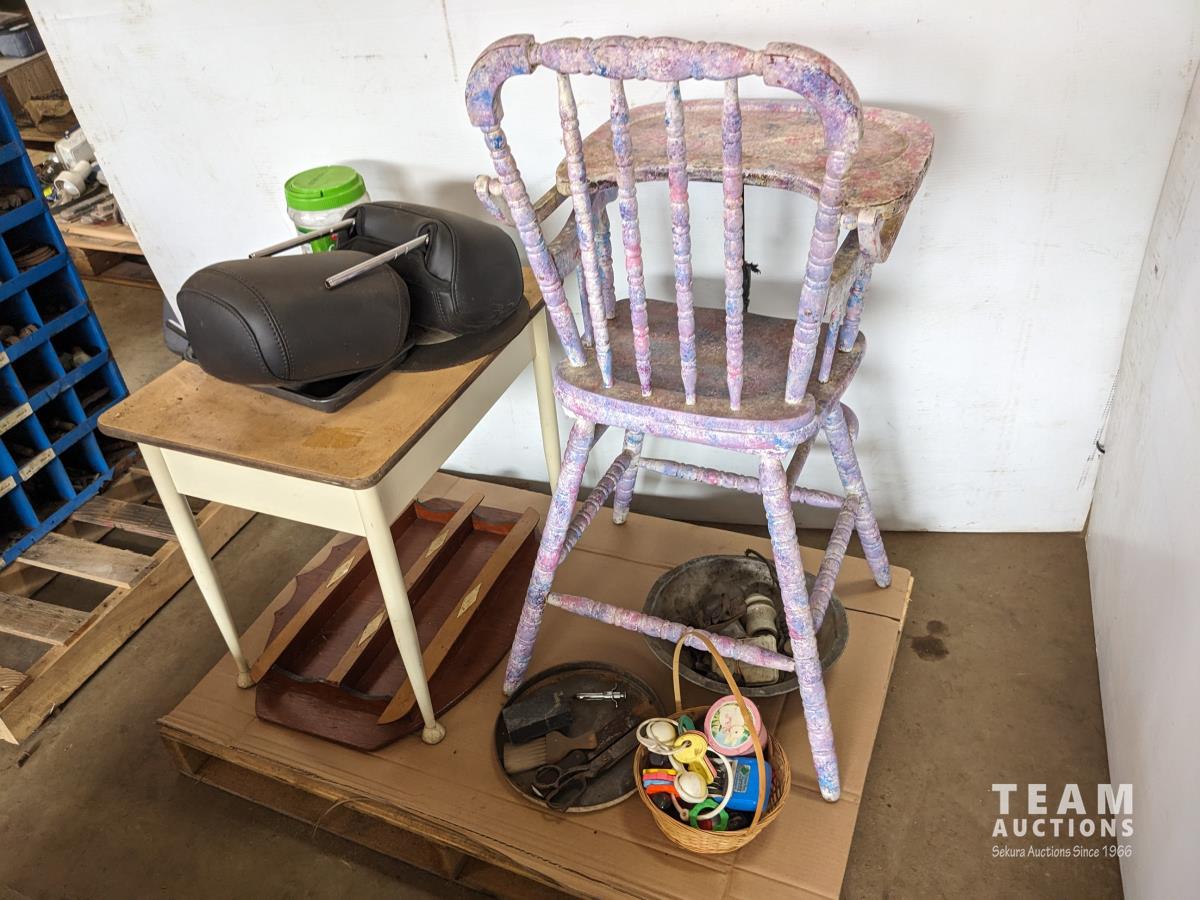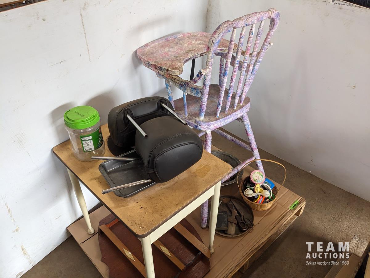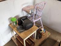 355 Child's High Chair, Vintage Scissors, (2) Car Head Rests, Small Table