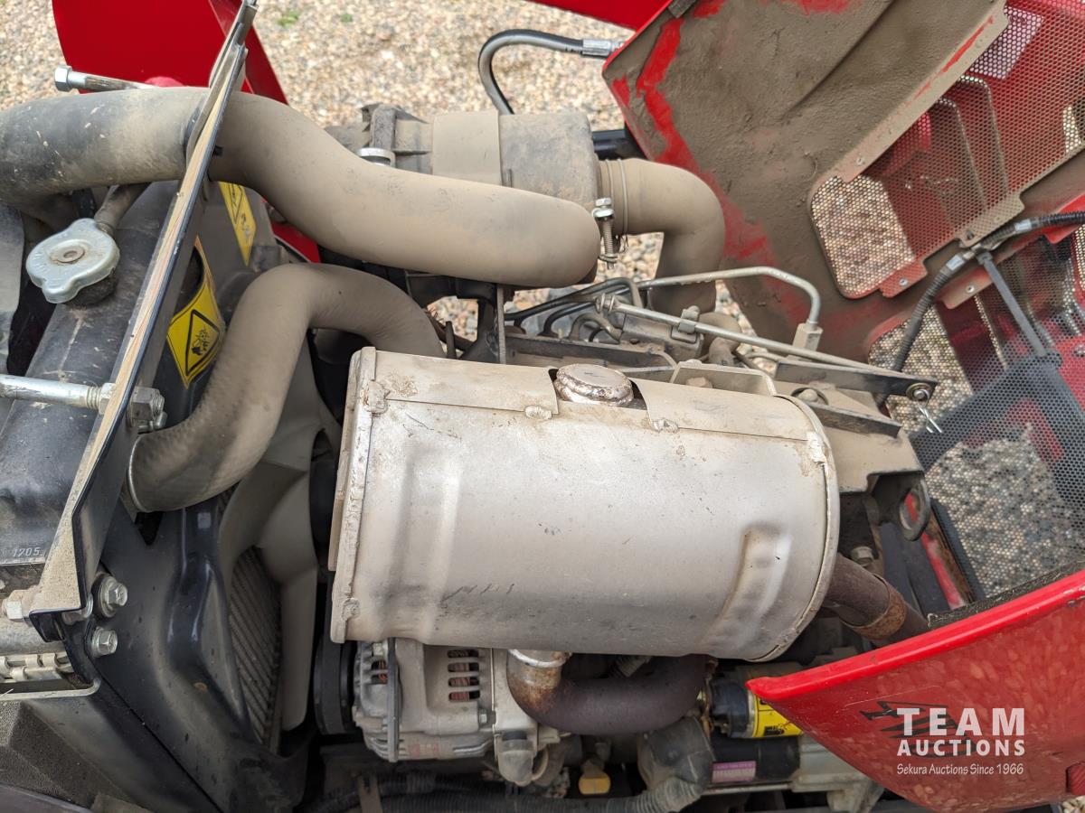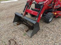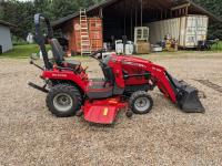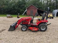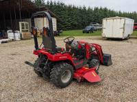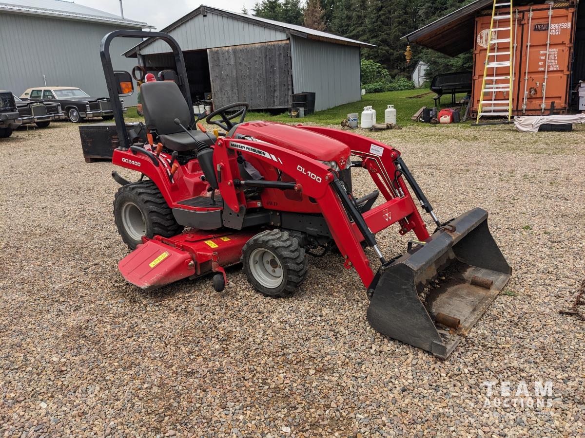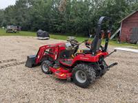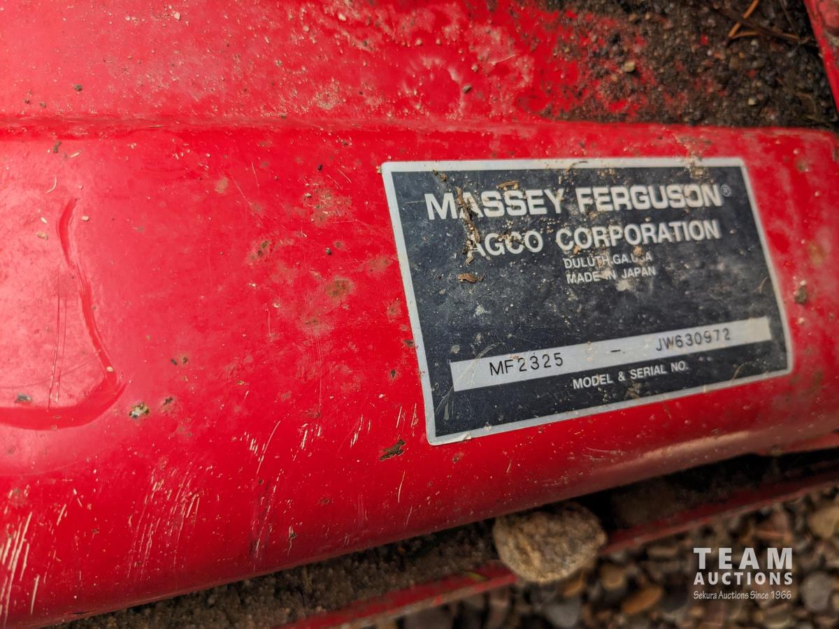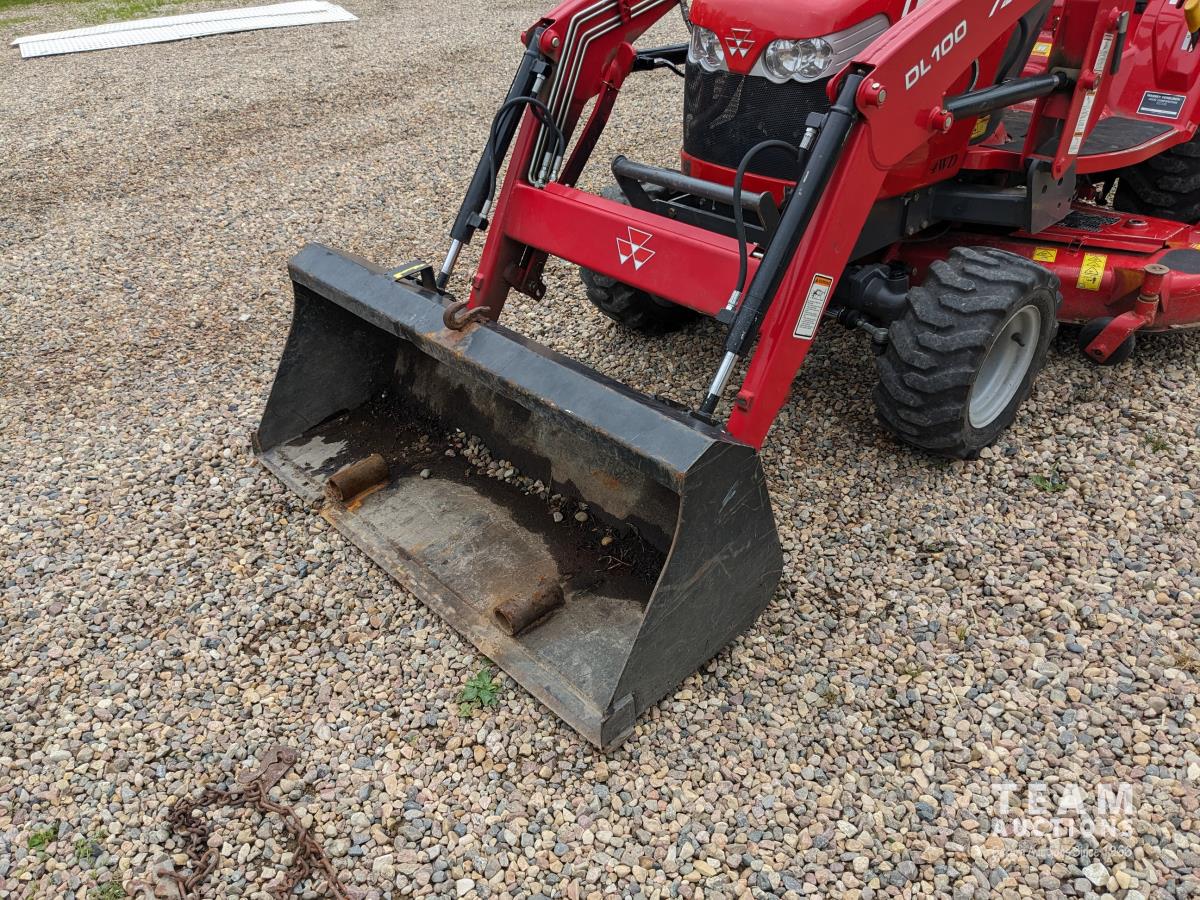 Massey Ferguson DL100 loader, 48 inch bucket, Iseki 1.1 L 3 cylinder 22.5 HP, diesel engine, 18.7 PTO HP, hydro 2 range transmission, 540 PTO, 3 point hitch, 18X8.50-10 front tires, 26X12.00-12 rear tires, tire chains, MF2325 60 Inch mower deck
