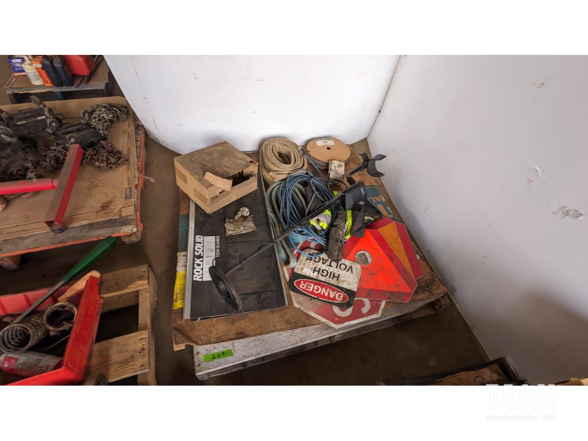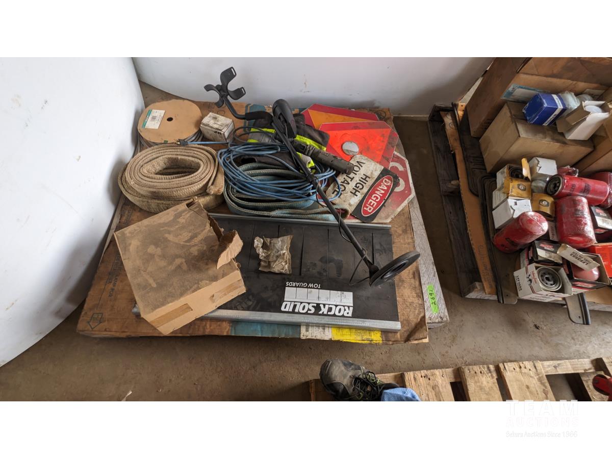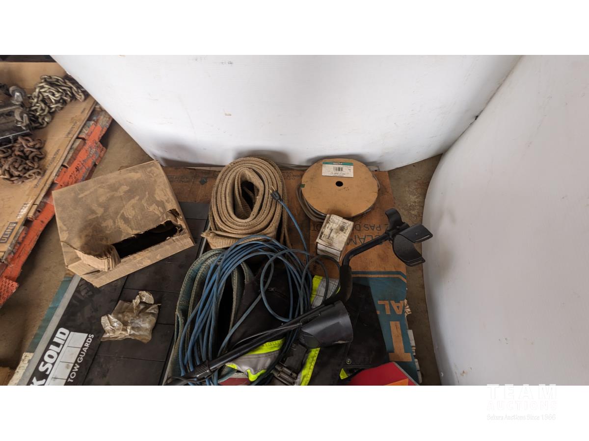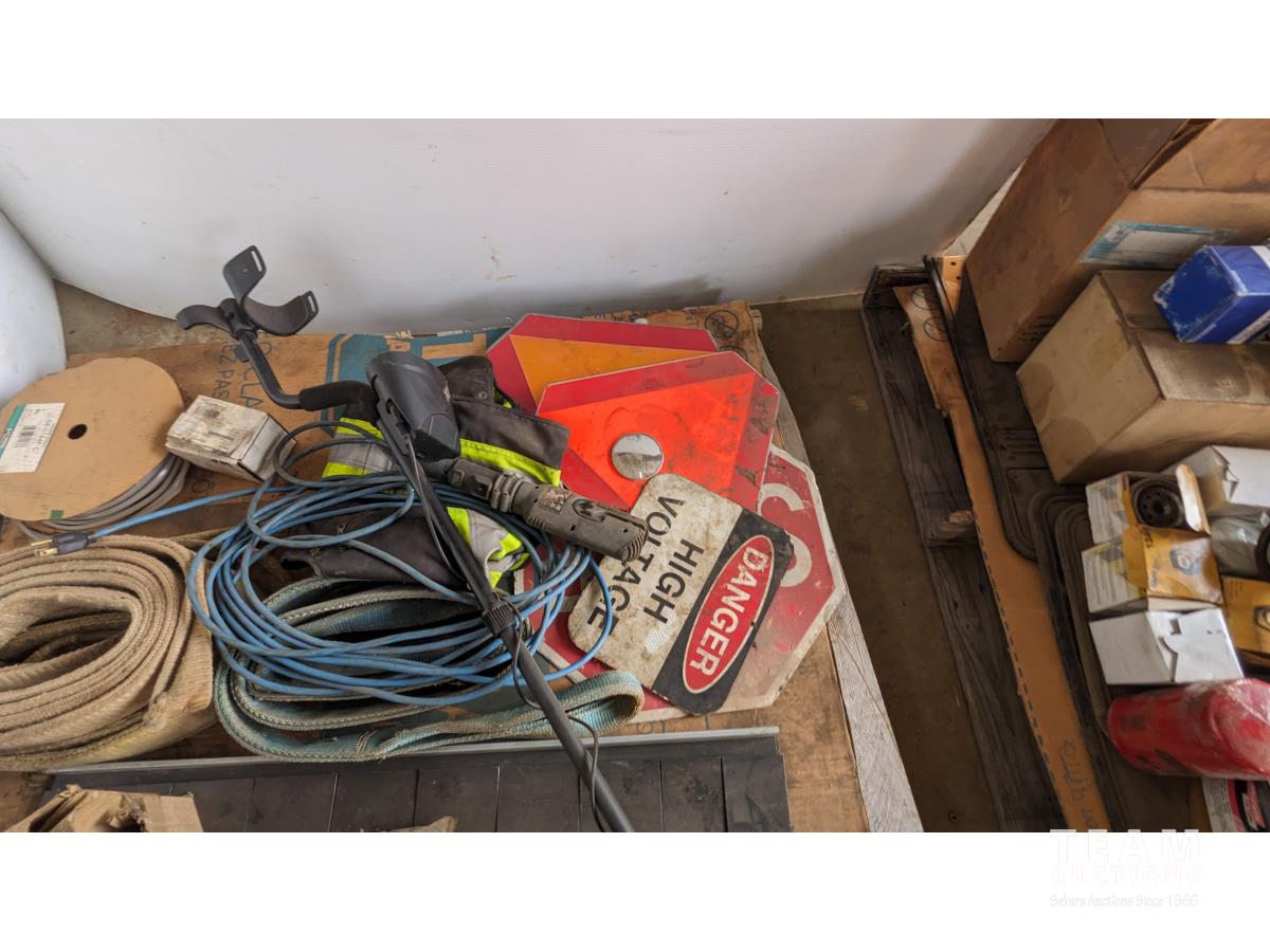 Qty of slow moving signs, (2) slings, (2) tow guard mud flaps, metal detector, Hi viz vests, trouble light