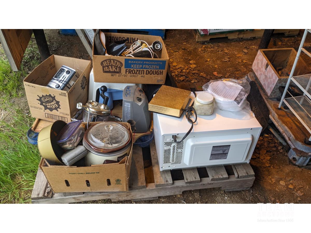 Microwave, cooking items, miscellaneous household items