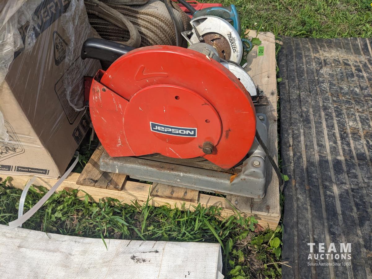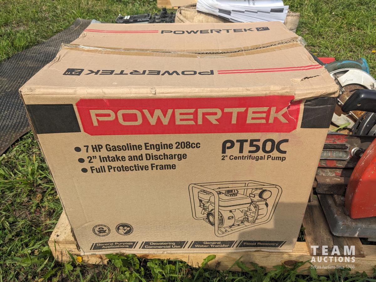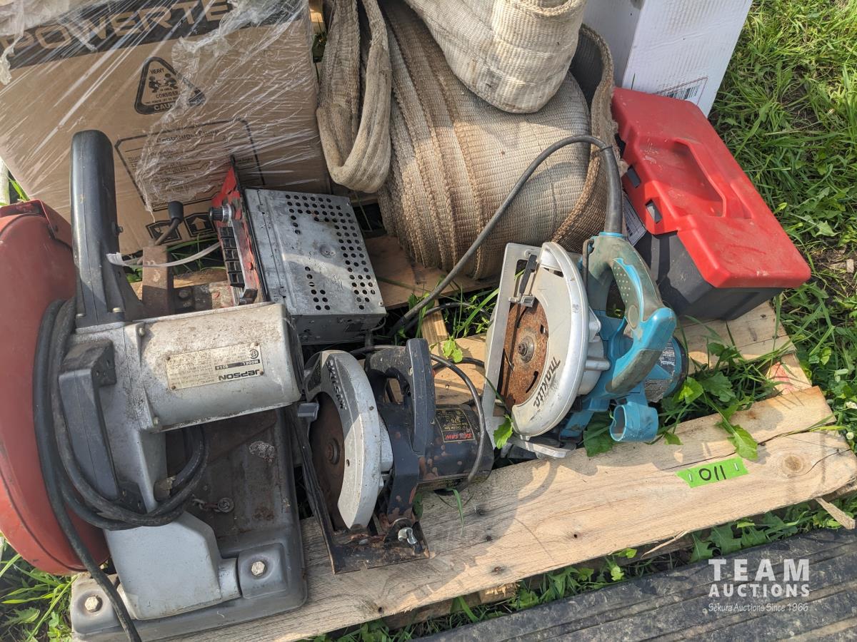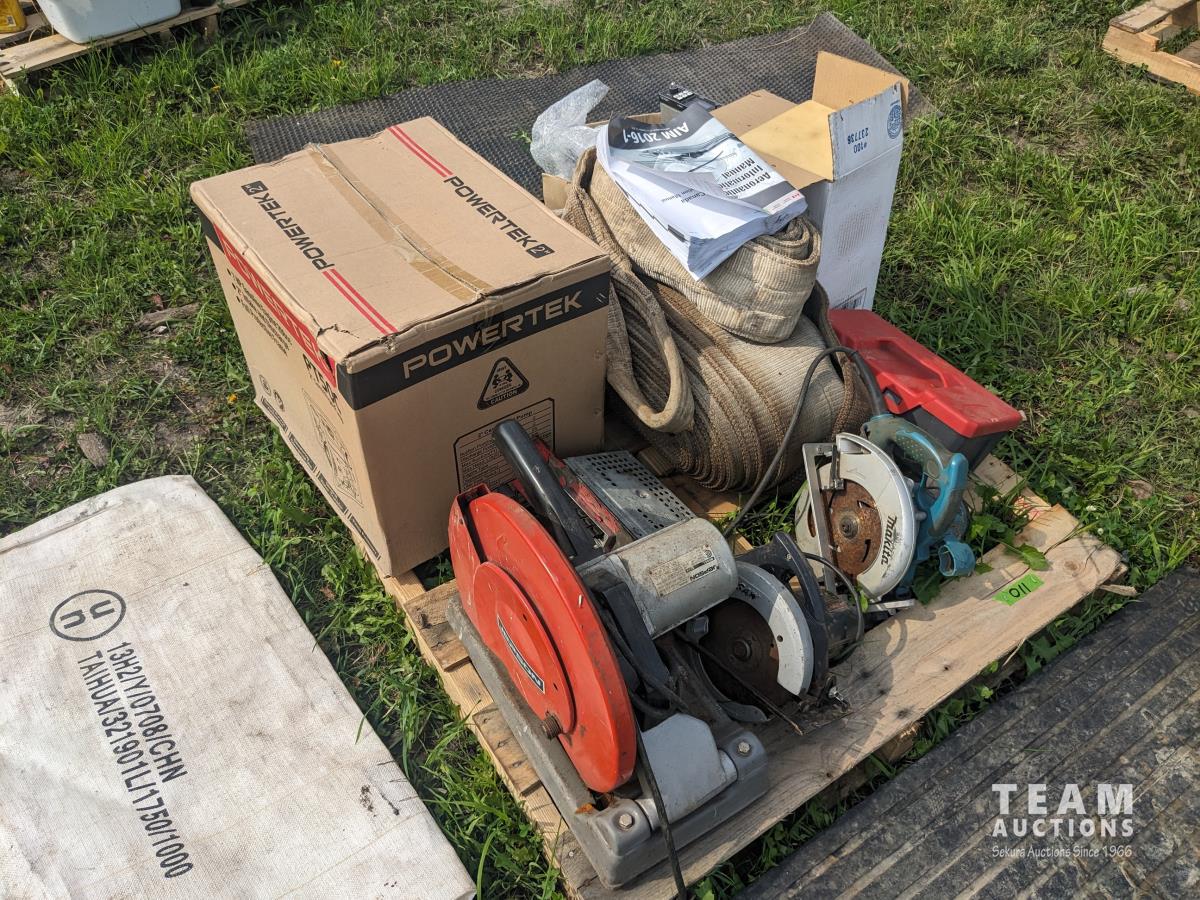 (2) circular saws, 14 inch chop saw, (6) 2 way radios, aviation compass, lifting strap, unused 7 HP Powertek 2 inch water pump with gas engine