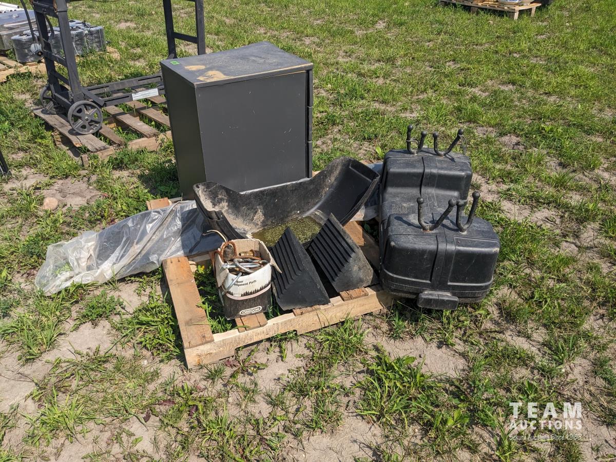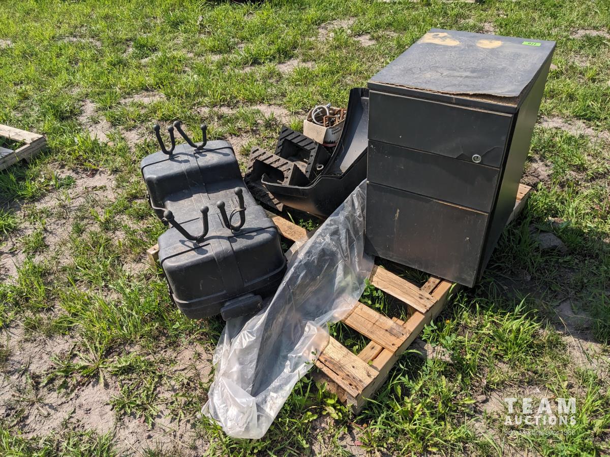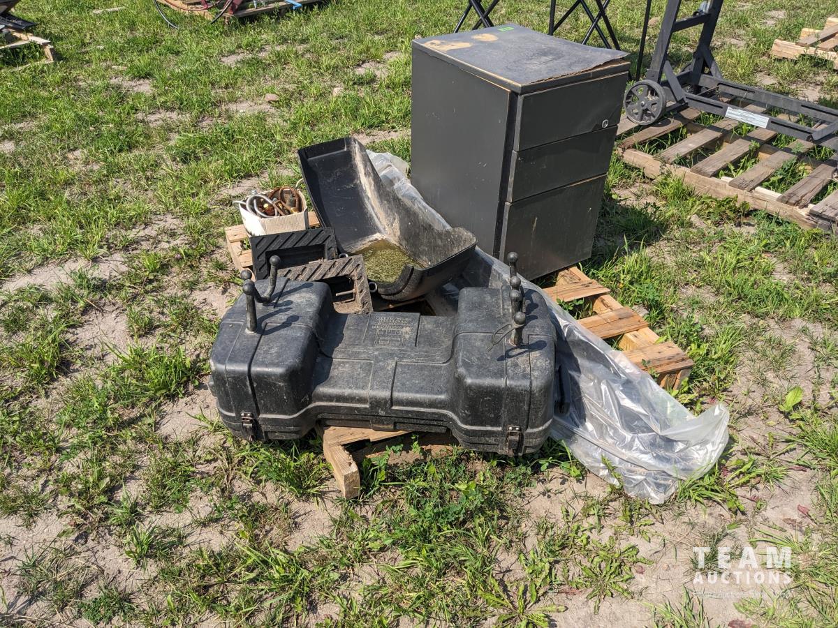 113 Quad Box, (2) Trailer Fenders, U Bolts and Brass Fittings, Three Drawer Cabinet