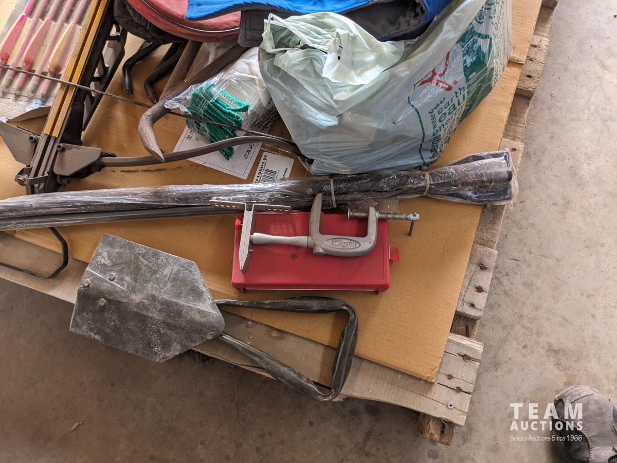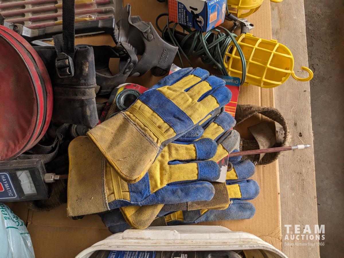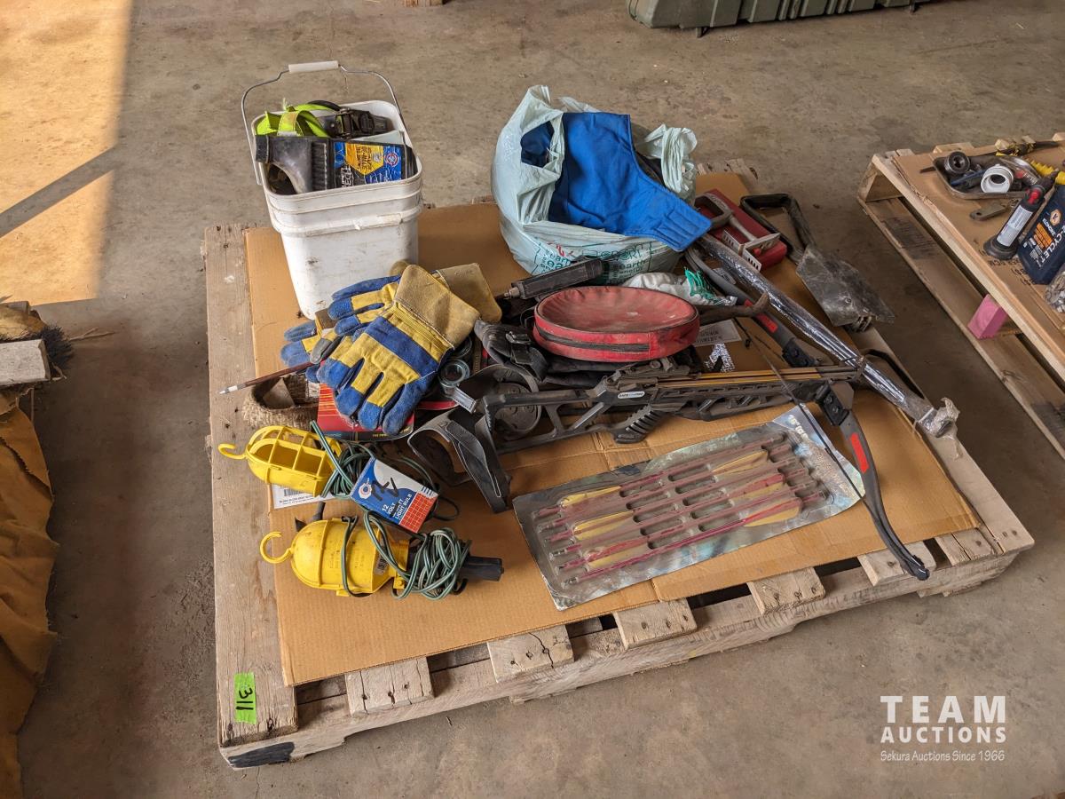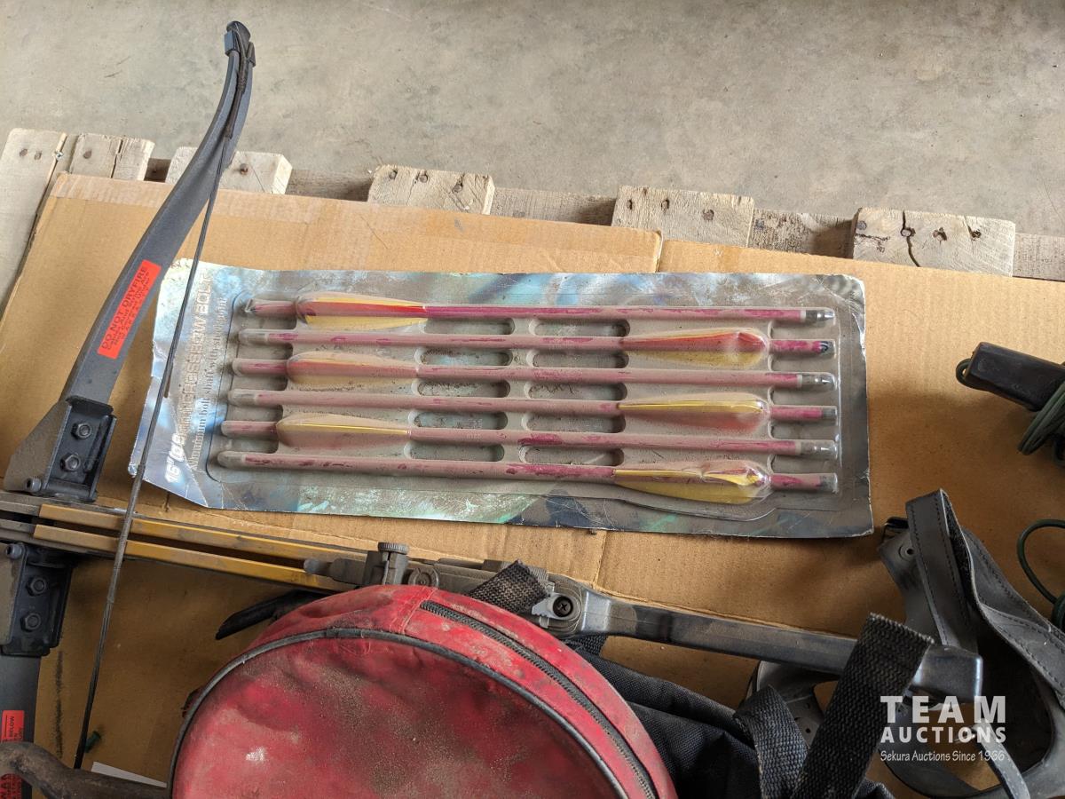 Cross bow arrows (unused), Crossbow, (2) trouble lights, Haymatic H20 tester, folding shovel, knife and tool sharpening kit, gloves, miscellaneous items