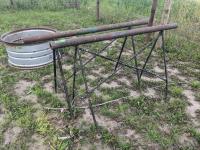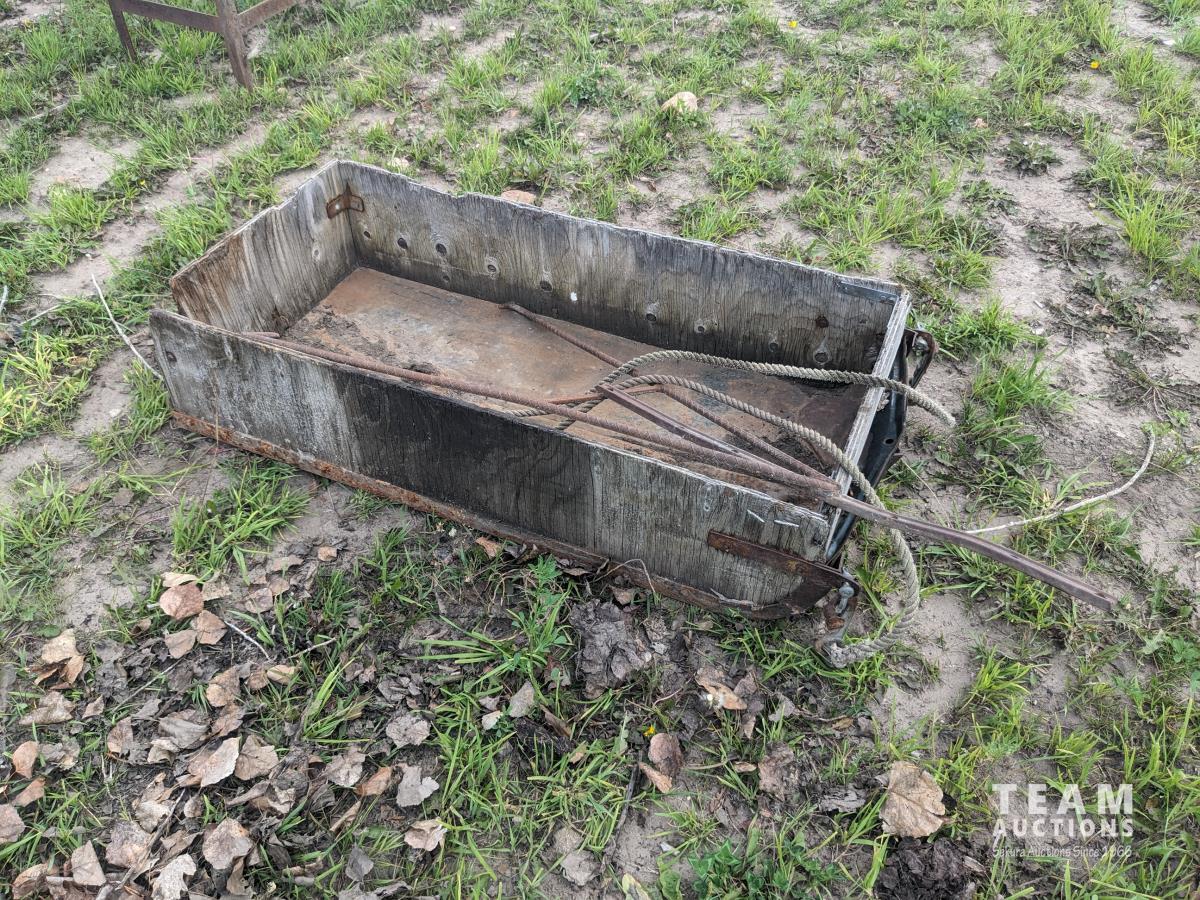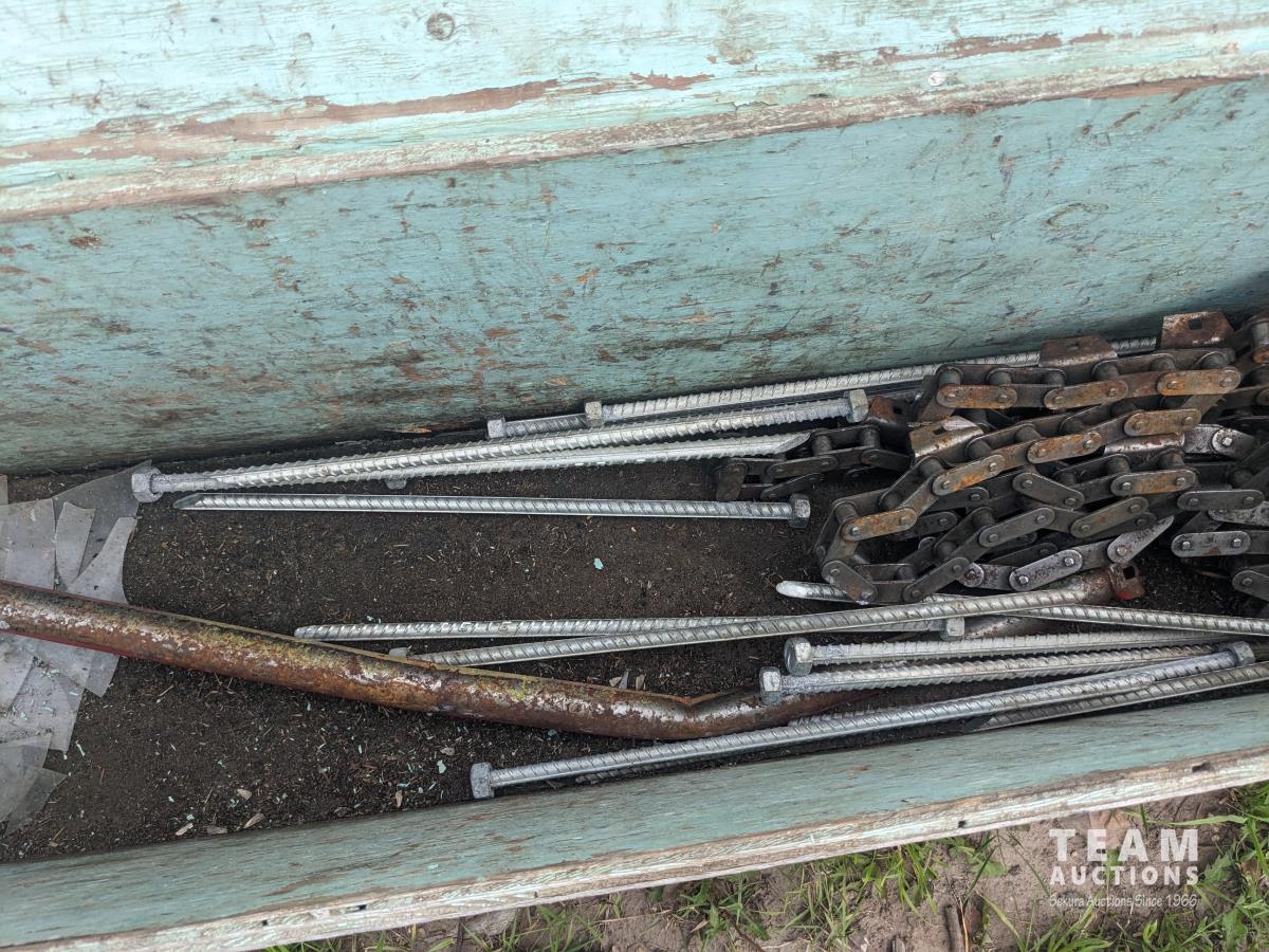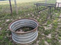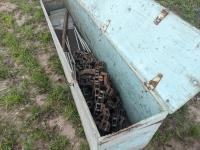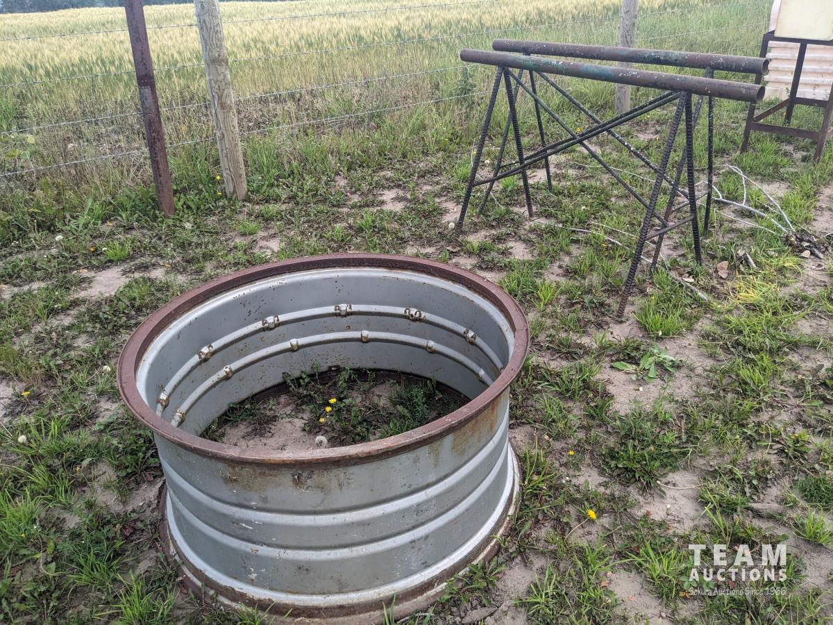 94 inch wood box containing roller chain and metal pegs, poly tank with steel stand, (2) metal saw horses, 38 inch diameter rim