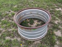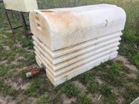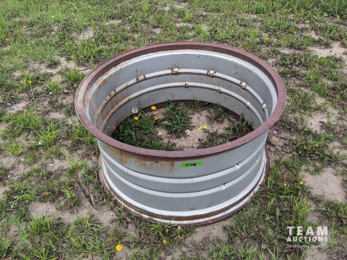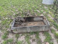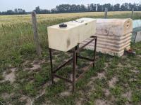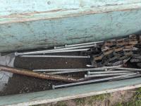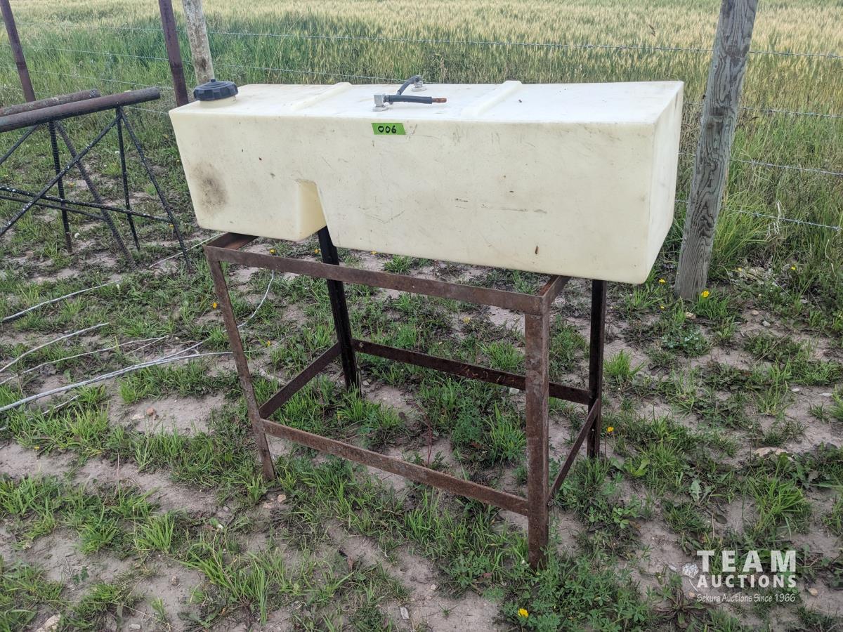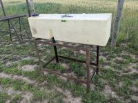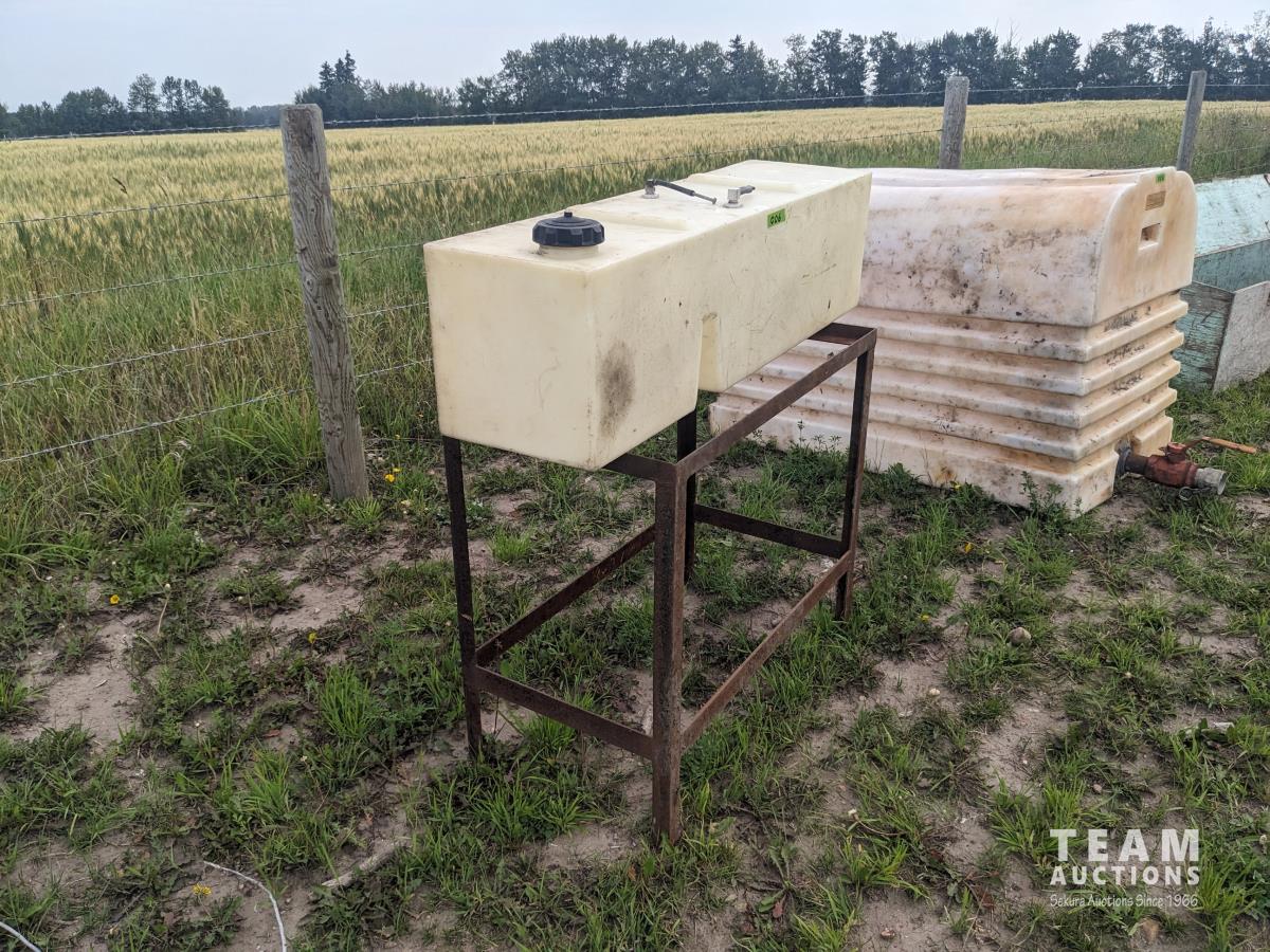 94 inch wood box containing roller chain and metal pegs, poly tank with steel stand, (2) metal saw horses, 38 inch diameter rim