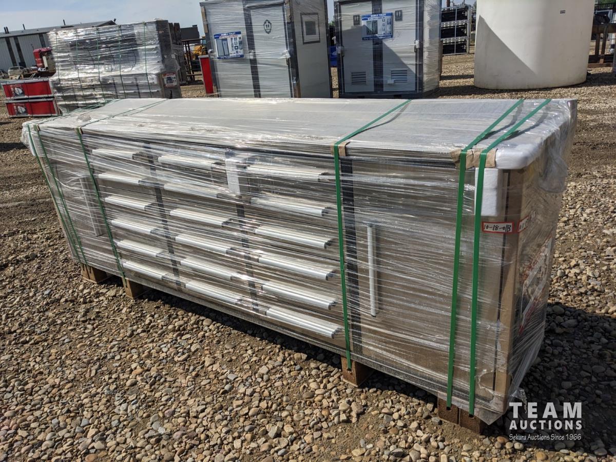 854 Steelman 10 Ft Work Bench with 18 Drawers and 2 Cabinets (Unused)