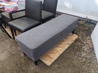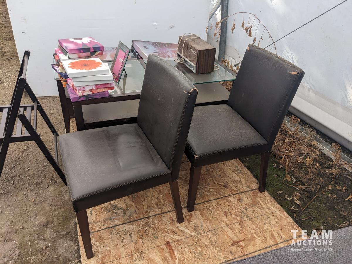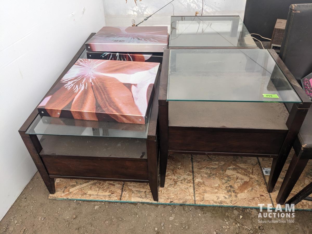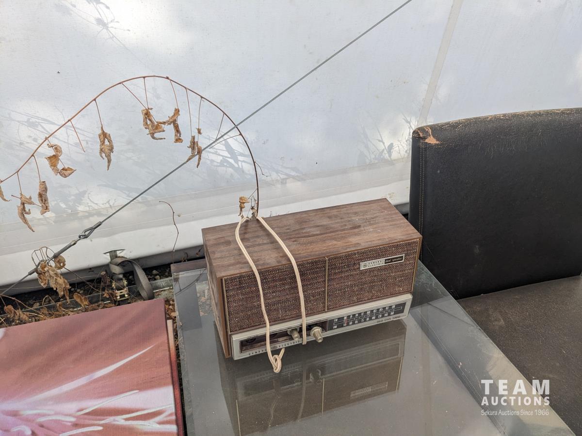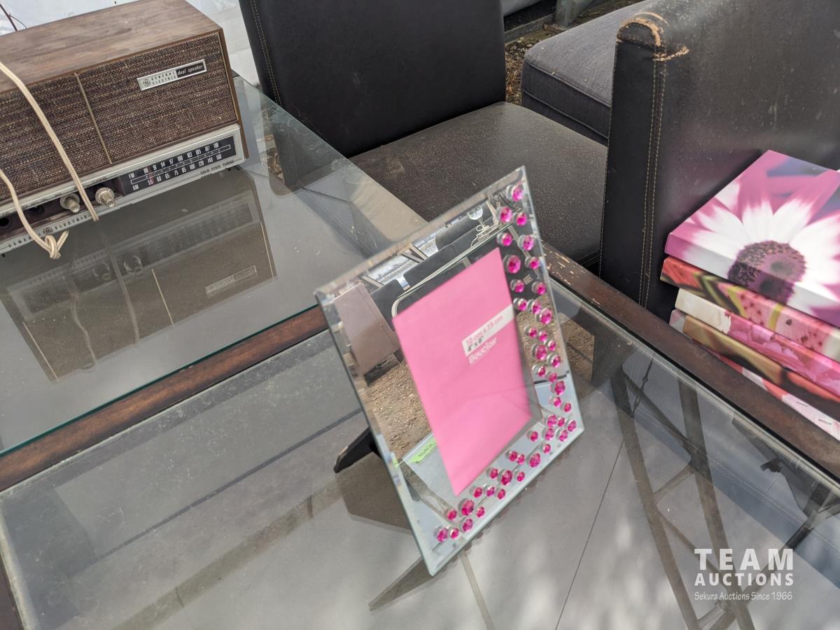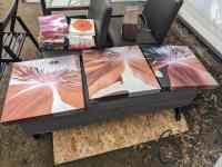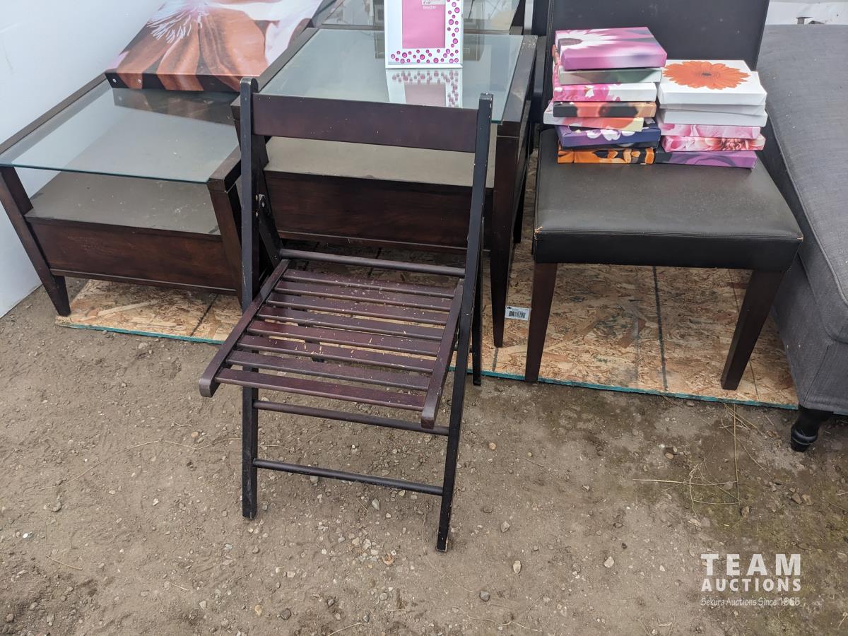 (2) chairs, folding chair, (2) side tables, 24 inch wide X 20 inch deep X 24 inch high, (1) side table 64 inch wide X 24 inch deep X 19 inch high, ottoman, qty of pictures, picture frame and radio