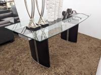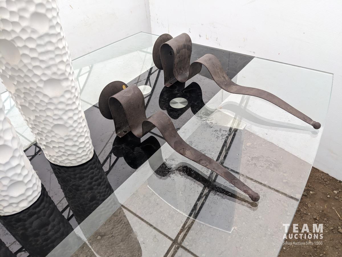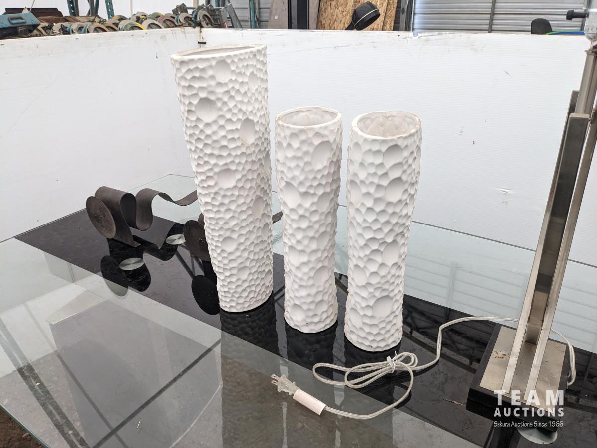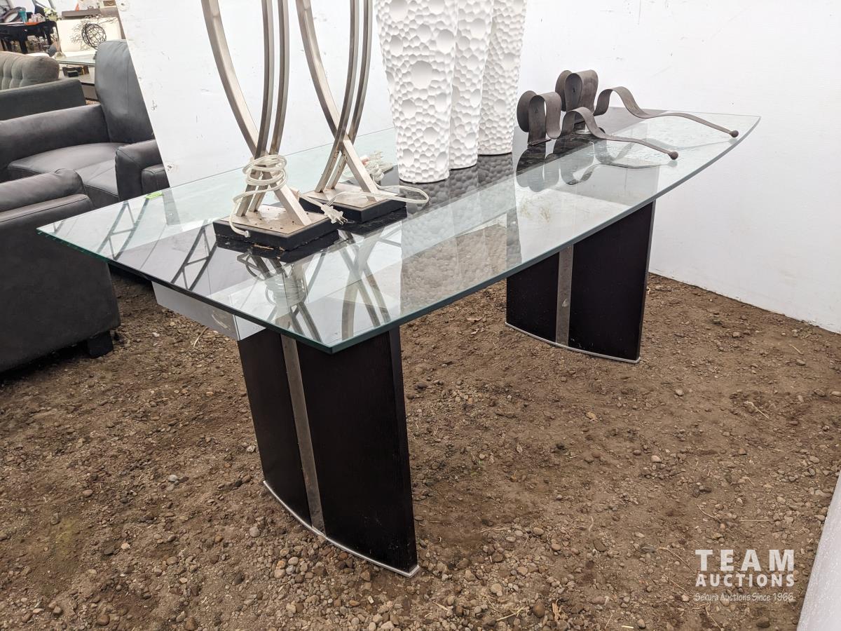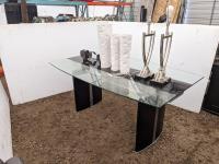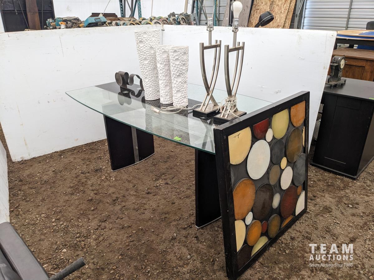 Glass top table 67 inch long X 39.5 inch wide X 30 inch high, framed picture, (2) table lamps, (3) vases, (2) candle holders