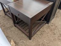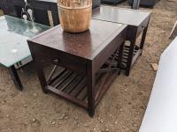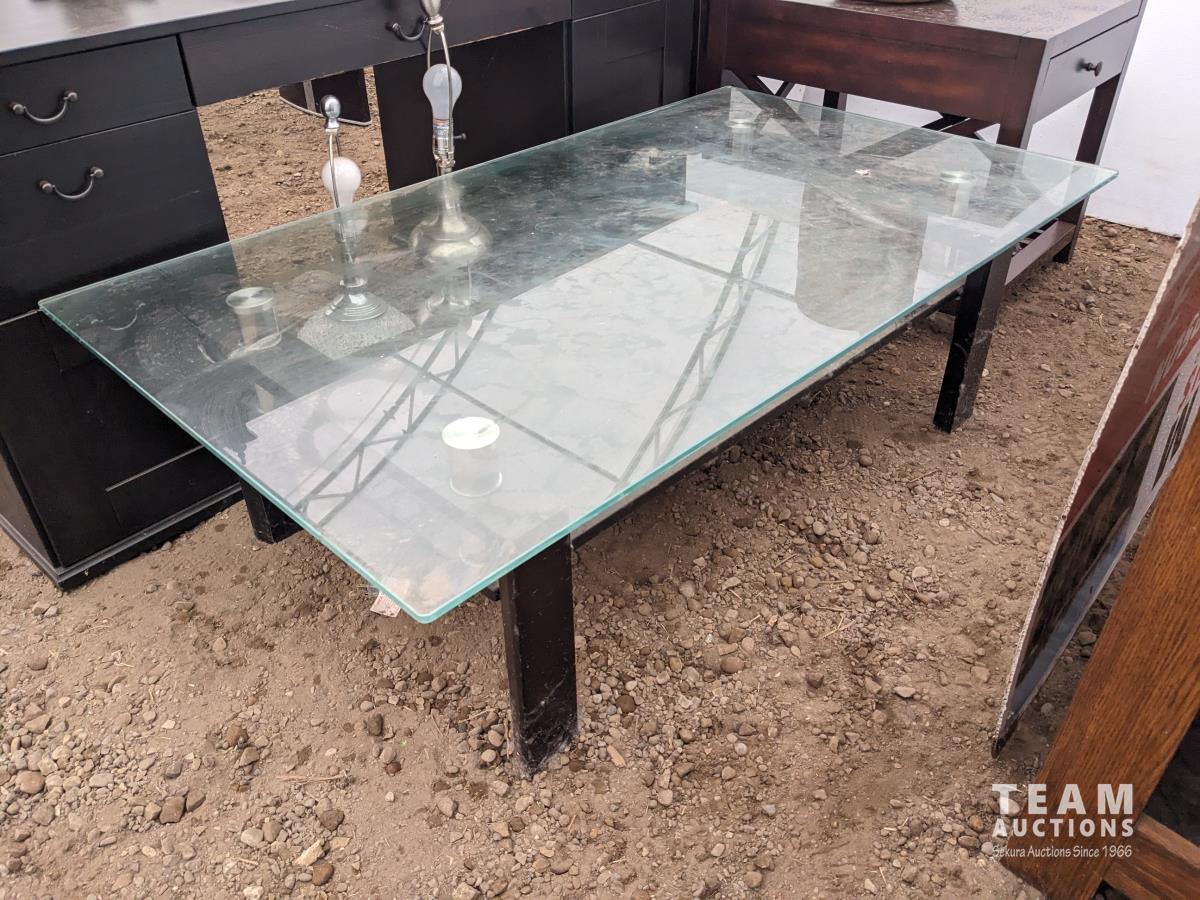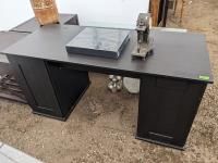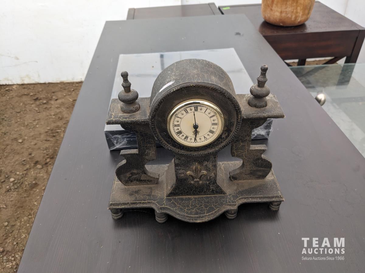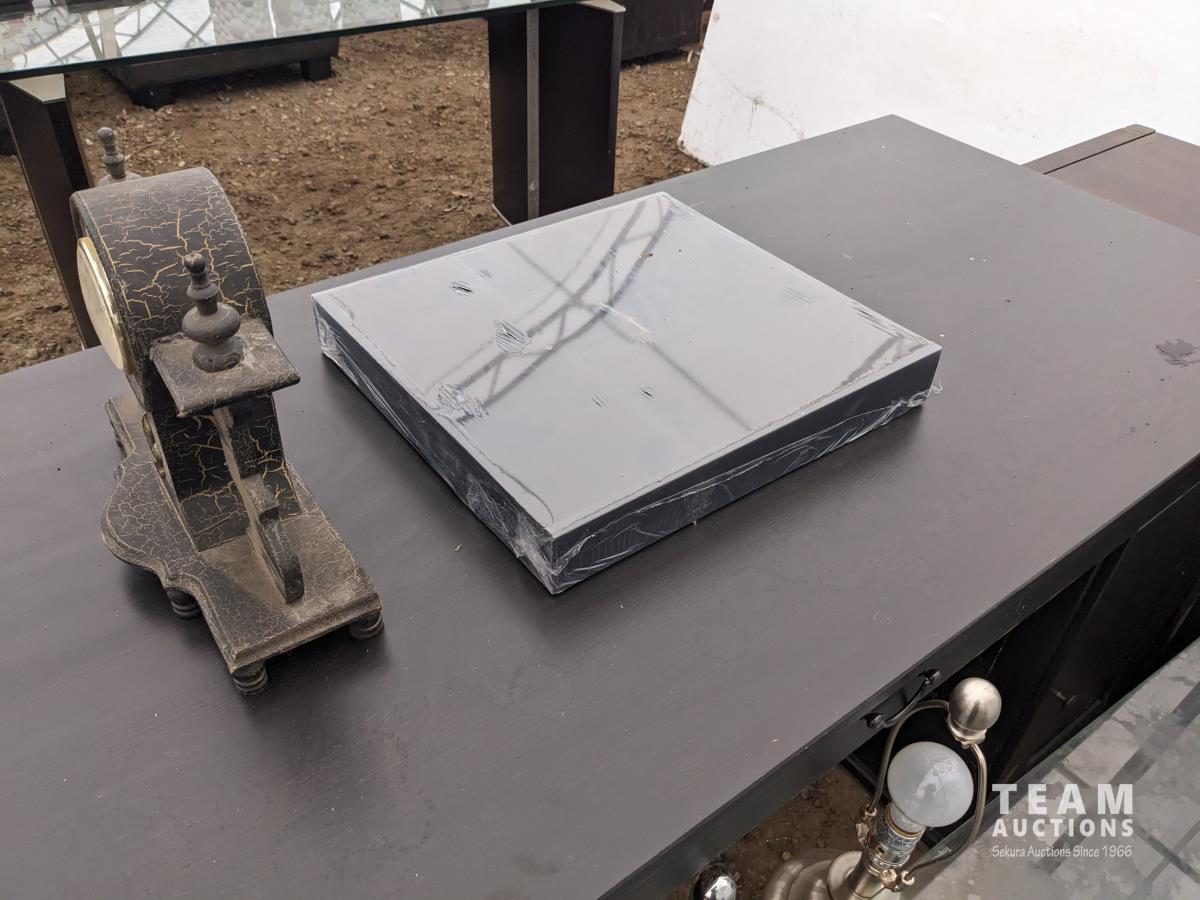 Desk 60 inch wide X 26 inch deep X 29 inch high, table 55 inch long X 31.5 inch wide X 17 inch high, clock, (2) table lamps, plant pot