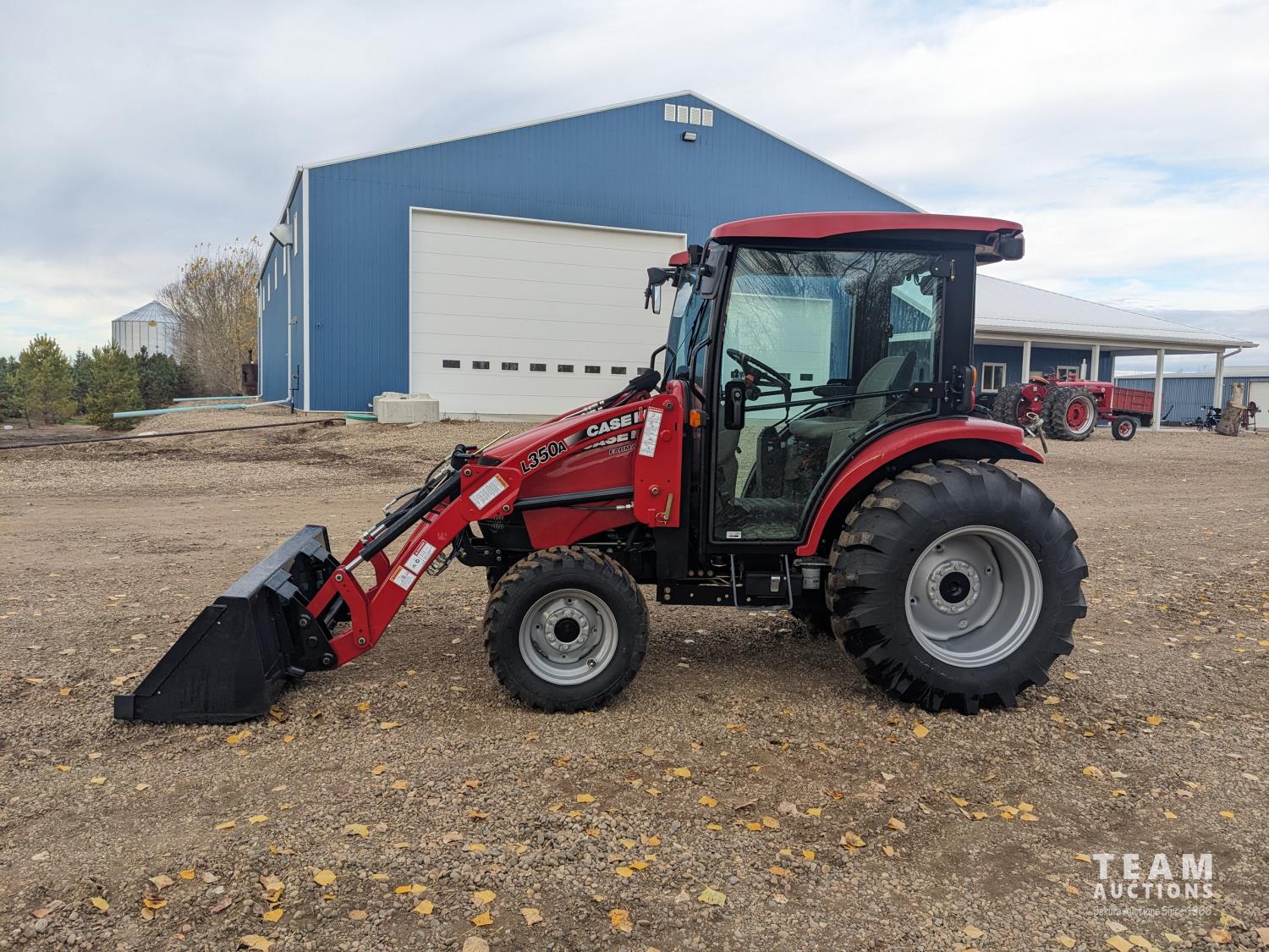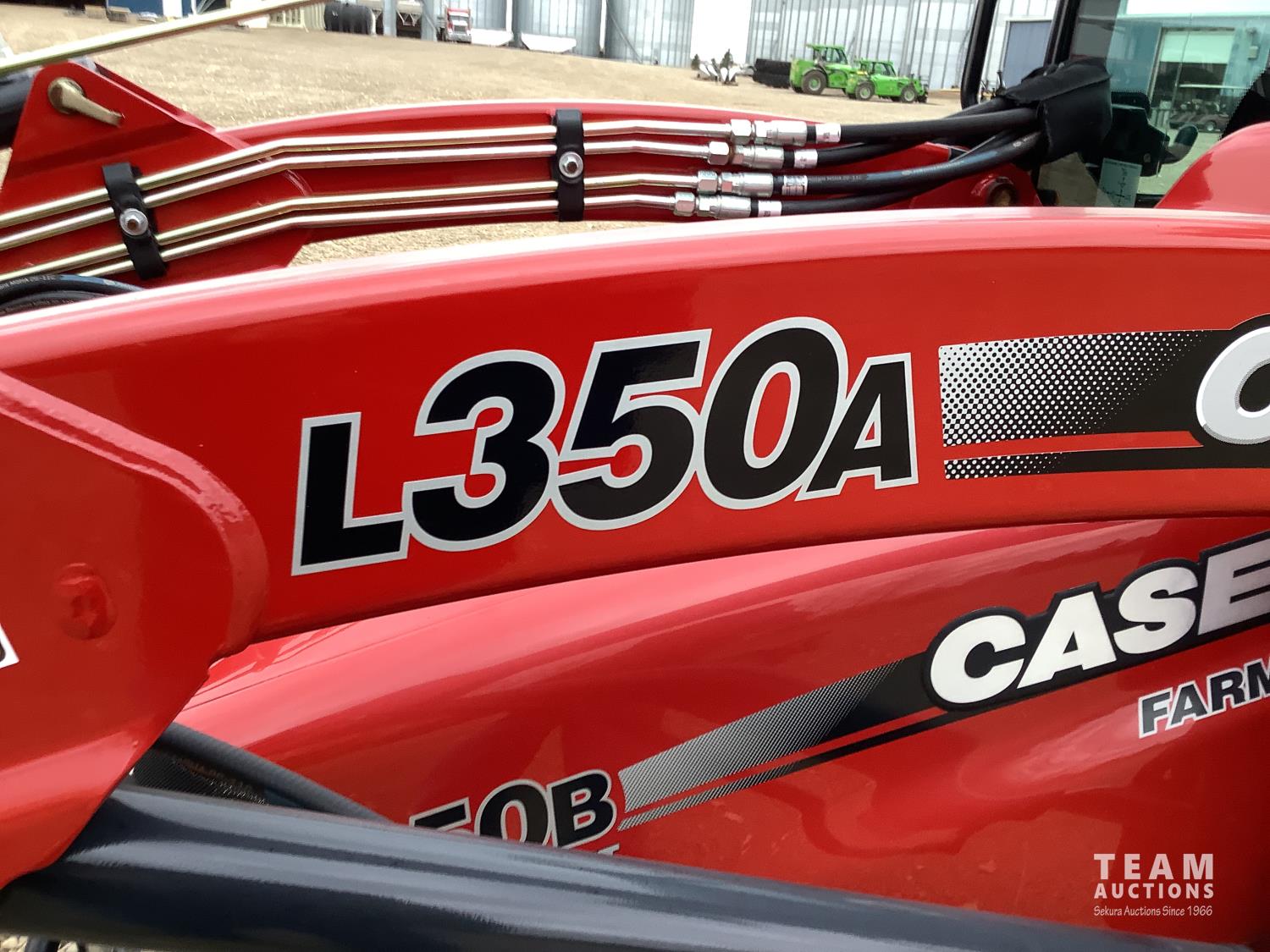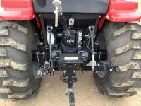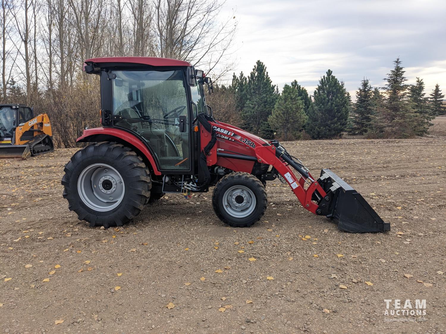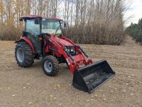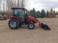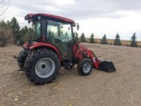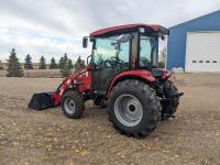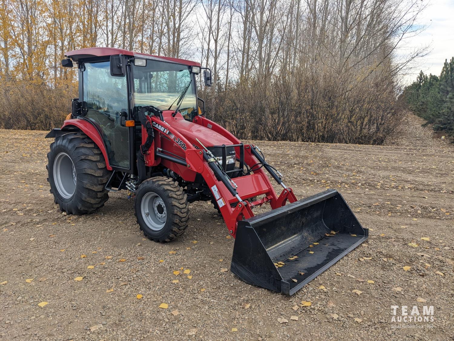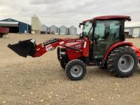 Case IH L350A loader, Q/A, bucket, mid mount hydraulic connection, Mitsubishi S4QL 2.5 L 4 cylinder diesel engine, CVT transmission, cab, left hand reverser, joystick, A/C, upgraded stereo, grill guard, 540 PTO, 3 point hitch, 2 rear hydraulic outlets, 10-16.5 front tires, 17.5-24 rear tires