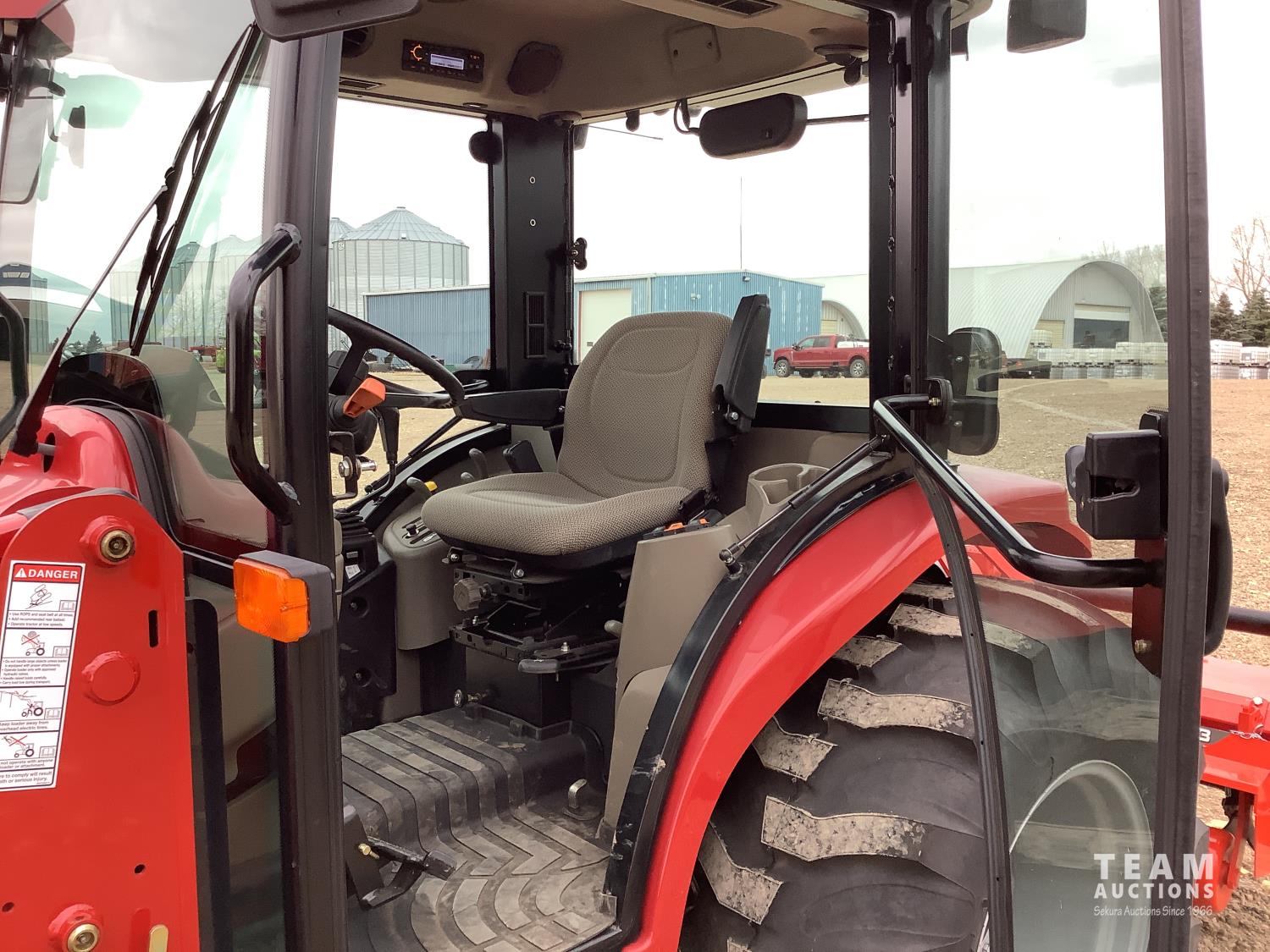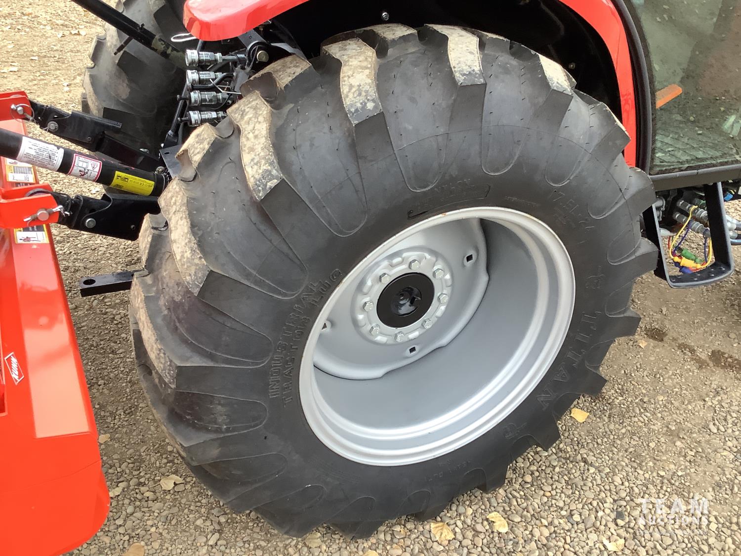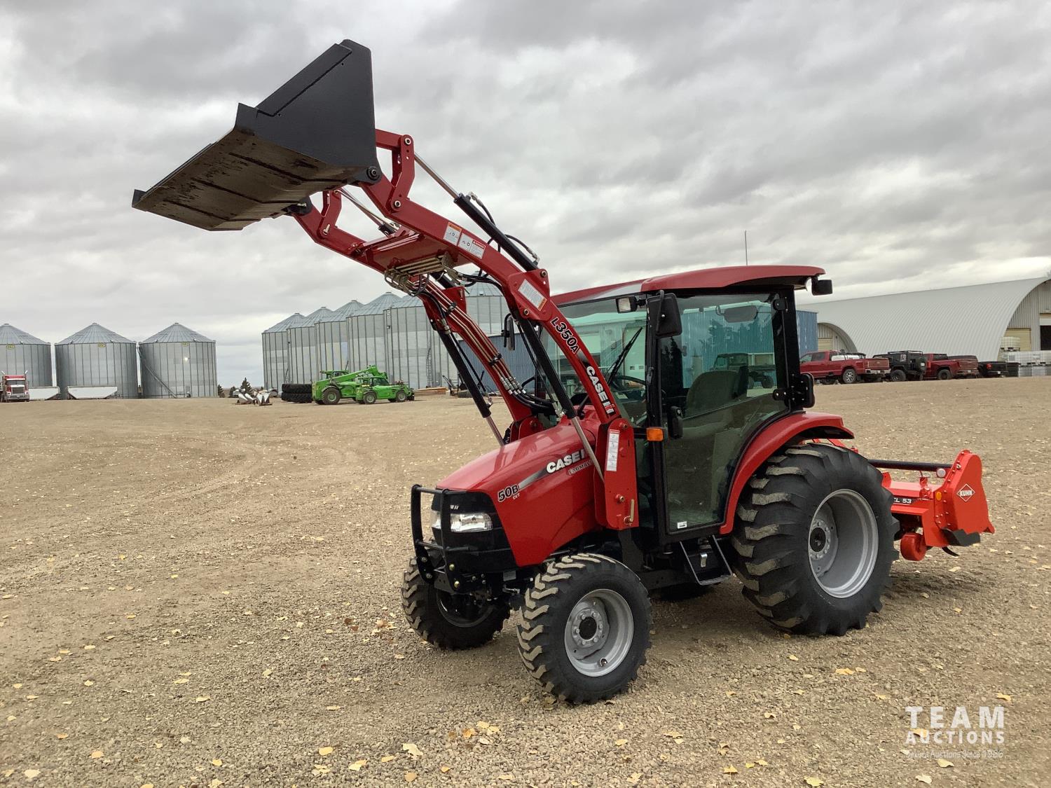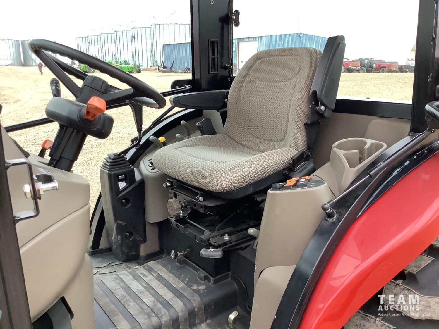 Case IH L350A loader, Q/A, bucket, mid mount hydraulic connection, Mitsubishi S4QL 2.5 L 4 cylinder diesel engine, CVT transmission, cab, left hand reverser, joystick, A/C, upgraded stereo, grill guard, 540 PTO, 3 point hitch, 2 rear hydraulic outlets, 10-16.5 front tires, 17.5-24 rear tires