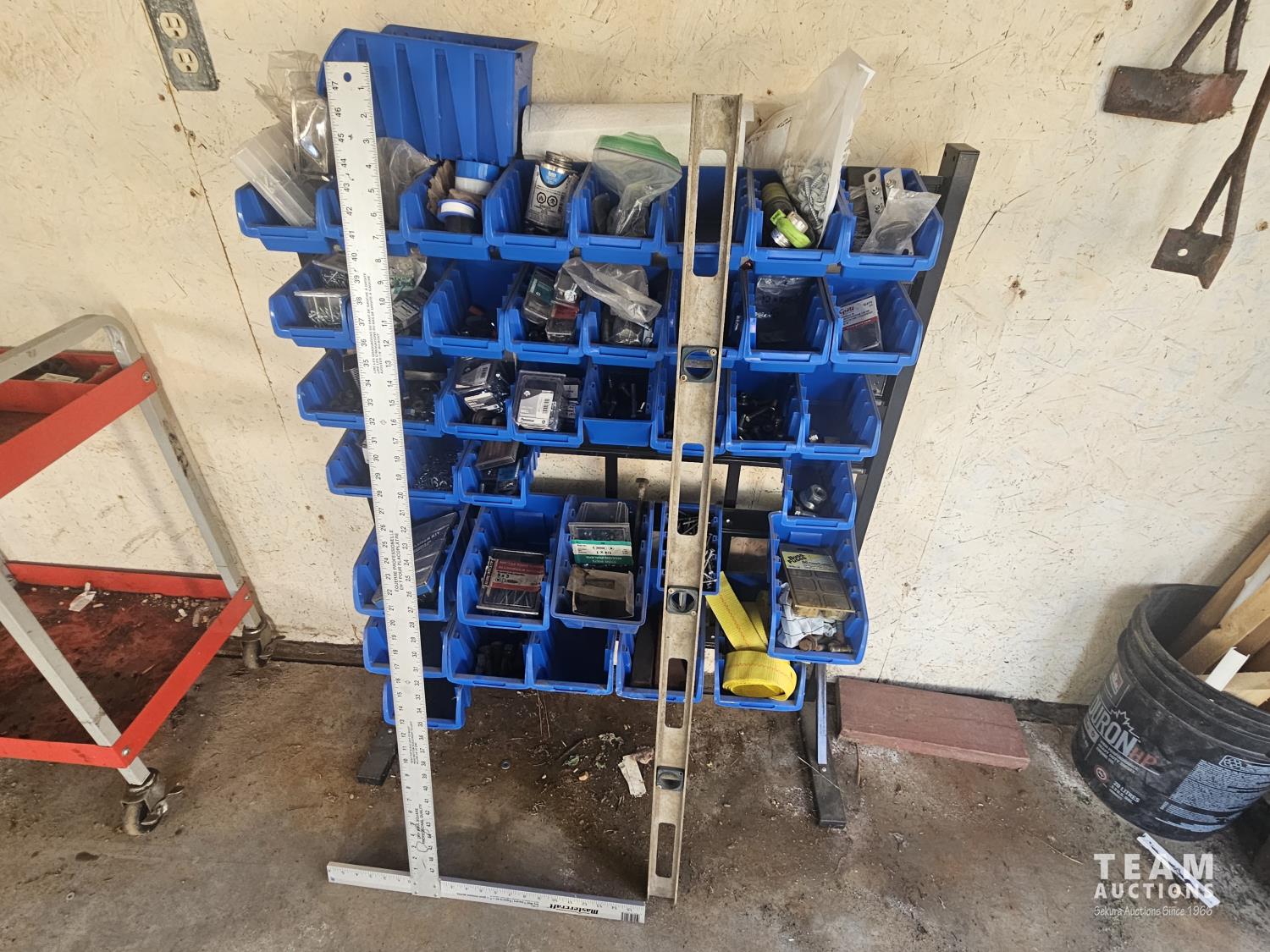 17 Bolt Bin with Misc Supplies, Measure Stick and Leveler