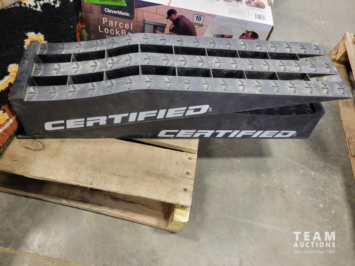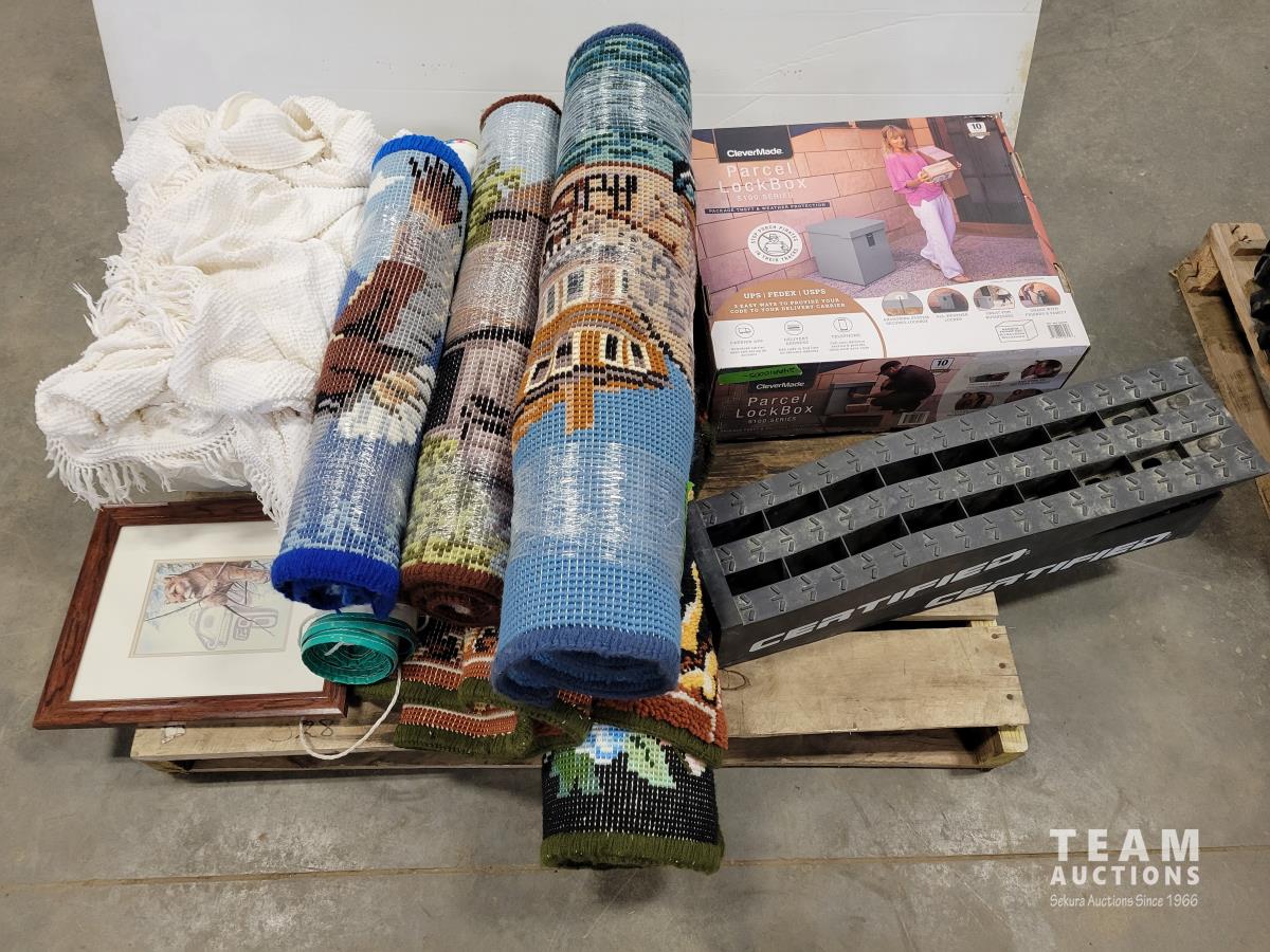 Clevermade parcel lock box, car ramps, qty of rugs, glassware, Hendrick Motorsports banner